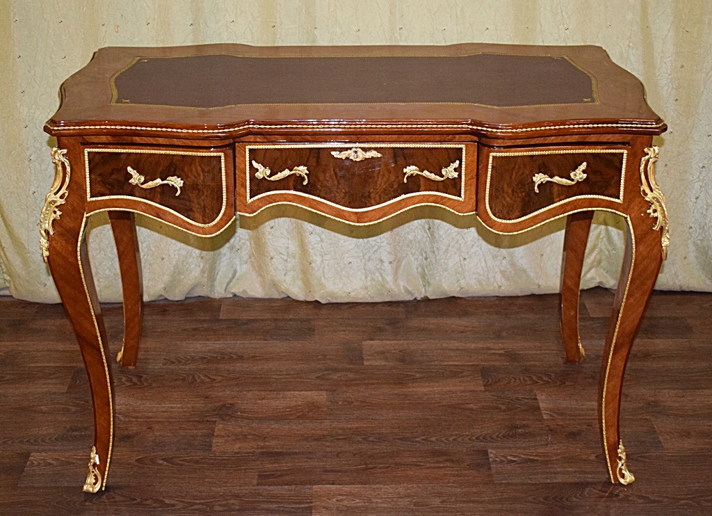 Современный письменный стол в стиле Ludwik. Полностью изготовлен из темного ореха, сверху обшит коричневой эко-кожей. Имеет три выдвижных ящика, дополнительно украшен декором и полностью латунными ручками. Мелко изогнутые ножки добавляют легкости и оригинальности. Стол очень привлекательный и, безусловно, повысит престиж любого рабочего места.