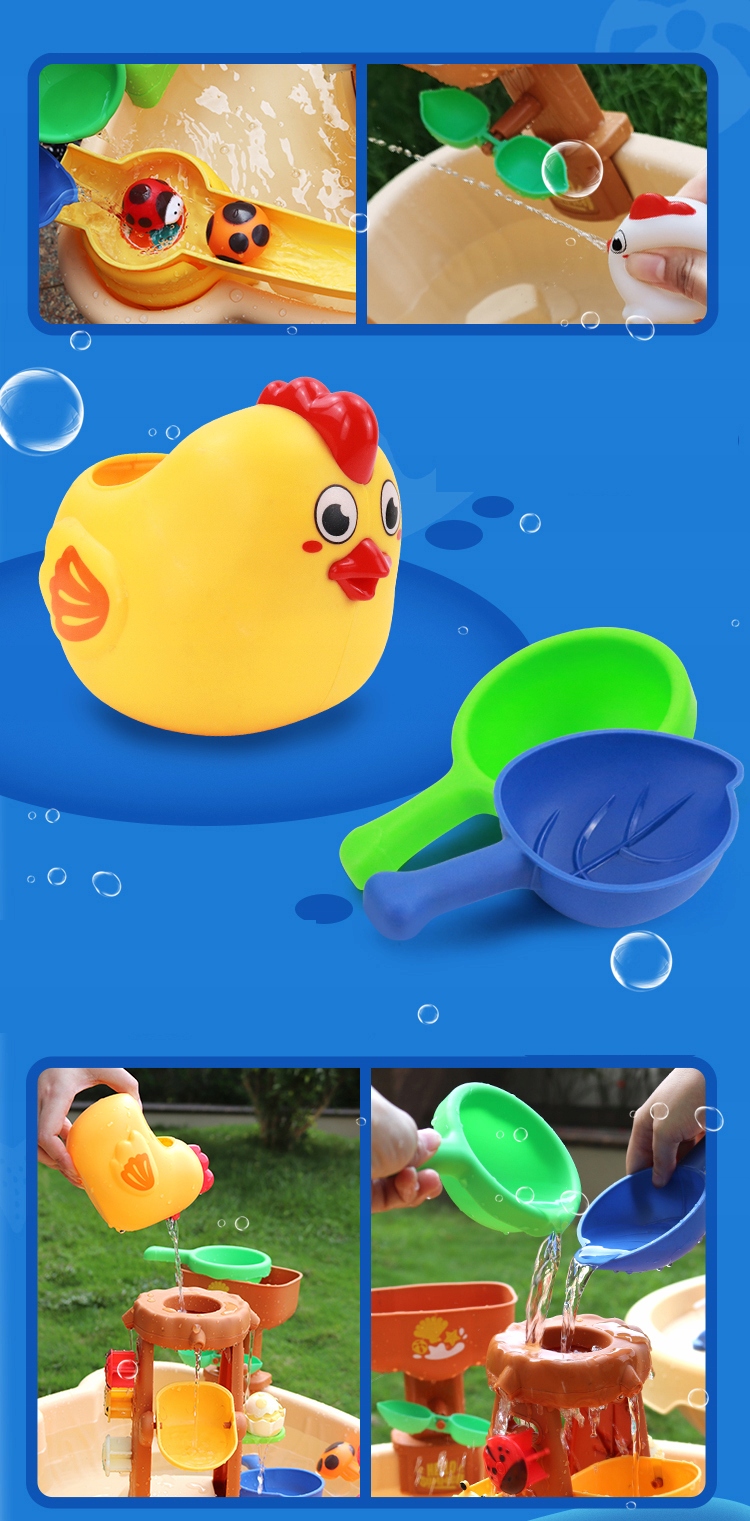 - вращающиеся животные на столе - это не только симпатичные декоративные элементы, но и способ побудить детей взаимодействовать. Когда вода стекает вниз по ними, малыши могут наблюдать, как они движутся под влиянием потока.