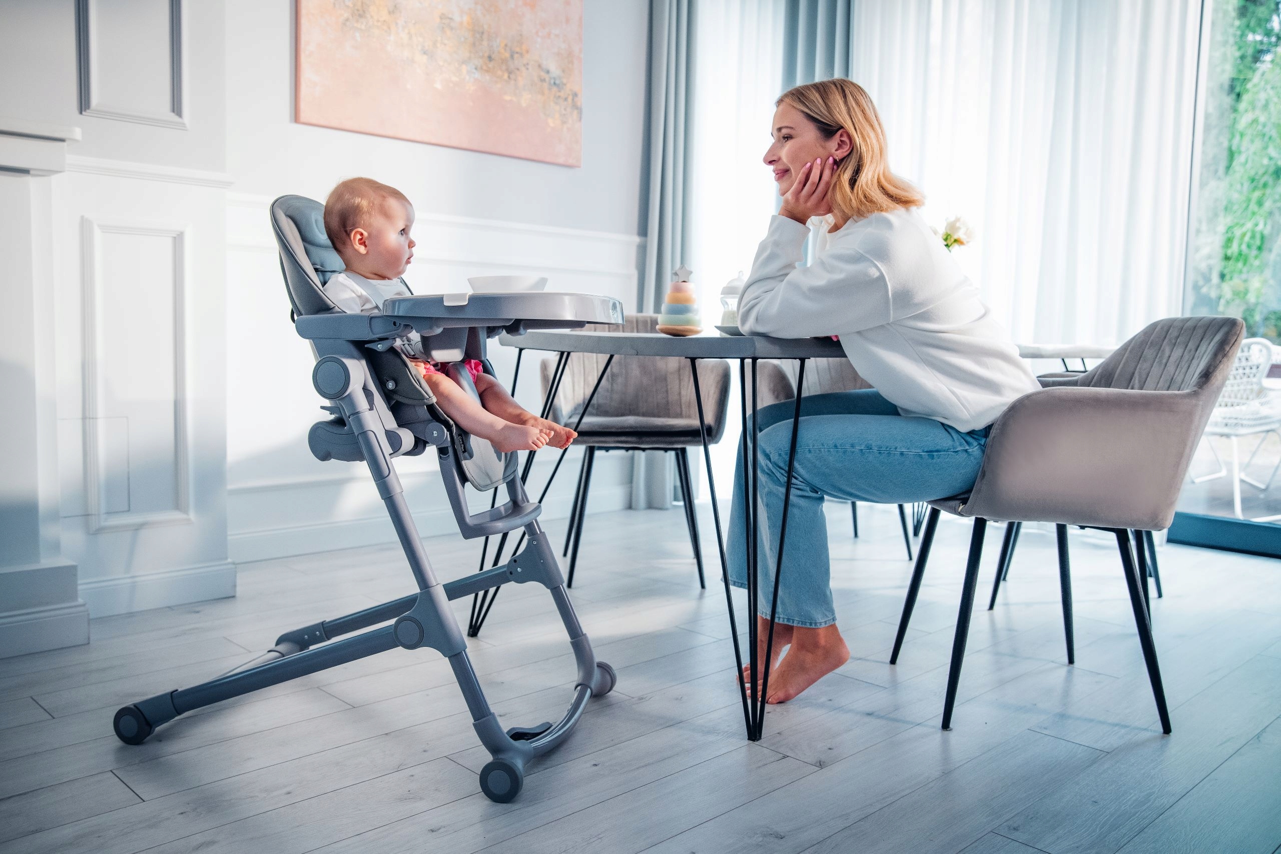 Регулируемый поднос — можно перемещать поднос подальше или ближе к ребенку, в зависимости от ваших потребностей.
