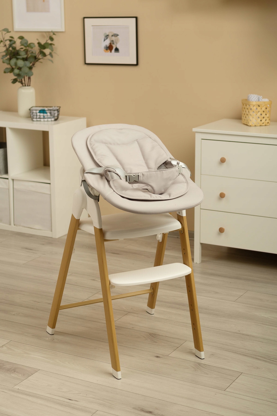 Продукт предназначен для детей от 6 месяцев до примерно 3-4 лет с максимальной массой тела 15 кг. В комплект входит специальный чехол, благодаря которому стульчик трансформируется в высокий лежак для самых маленьких. Кресло также оснащено дополнительной вставкой и подносом для детей более старшего возраста, обеспечивающими устойчивое и безопасное положение в кресле. Регулируемая подставка для ног обеспечит правильное положение ребенка в сидении.