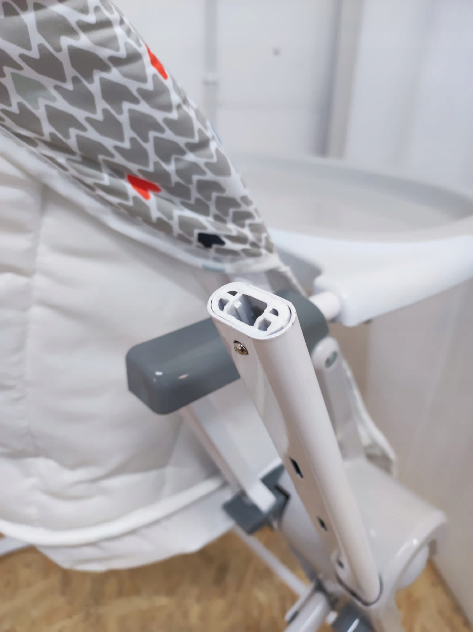 Стул компактно складывается, поэтому занимает до 2 раз меньше места, чем традиционные кресла. Вставку для лотка можно легко снять, а мягкие ткани можно стирать в машине при 30°C.