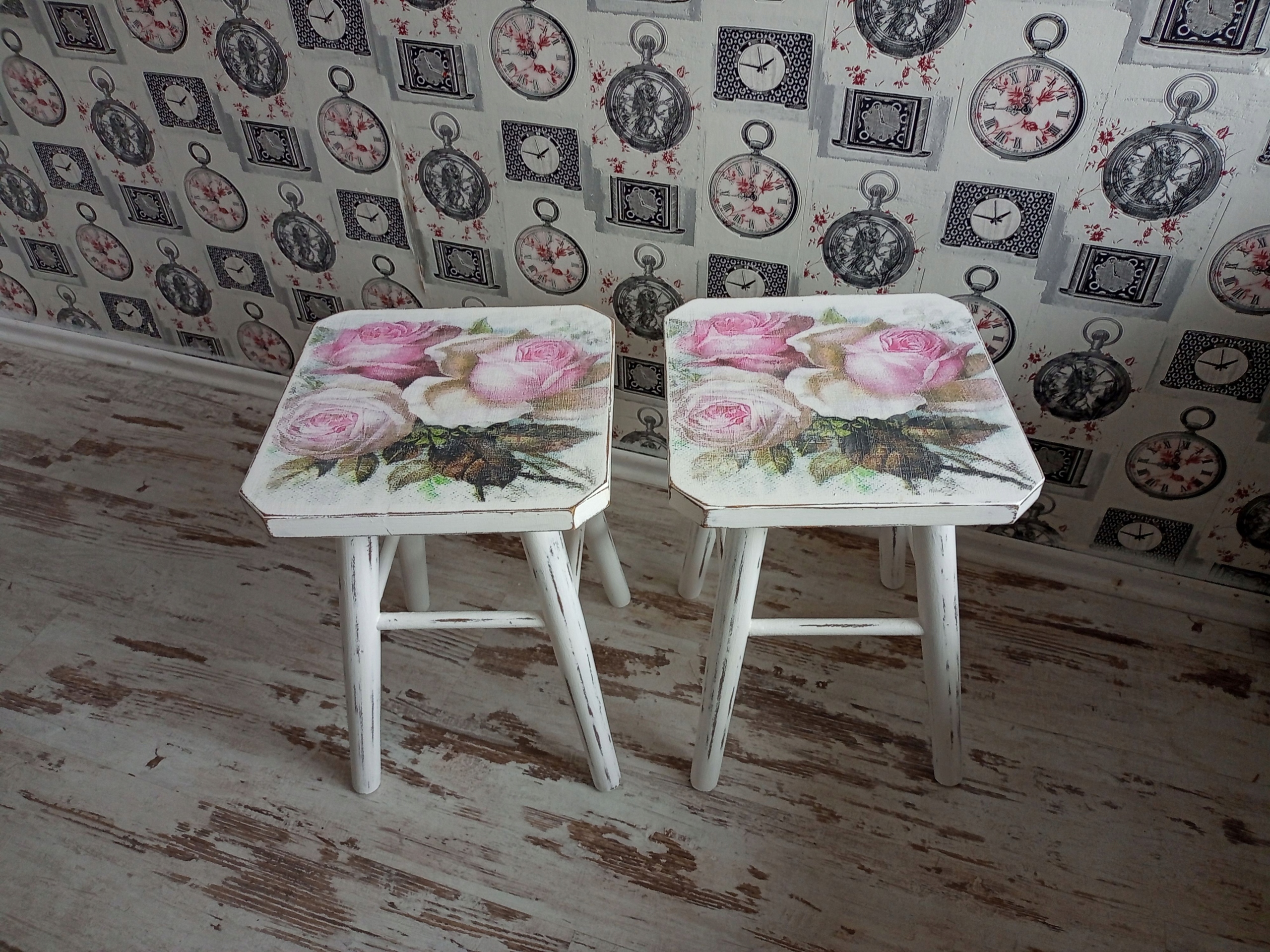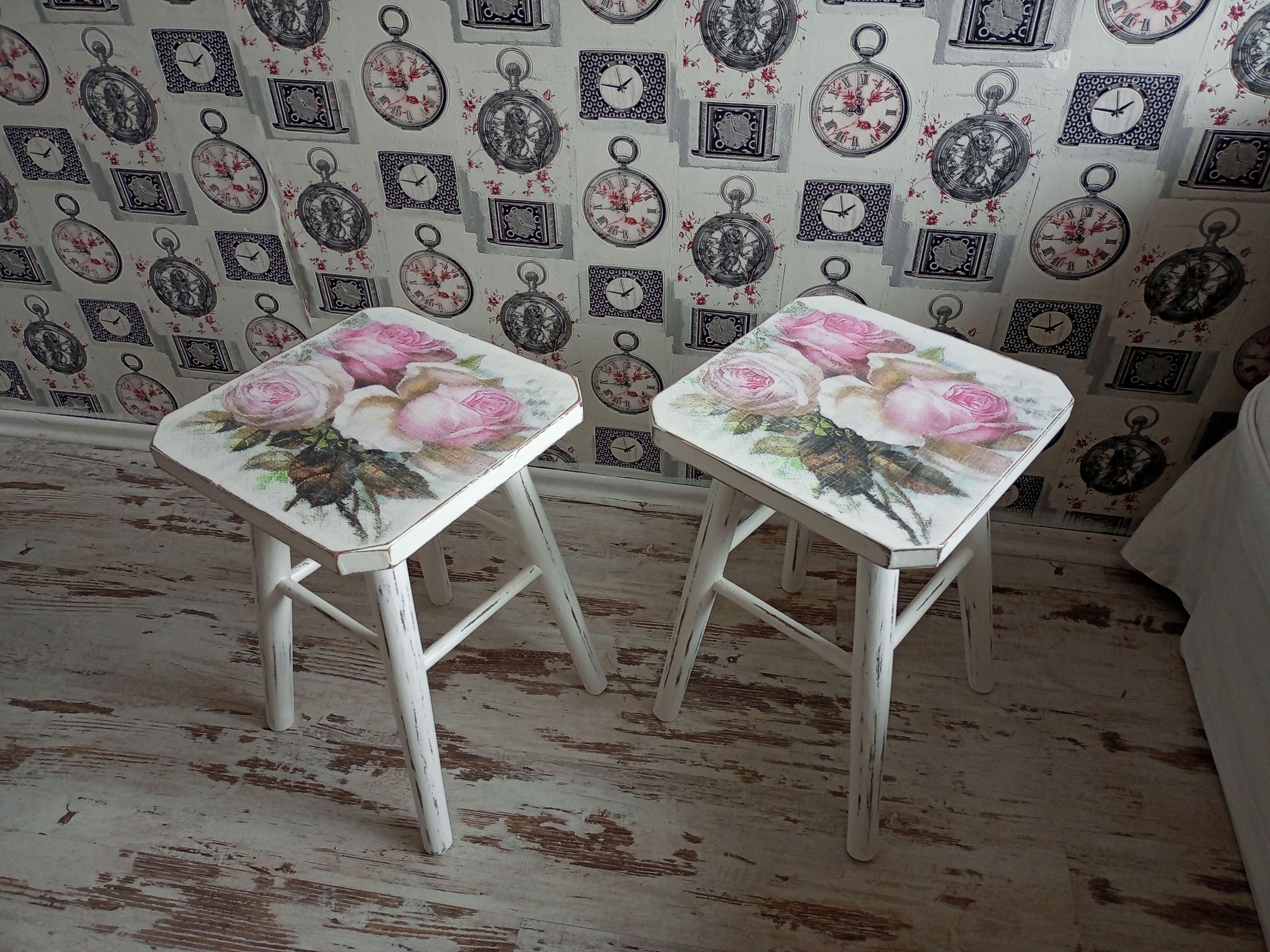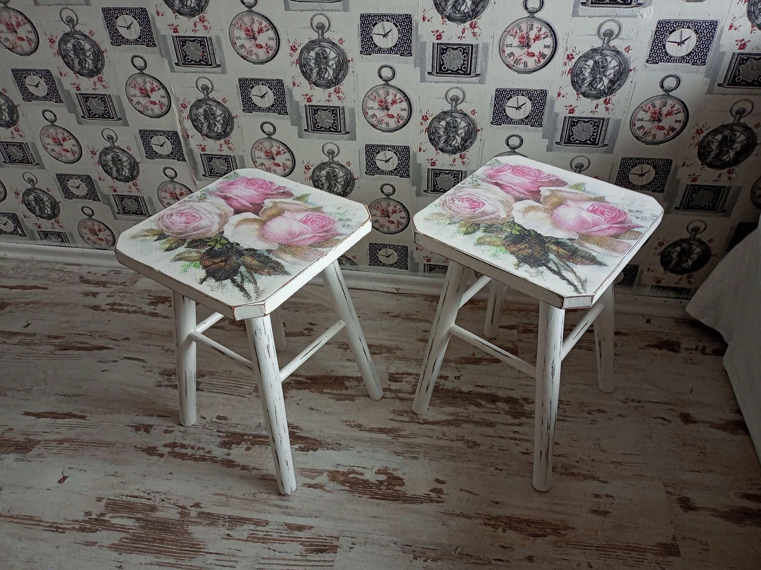 Деревянные табуретки (столы) в стиле потертого шика.