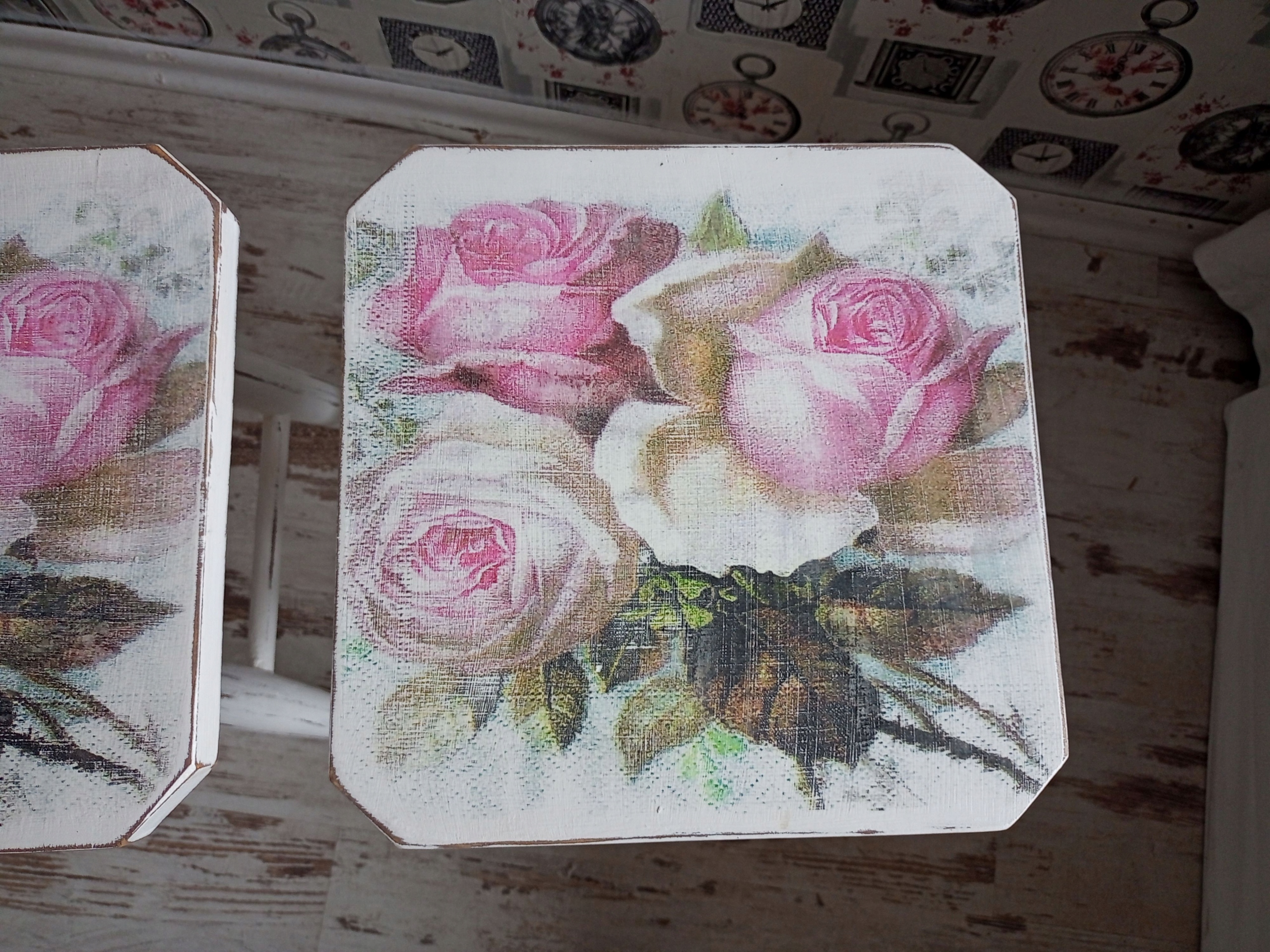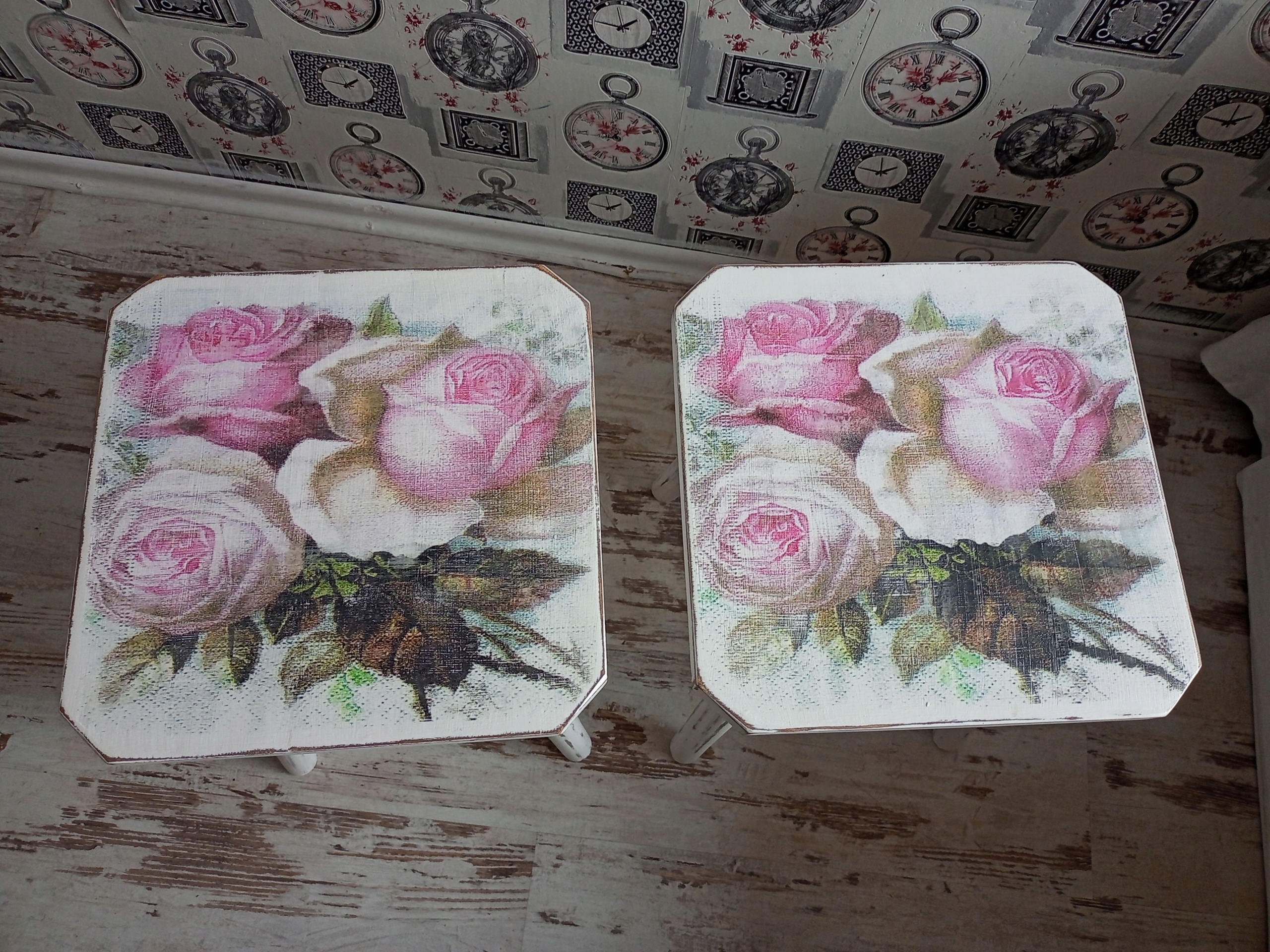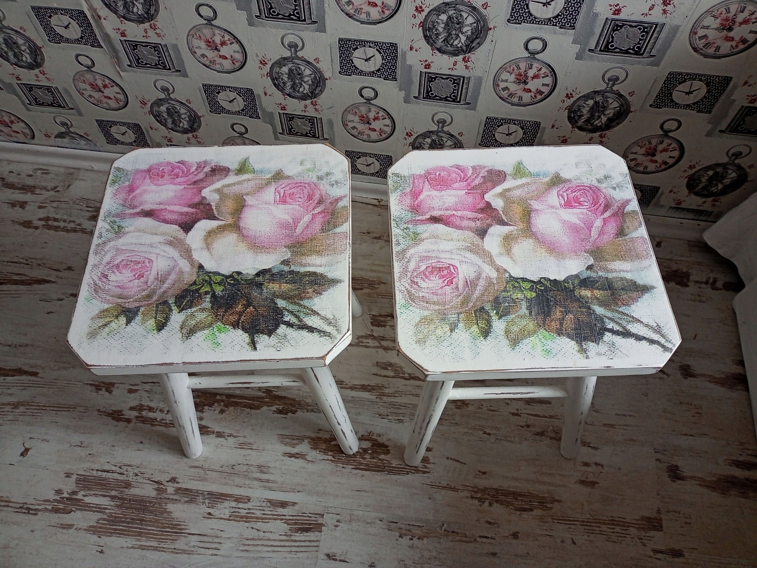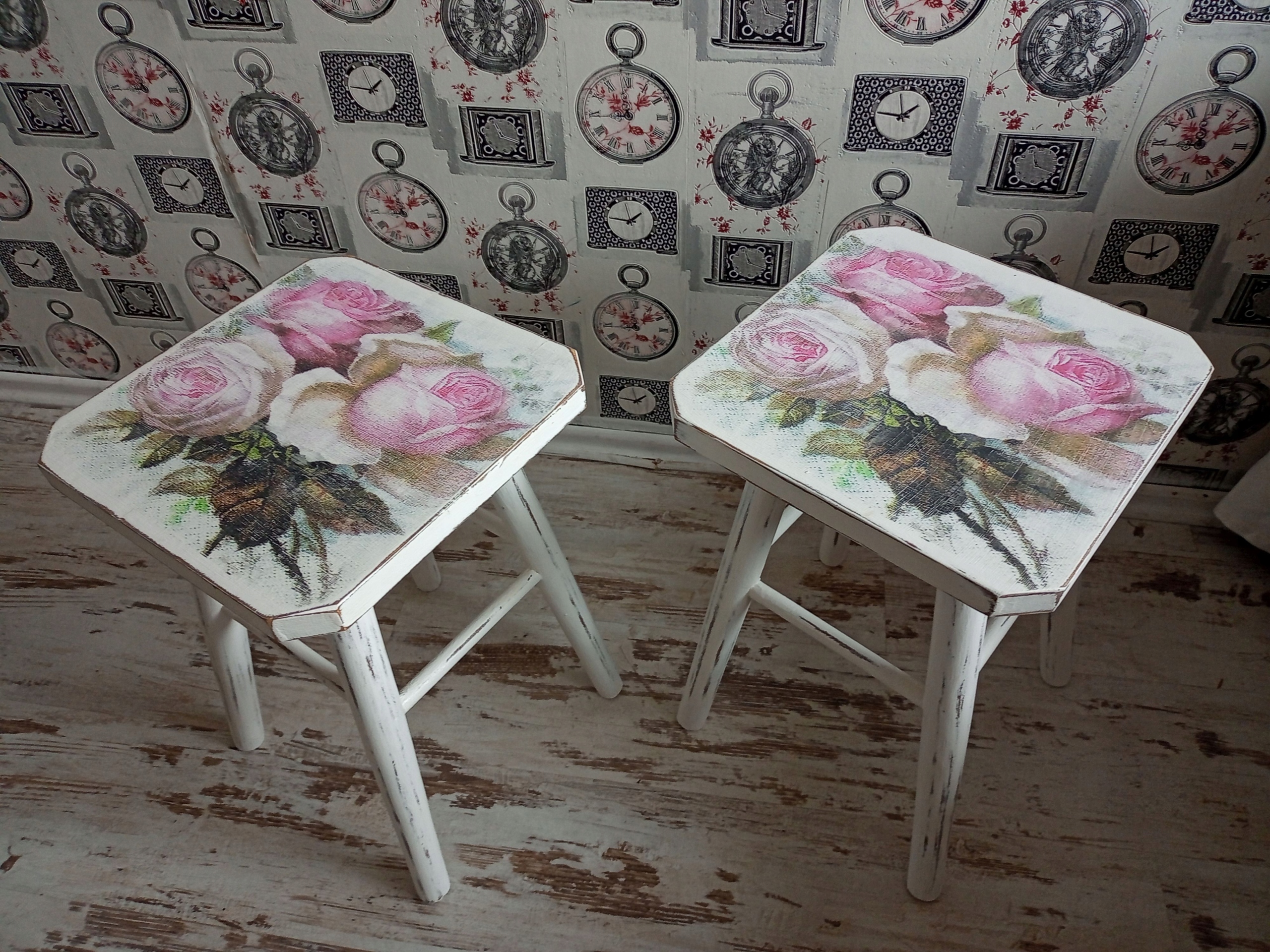 Деревянные табуретки (столы) в стиле потертого шика.