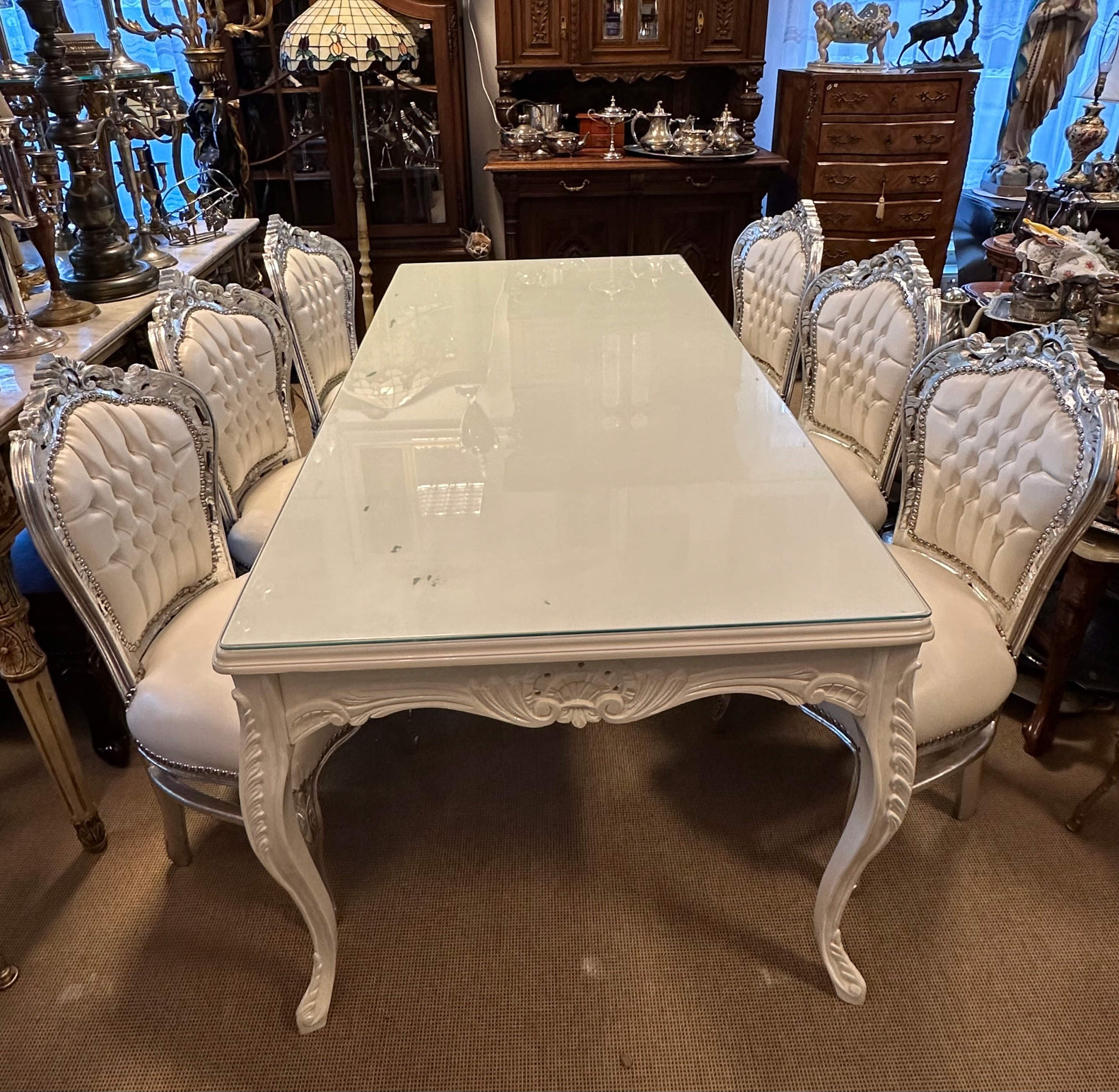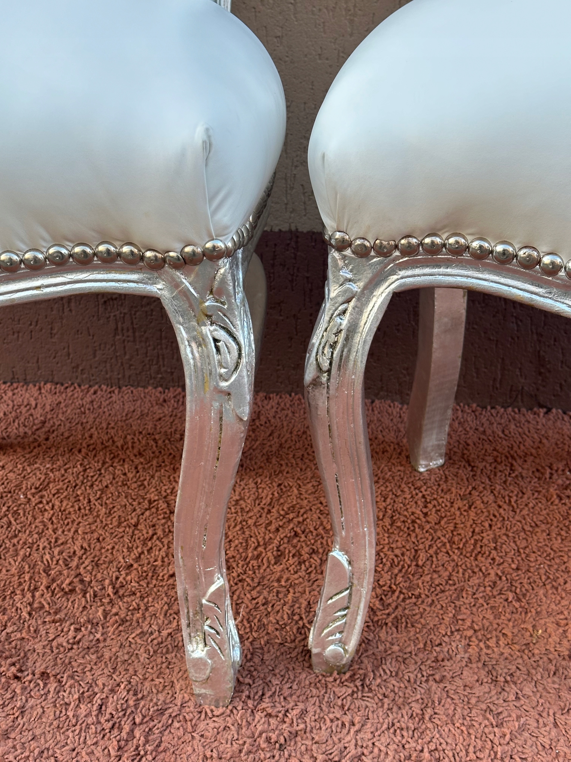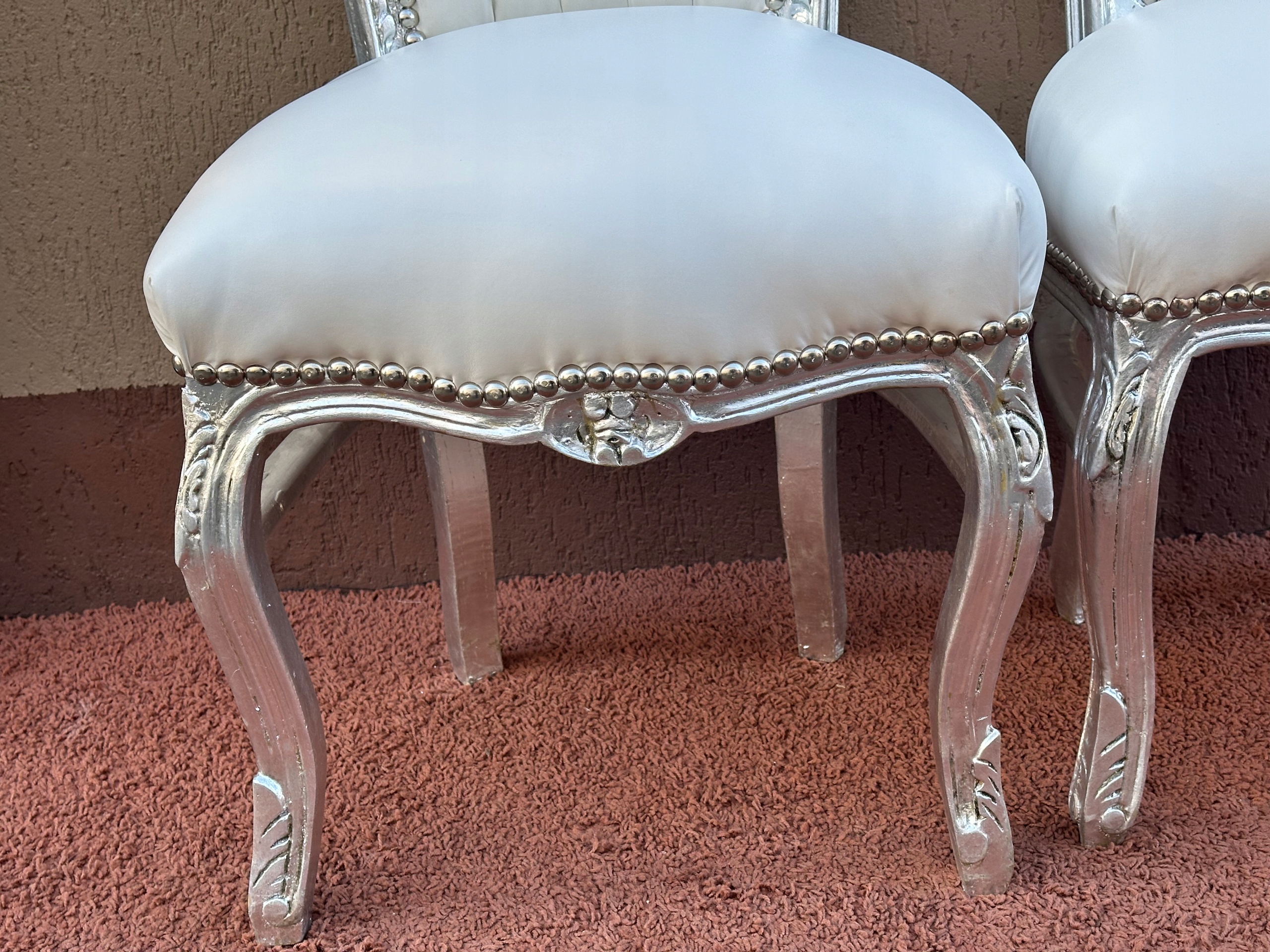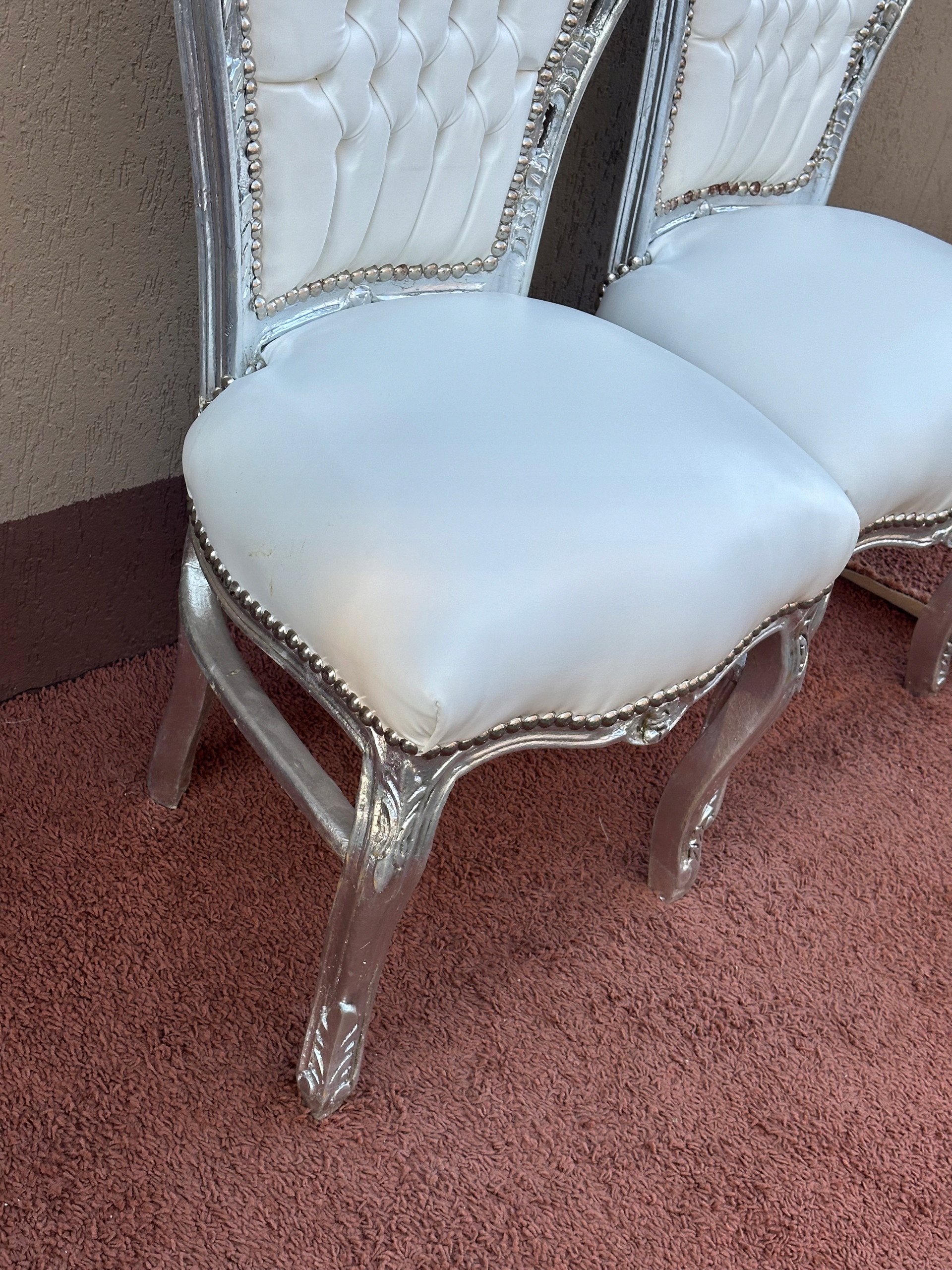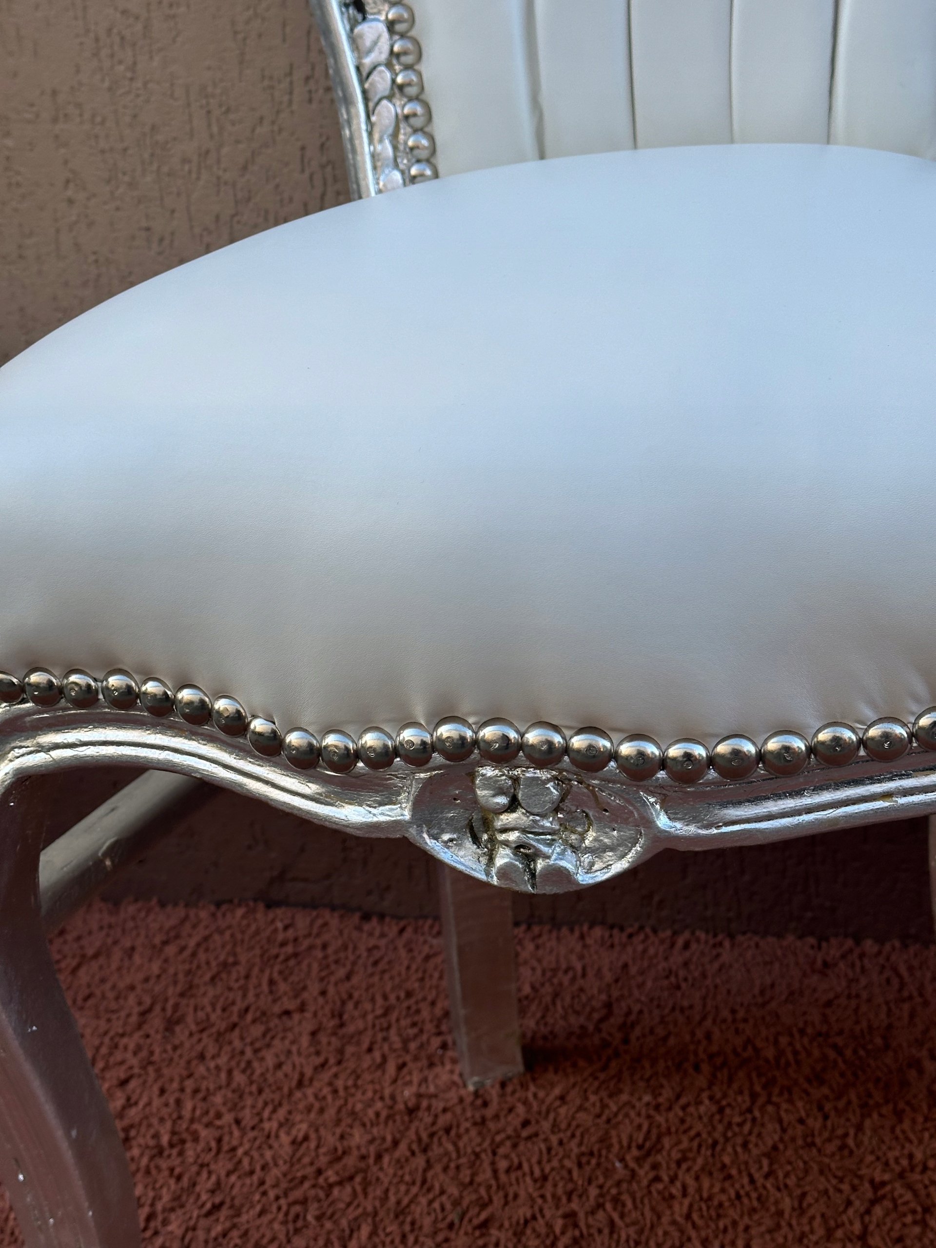 СТУЛЬЯС БЕЛОЙ ОБИВКОЙ ЭКО-КОЖИ И РЕЗНЫМИ ДЕРЕВЯННЫМИ КОРОНАМИ ЦВЕТА СЕРЕБРО.