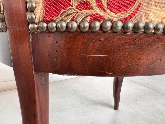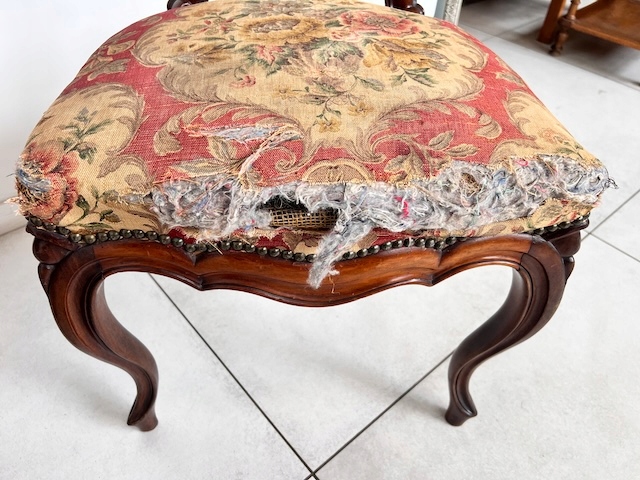Стулья под ремонт. Сиденья обтянуты тканью. Обивка всех стульев повреждена. На задних и боковых молдингах имеются следы от старых молотков. Это старые, неактивные следы. На одной из спинок имеются следы предыдущей склейки. Стулья устойчивы.