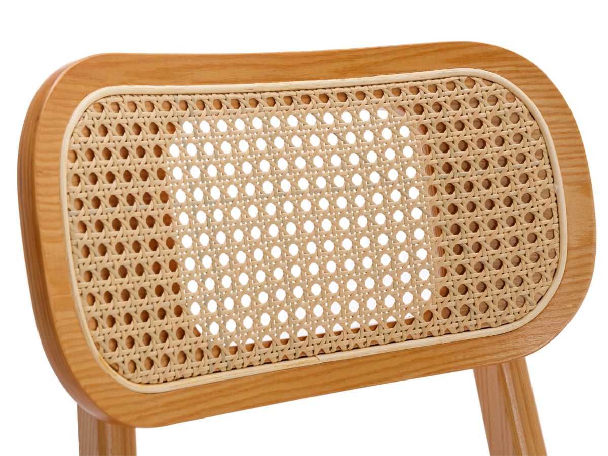 Пятный бар -стул имеет спинку ротана, которая идеально сочетается с деревянной рамой стула.