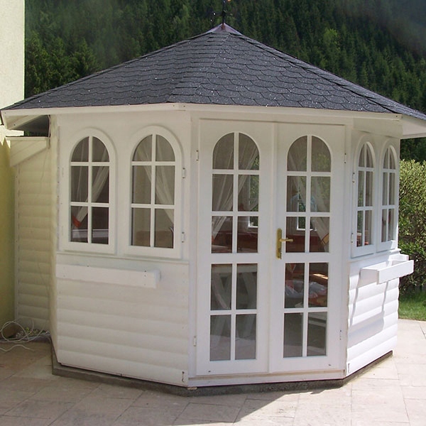 Эта оригинальная деревянная восьмиугольная садовая беседка – одна из самых престижных в нашем предложении. Необычные окна придают необыкновенный шарм и придают беседке оригинальный вид.