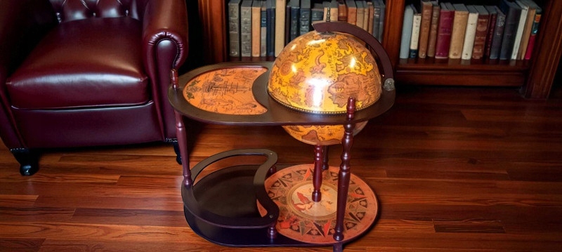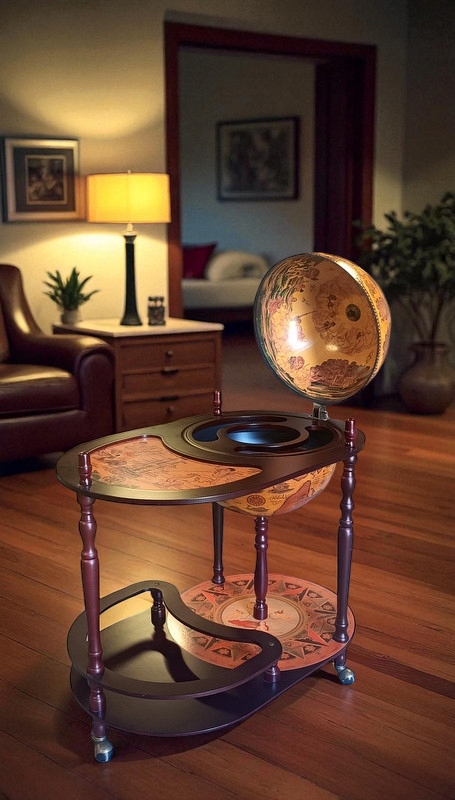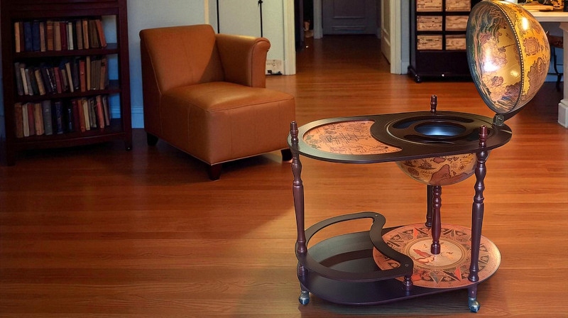 Стильный бар, который станет идеальной идеей подарка. Это очень практично и функционально. Внутри первого шара есть место для бутылок и очков. На нижней полке профилировала столкновения, чтобы они не двигались во время вождения. В баре есть вращающиеся колеса.