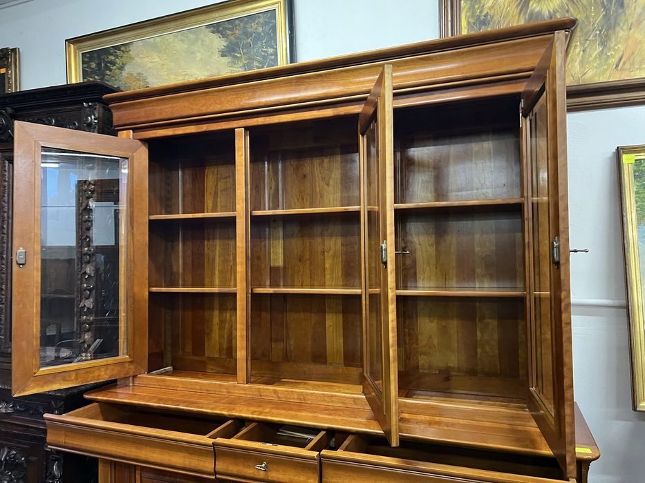 Верхняя часть со стеклянными дверцами и нижняя часть с ящиками и полками с дверцами.