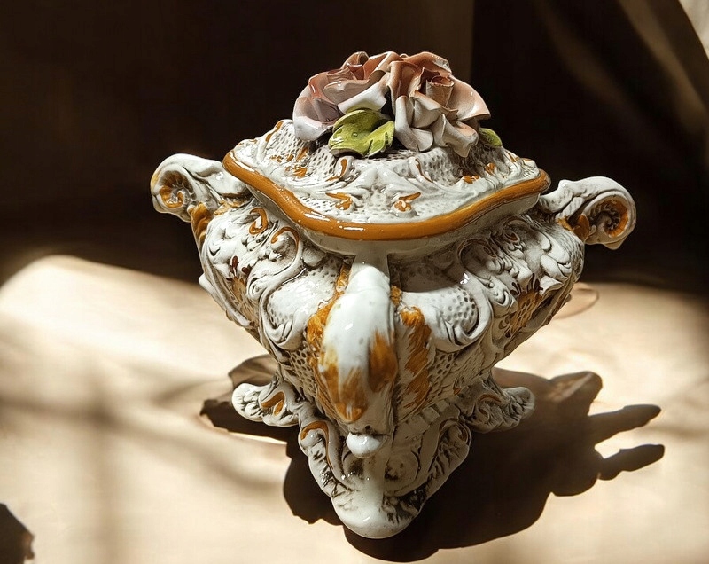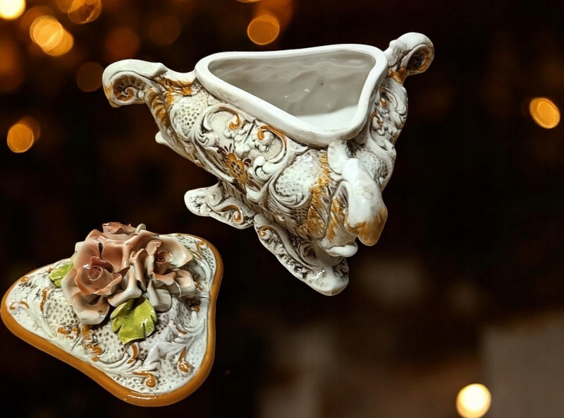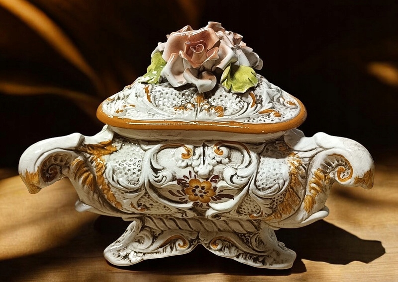 Предмет б/у, выполненный из керамики – продукция известной итальянской компании Bassano; украшен мотивами в виде разноцветных роз. Бонбоньерка сделана с вниманием к деталям. Несмотря на возраст (1980-1990-е годы), состояние очень хорошее.