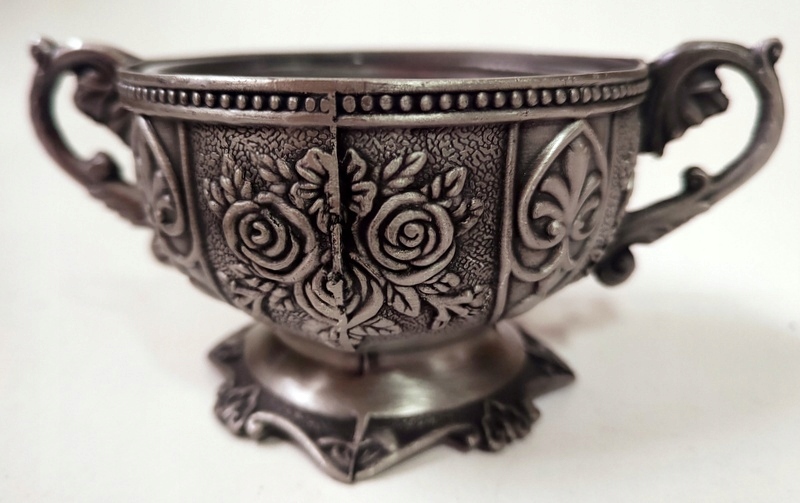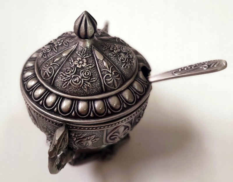 Изготовлена из цинкового сплава, покрыта старой серебряной жестью, богато декорирована по всей поверхности; поставлен на тонкие ножки. В крышке имеется отверстие для ложки, которая входит в комплект. Стеклянная вставка – съемная. Сахарница новая, неиспользованная, очень эффектная и элегантная.