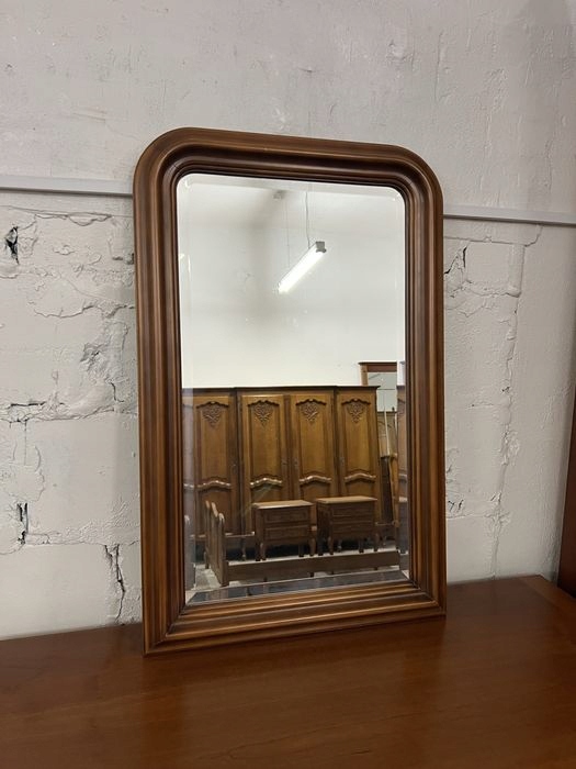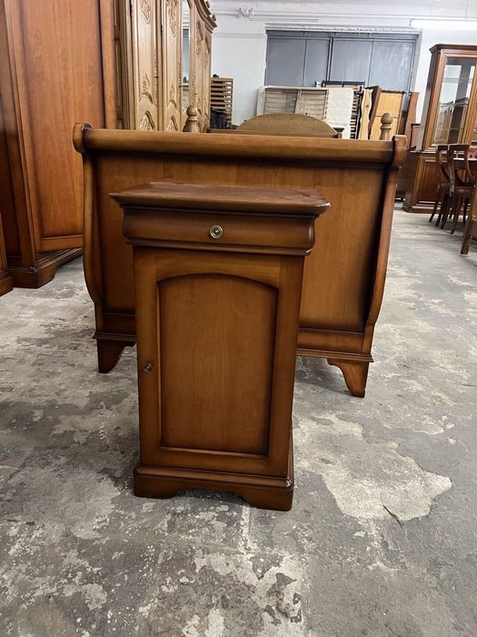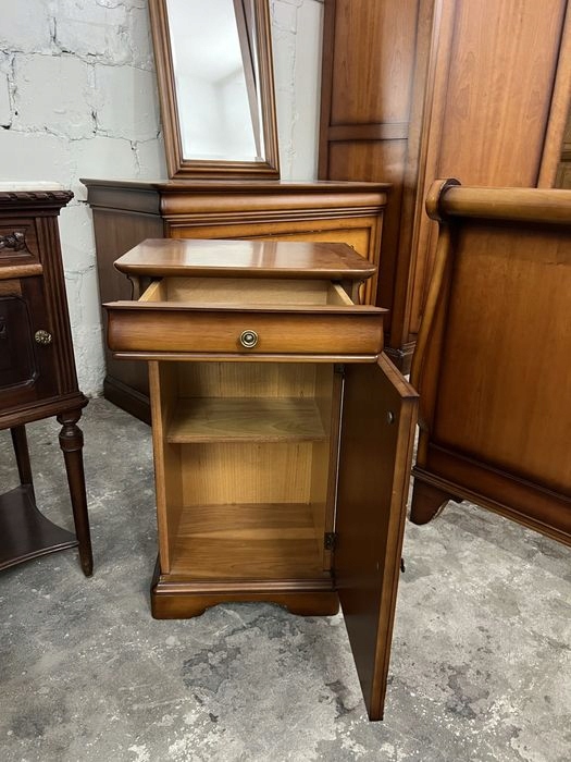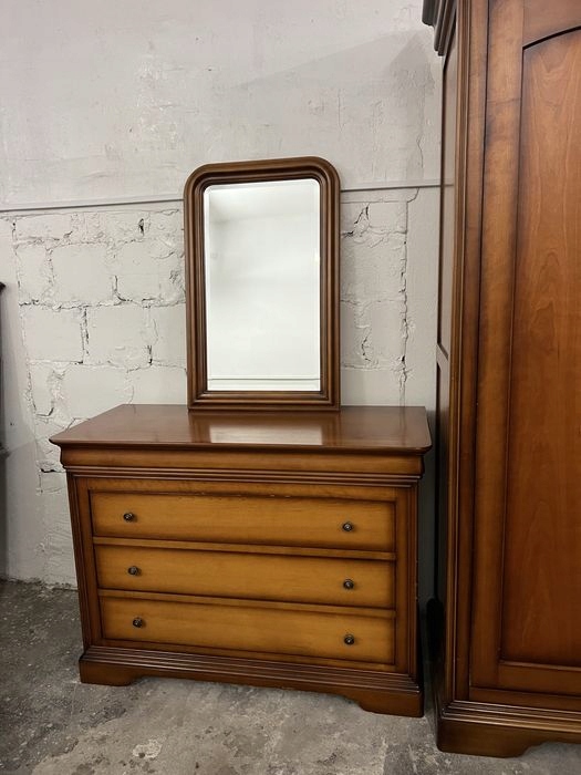 Весь комплект состоит из шкафа, комода, прикроватной тумбочки, зеркала со скошенными сторонами и односпальной кровати в раме.