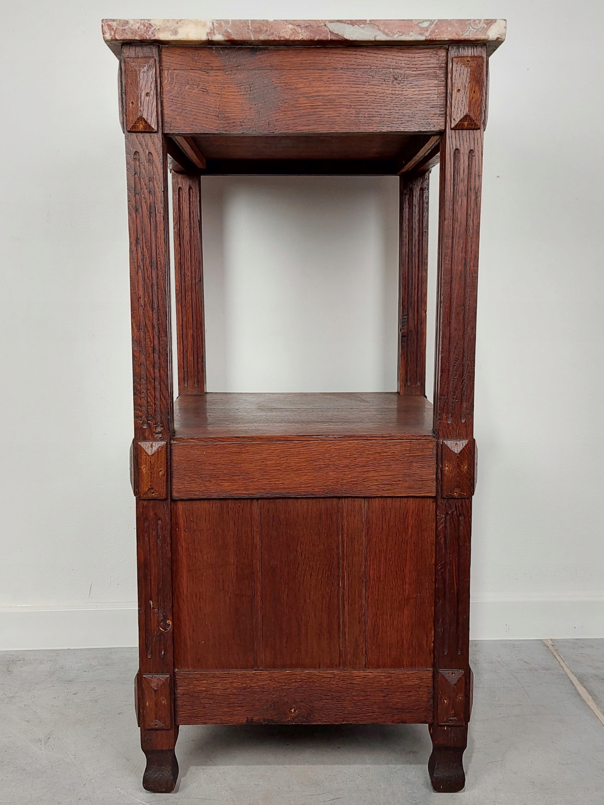 Стильная прикроватная тумбочка периода модерна из дуба с мраморной столешницей. В силу возраста мебель имеет следы ремонта и эксплуатации, такие как царапины на столешнице, сухие пятна в нижней части шкафа и т. д. (ориентировочный возраст от 80 до 100 лет). Столешница прикреплена несъемно. Детали показаны на фотографиях ниже.