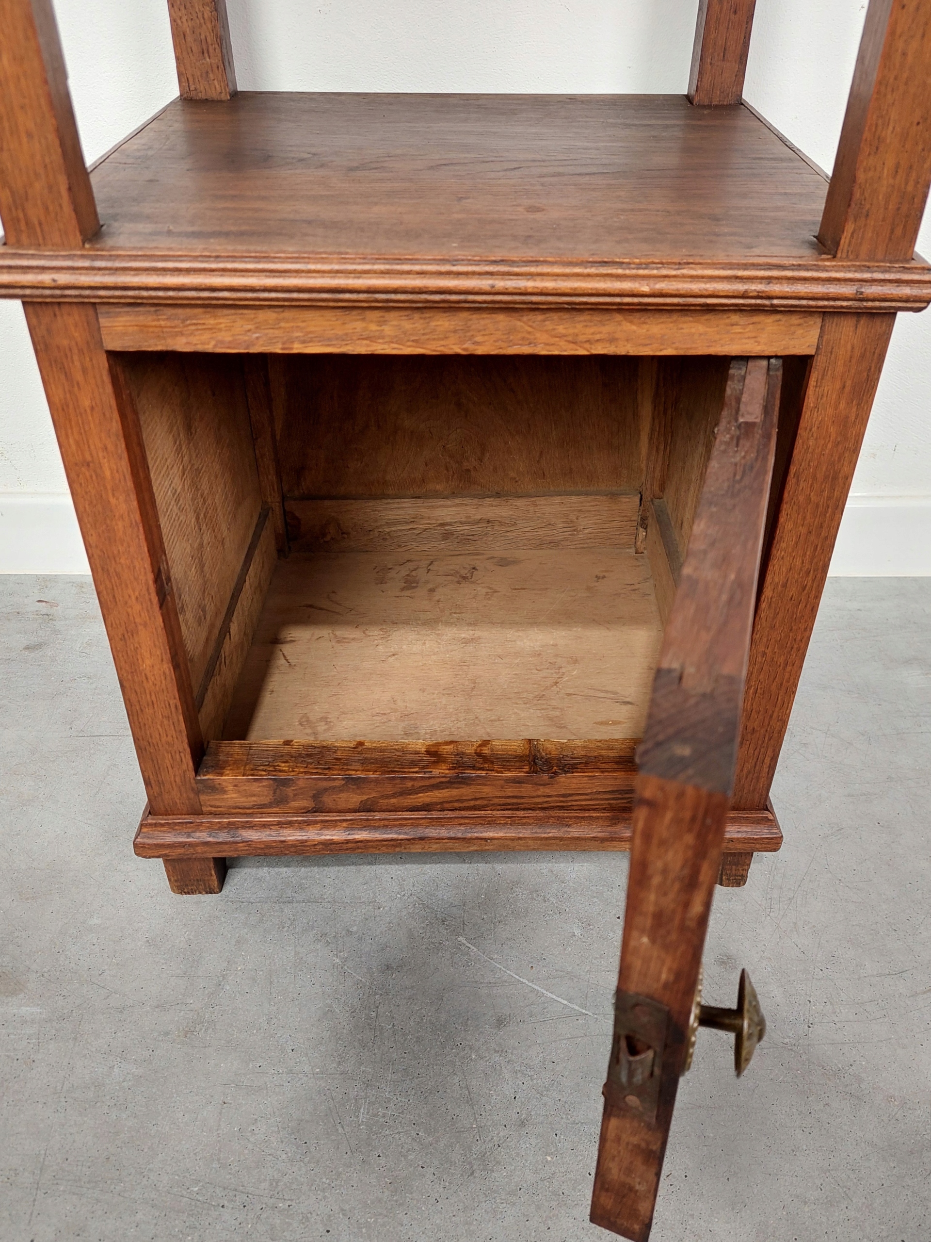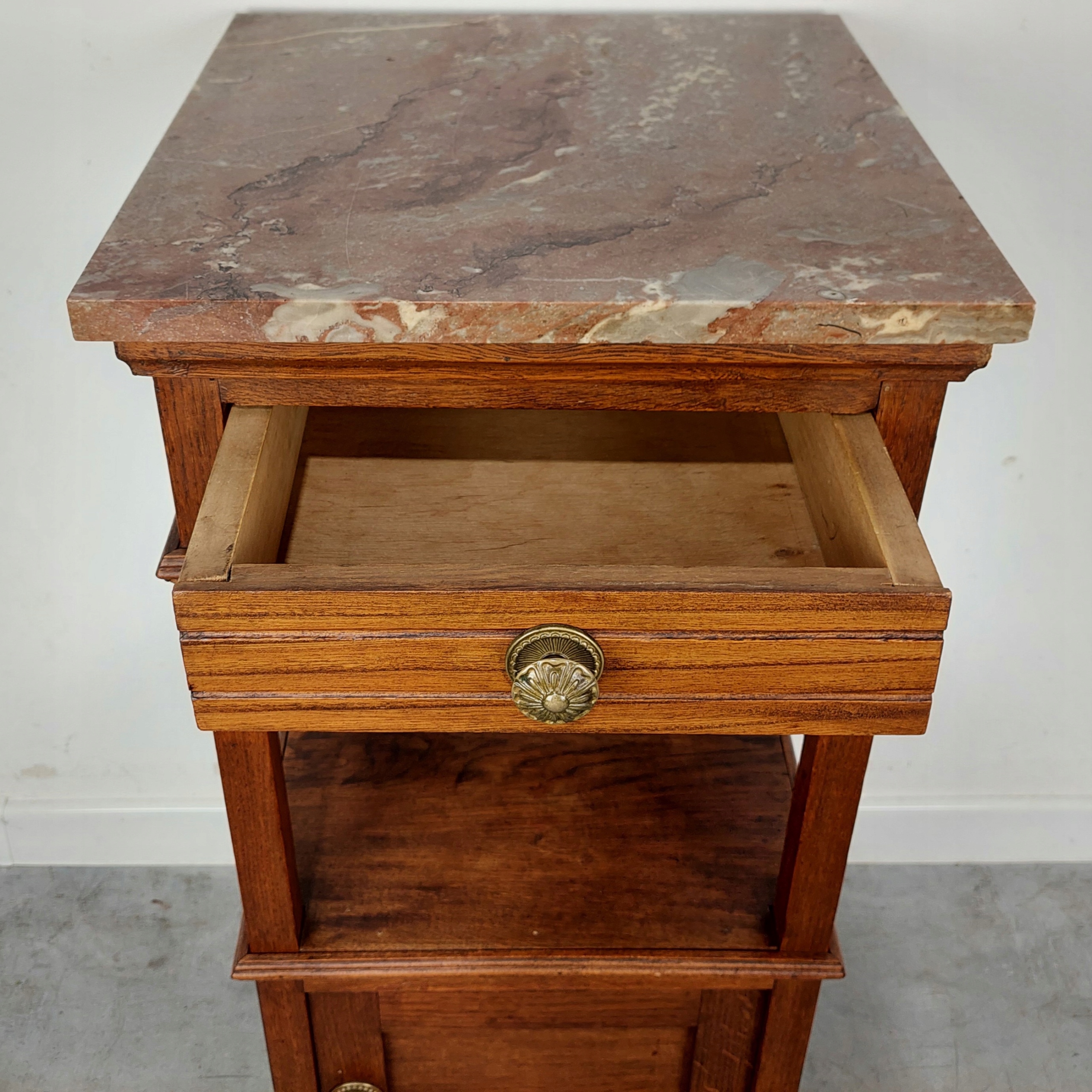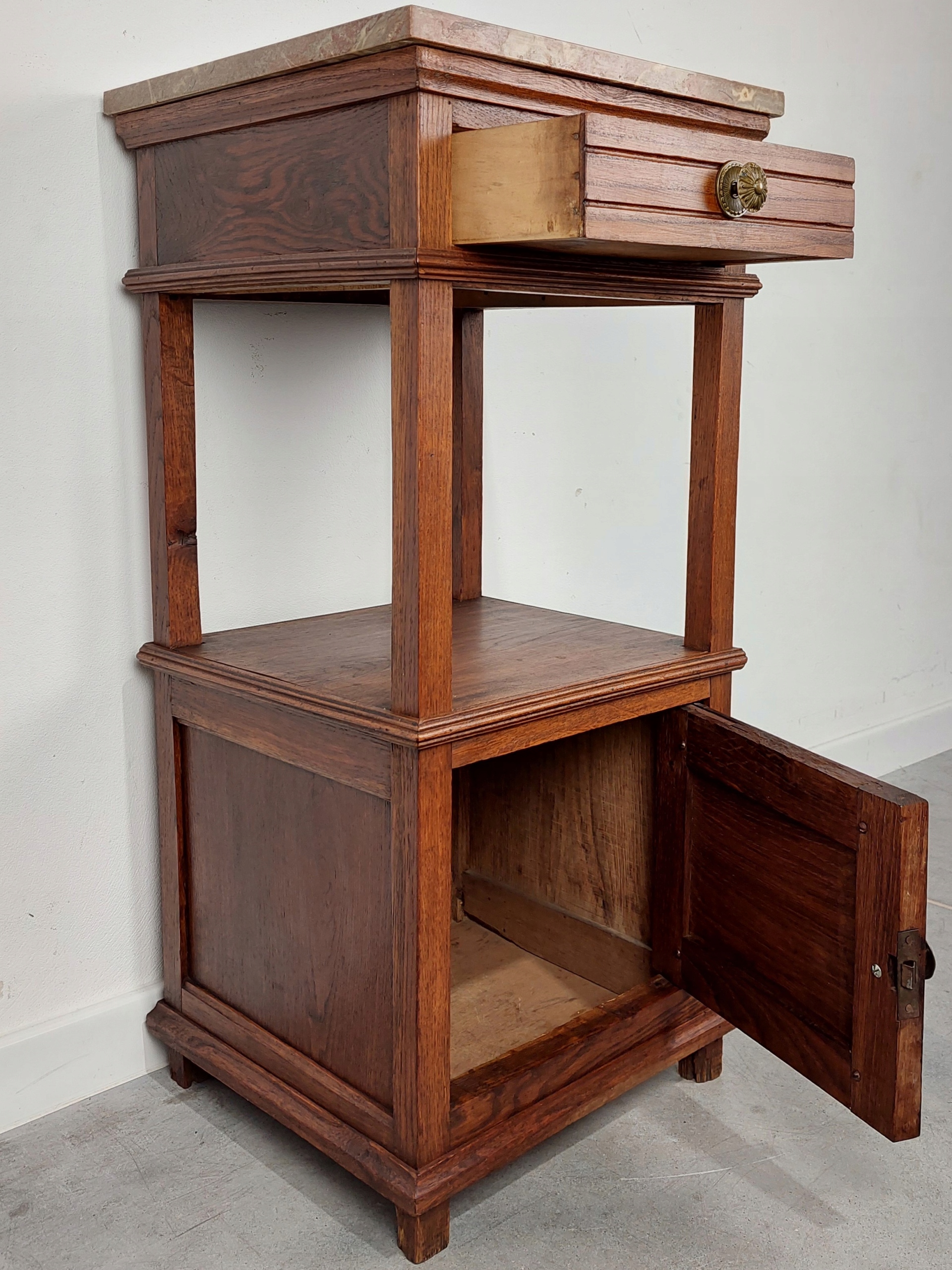 Стильная, эклектичная прикроватная тумбочка из дуба с мраморной столешницей. Из-за своего возраста на мебели могут быть следы ремонта и использования (предполагаемый возраст от 80 до 100 лет). Столешница несъемная, есть видимые мелкие царапины. Подробности показаны на фотографиях ниже.
