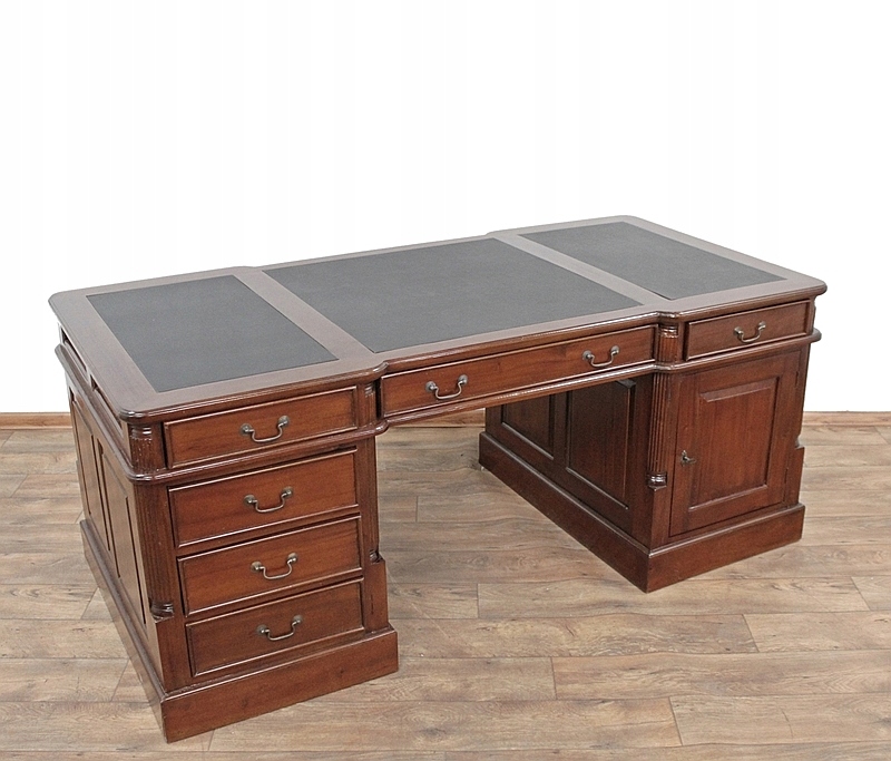 Уникальный деревянный предмет мебели с шестью ящиками и запирающимся шкафчиком с обеих сторон стола. Письменный стол представляет собой двусторонний предмет мебели, что является дополнительным преимуществом. Благодаря этому вы сможете сэкономить место. Люди, работающие над ним, сидят лицом друг к другу. Это дает большие возможности для обустройства помещения. Смотрится красиво. Вся вещь украшена металлическими ручками.