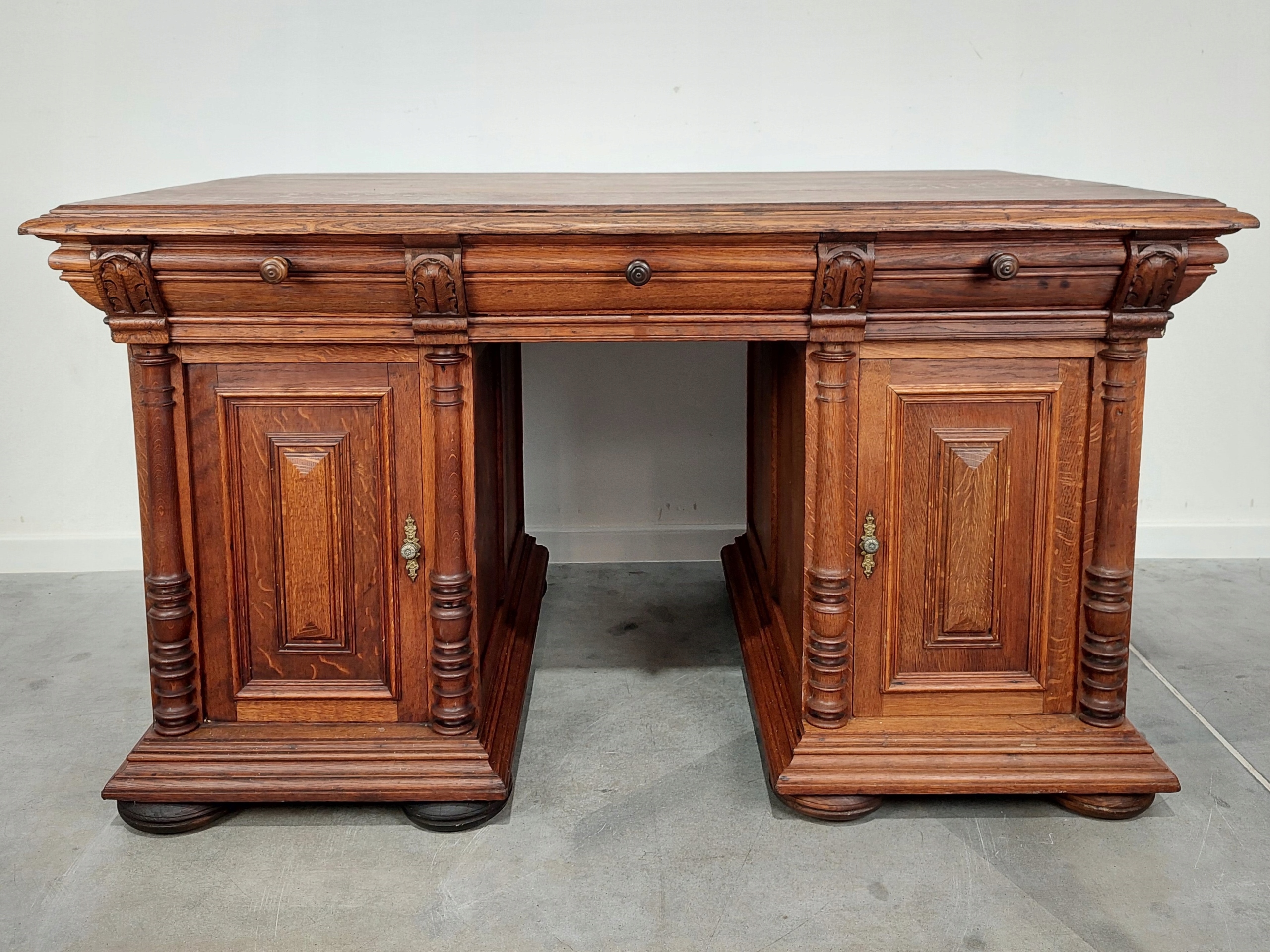 Стильный дубовый двусторонний и двухместный офисный стол, импортированный из Франции. Хорошая, прочная конструкция, полностью из массива дуба. Замки демонтированы, заменены на ручки. Предмет мебели датируется первой половиной 20-го века, по нашему мнению, между 1920 и 1930 годами, и имеет следы использования, такие как царапины, потертости, естественное высыхание и следы ремонта, вызванного возрастом. Столешница крепится на два дымохода, все разбирается на 3 элемента и в таком виде доставляется заказчику. Подробные фото ниже