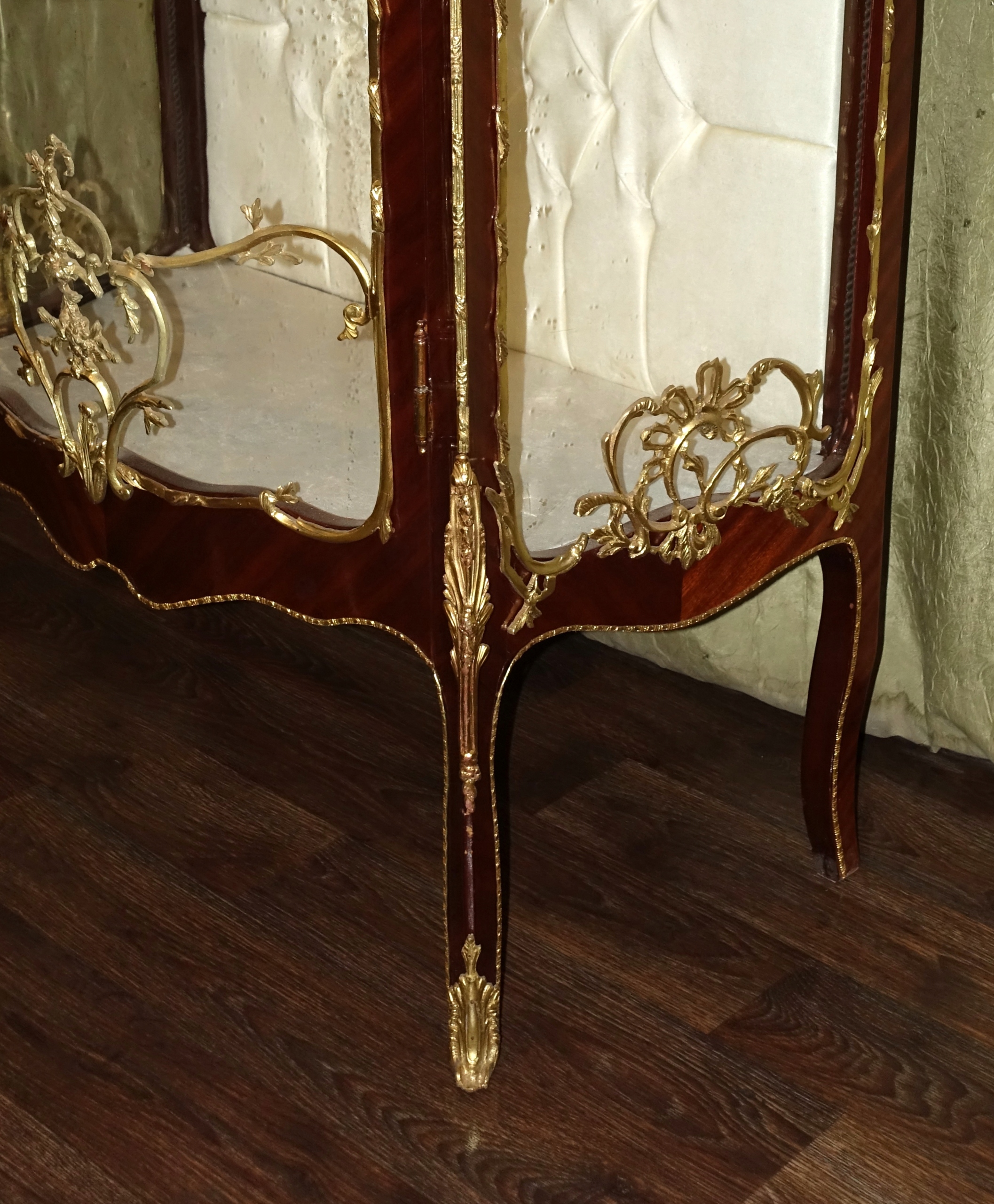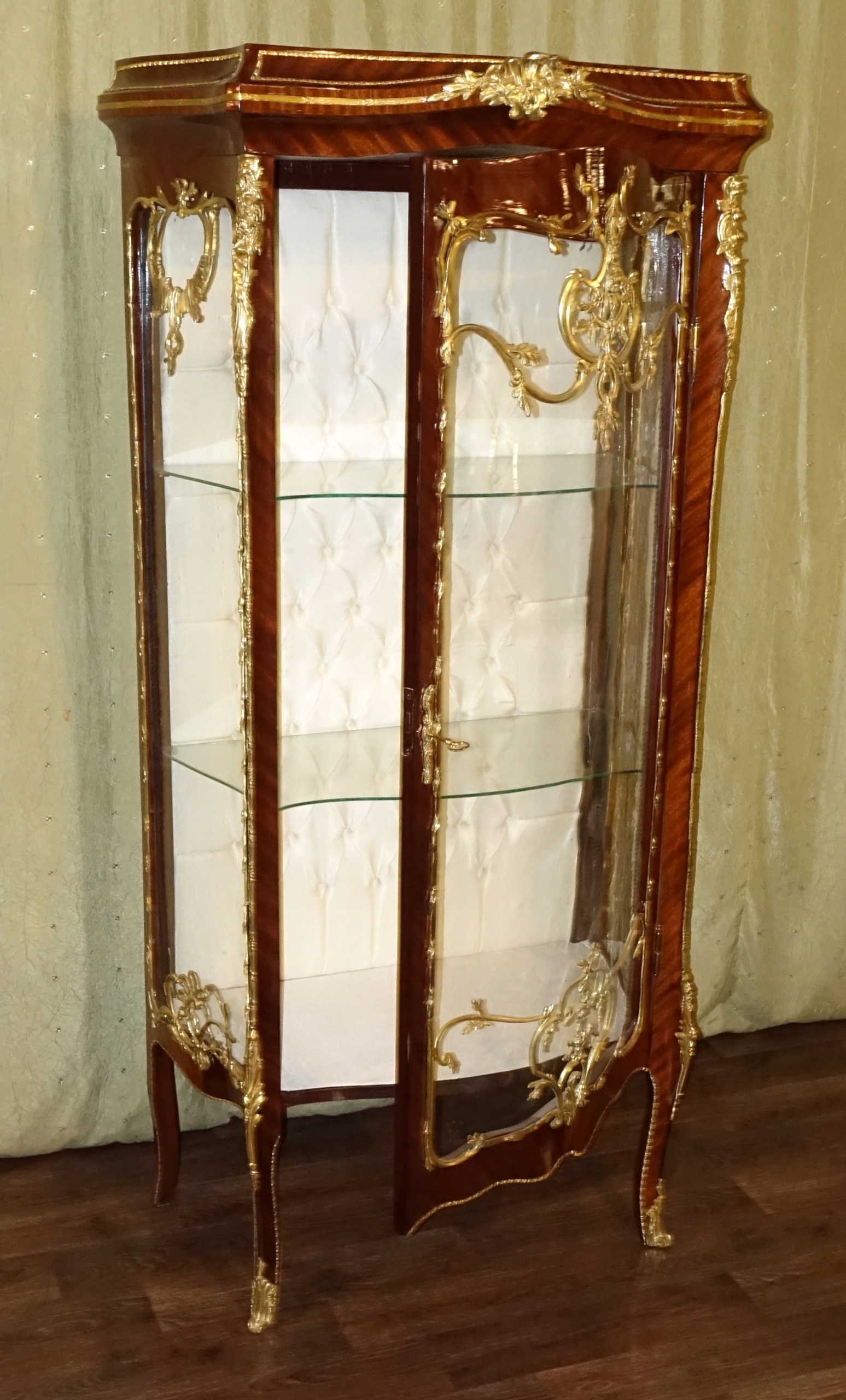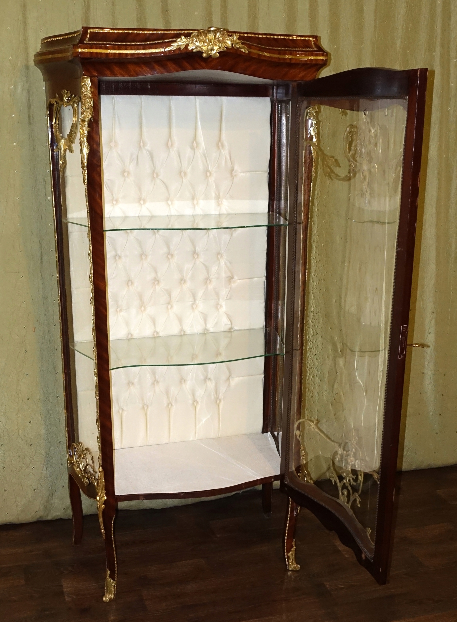Современный предмет мебели, сохраняющий старый дизайн и стиль. Он имеет две стеклянные полки, а также заднюю и нижнюю часть, облицованную материалом белого и кремового цвета. Красивые цвета и многочисленные украшения из массива латуни, особенно в нижней и верхней частях, перекрывающих дверное остекление, делают предмет мебели чрезвычайно элегантным и со вкусом оформленным экспонатом, который непременно повысит эстетическую ценность любого помещения.