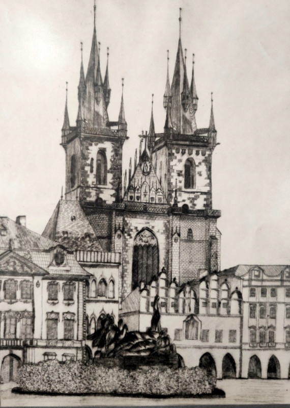 На графике изображен фрагмент Рыночной площади в Праге (Чехия). На переднем плане памятник Яну Гусу (1370-1415) 1915 года, за доходным домом стоит церковь Пресвятой Девы Марии перед Тыном (1365-1463).
