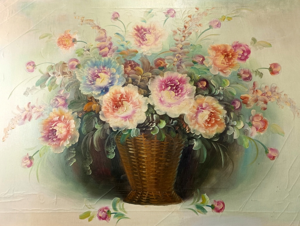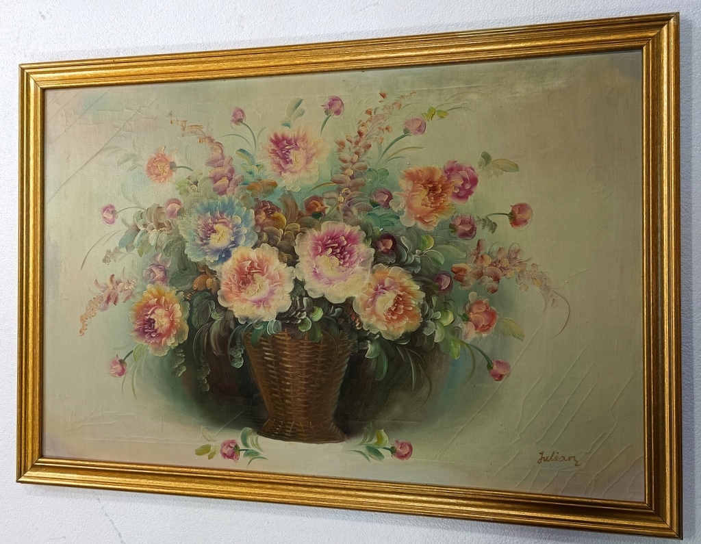 Представляю вам очень впечатляющую картину, написанную маслом на холсте. На картине изображен «роскошный» букет цветов в плетеной корзине. Чтобы повысить его ценность и эстетическую ценность, он заключен в тонкую деревянную раму цвета старого золота. St