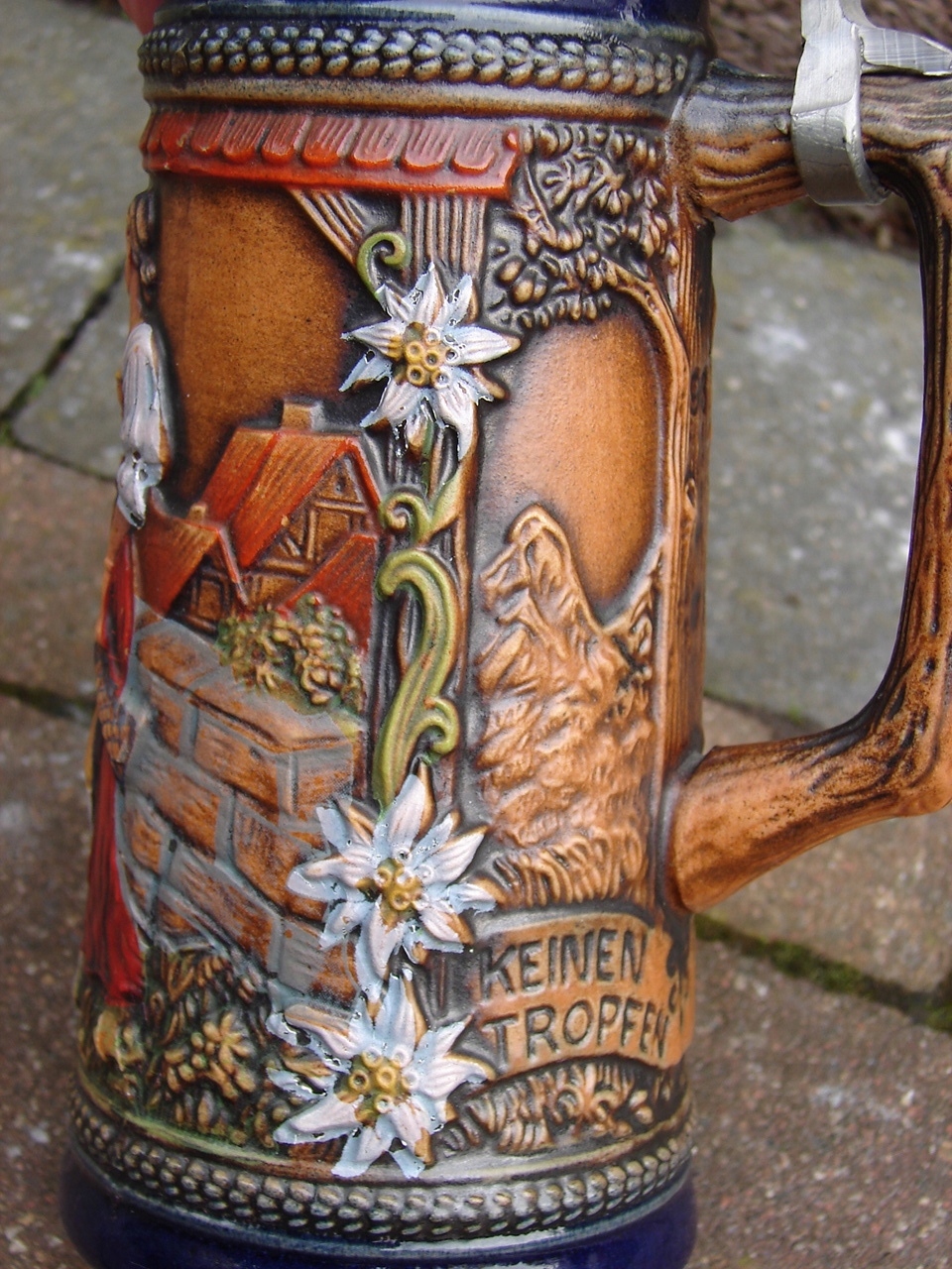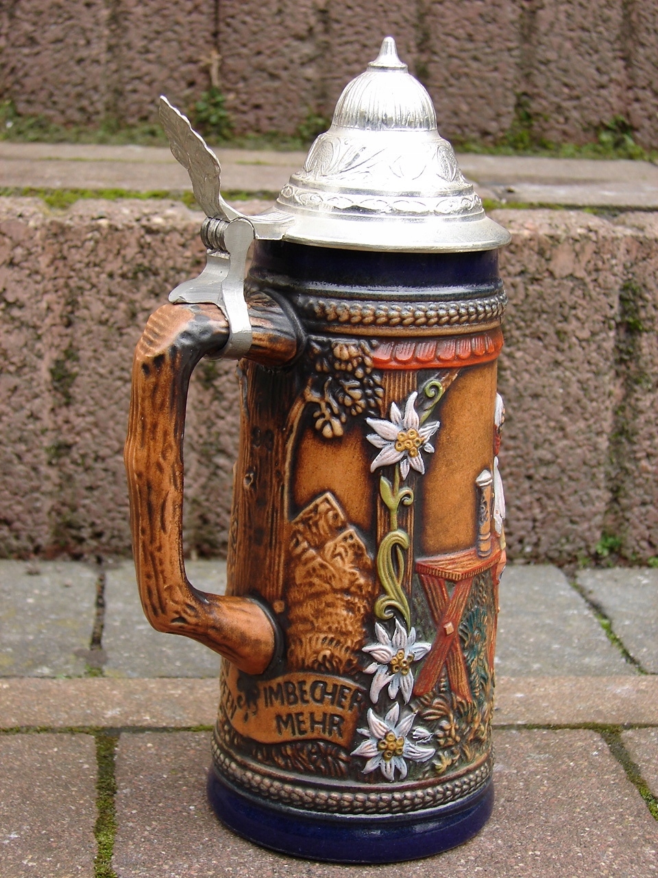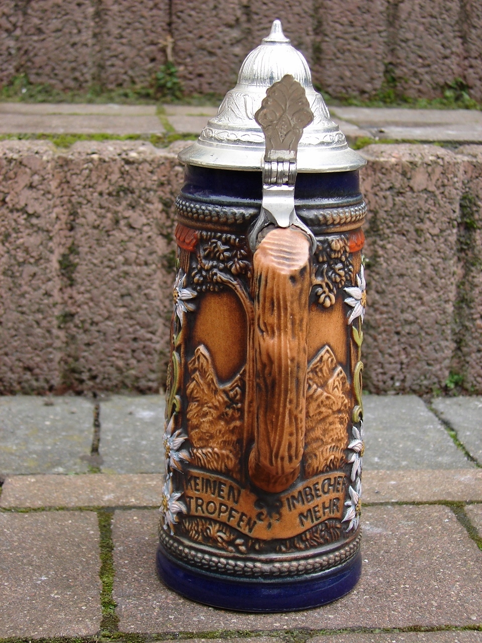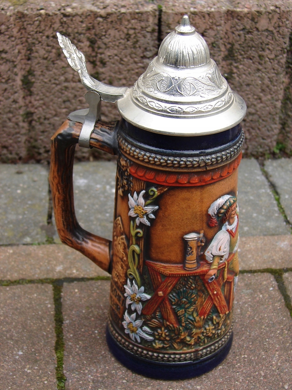 Стильная, типично коллекционная керамическая кружка с жестяной крышкой, богато украшенная выпуклым барельефом.
