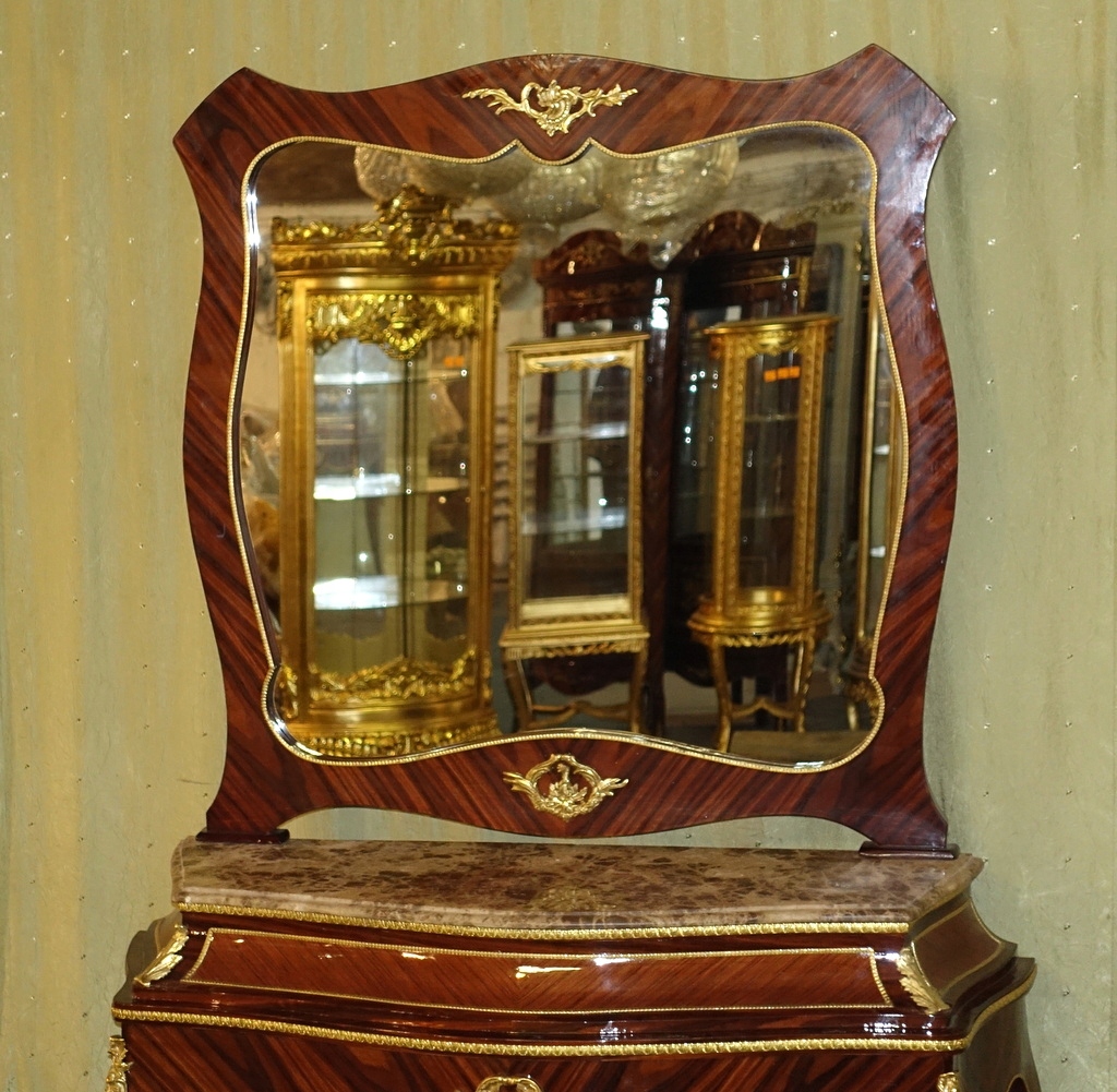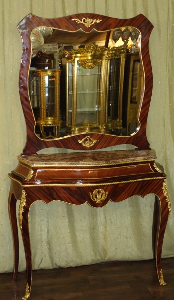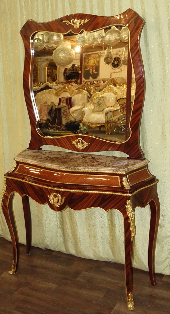 Предмет мебели восхищает своей уникальностью. Зеркало в изысканной раме. Стол и зеркало из темного ореха, украшенные фантастическим латунным декором. Консоль стоит на стильно изогнутых ножках и увенчана практичной столешницей из темно-бежевого мрамора.