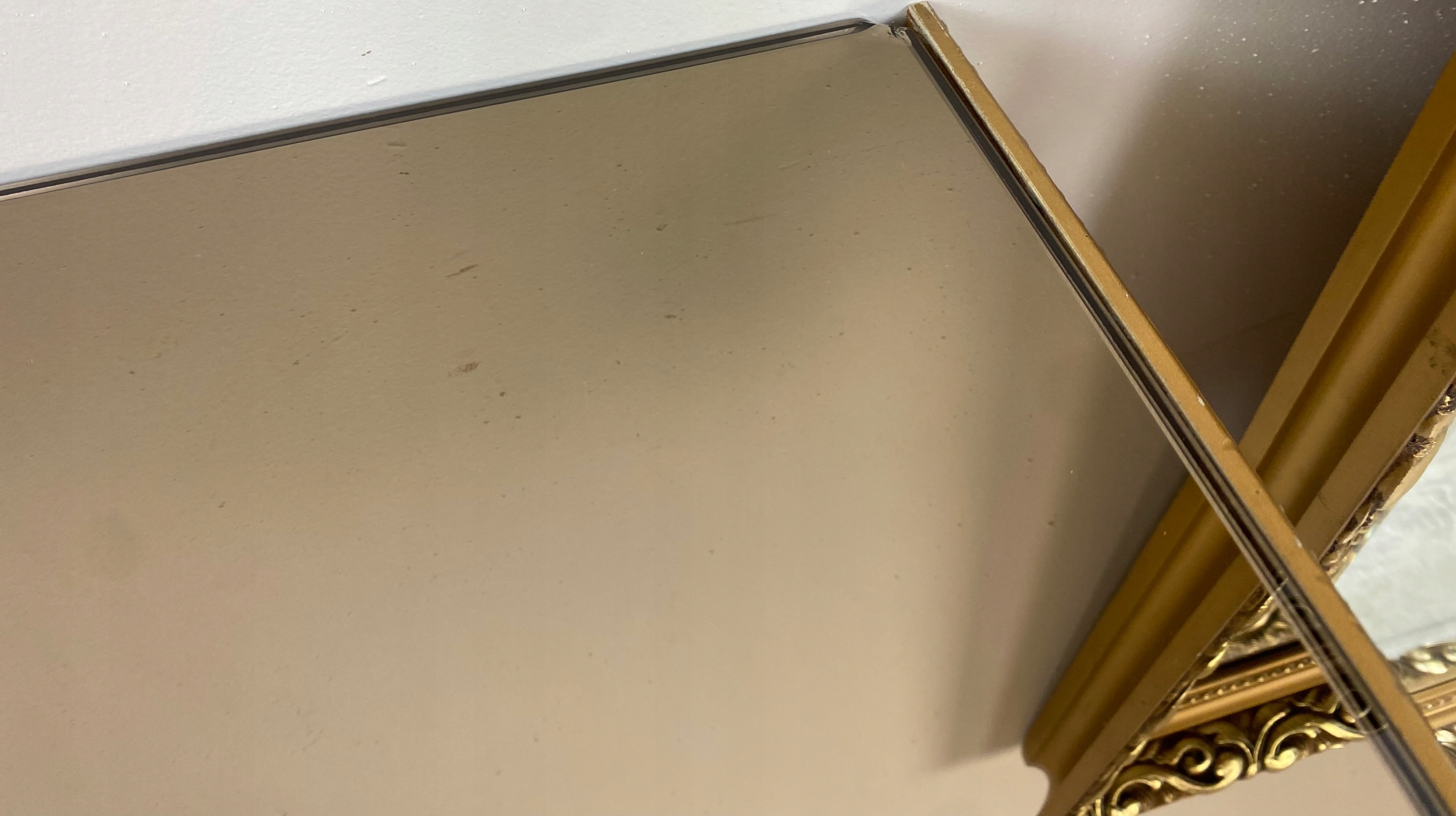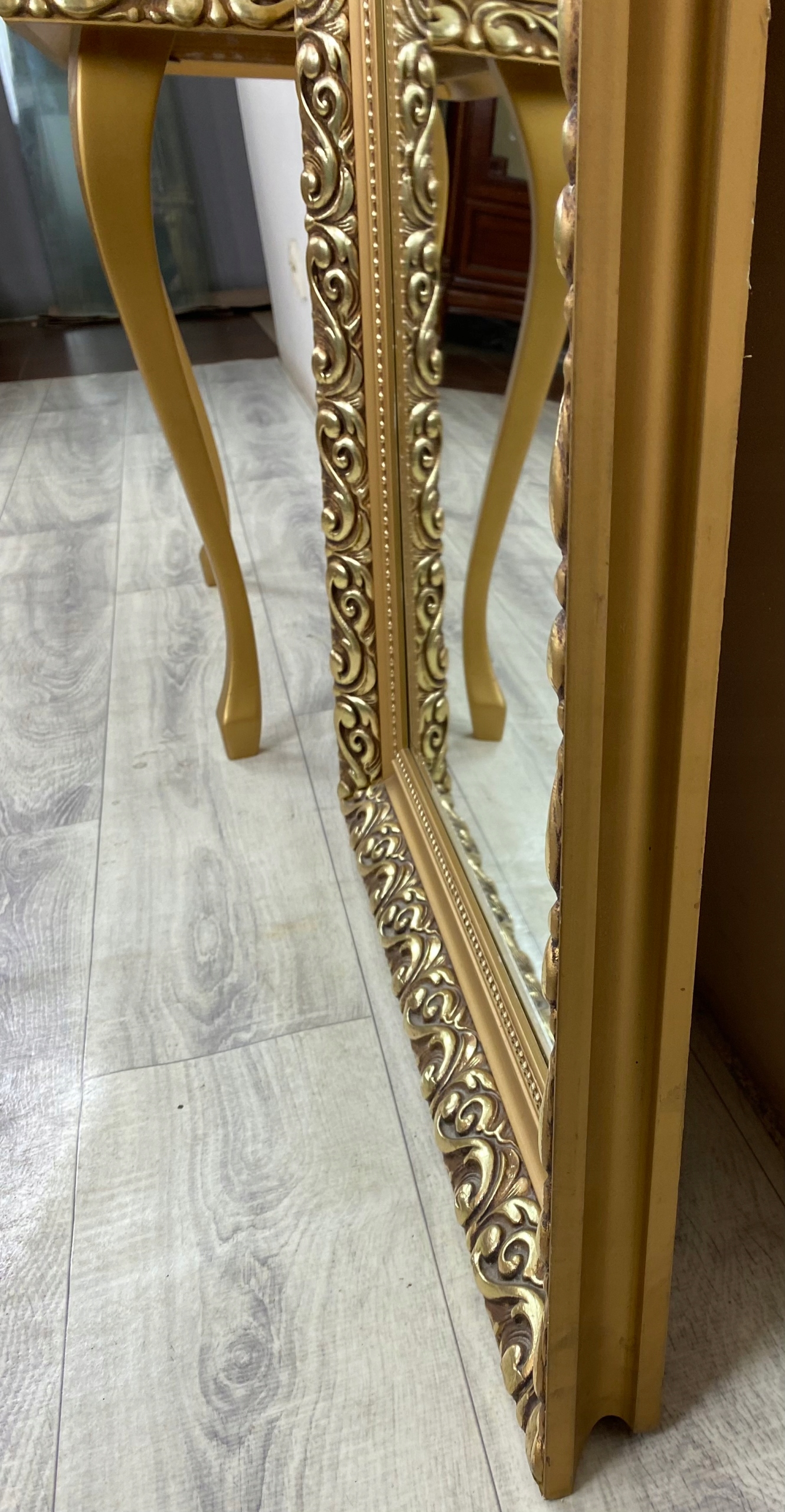 Изначально скошенное зеркало. Зеркало имеет золотую, богато декорированную раму, а под ней небольшая столешница с таким же орнаментом. Столешница покрыта стеклом. Уплотнитель окна в заднем правом углу. Мебель стоит на двух изогнутых ножках в стиле Людвик. Все выполнено в золотистом цвете, что придает интерьеру элегантный, декоративный характер.
