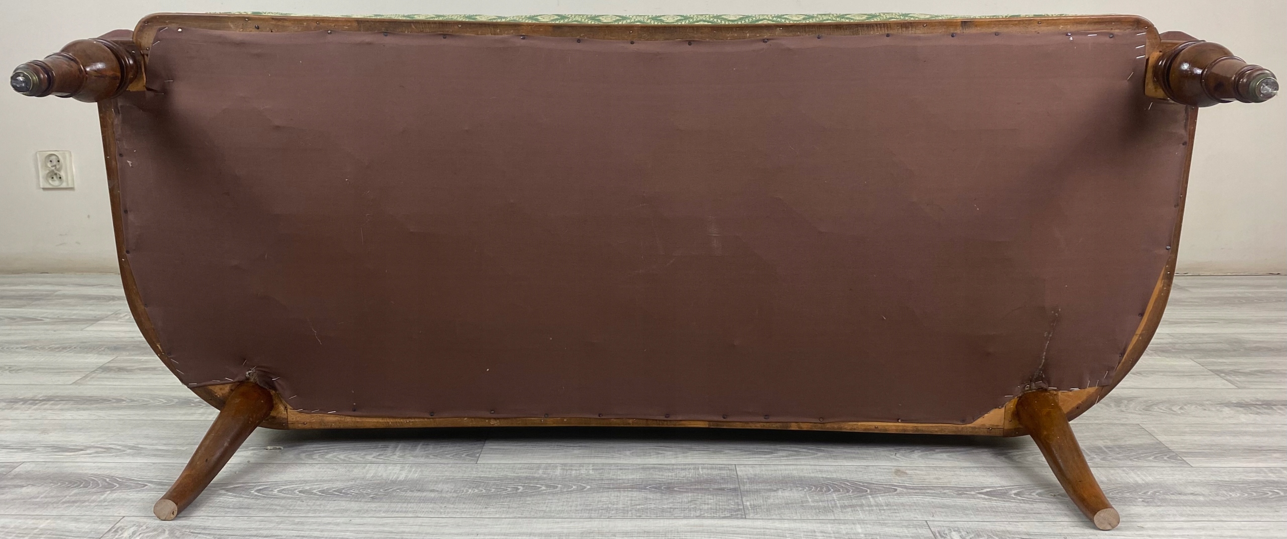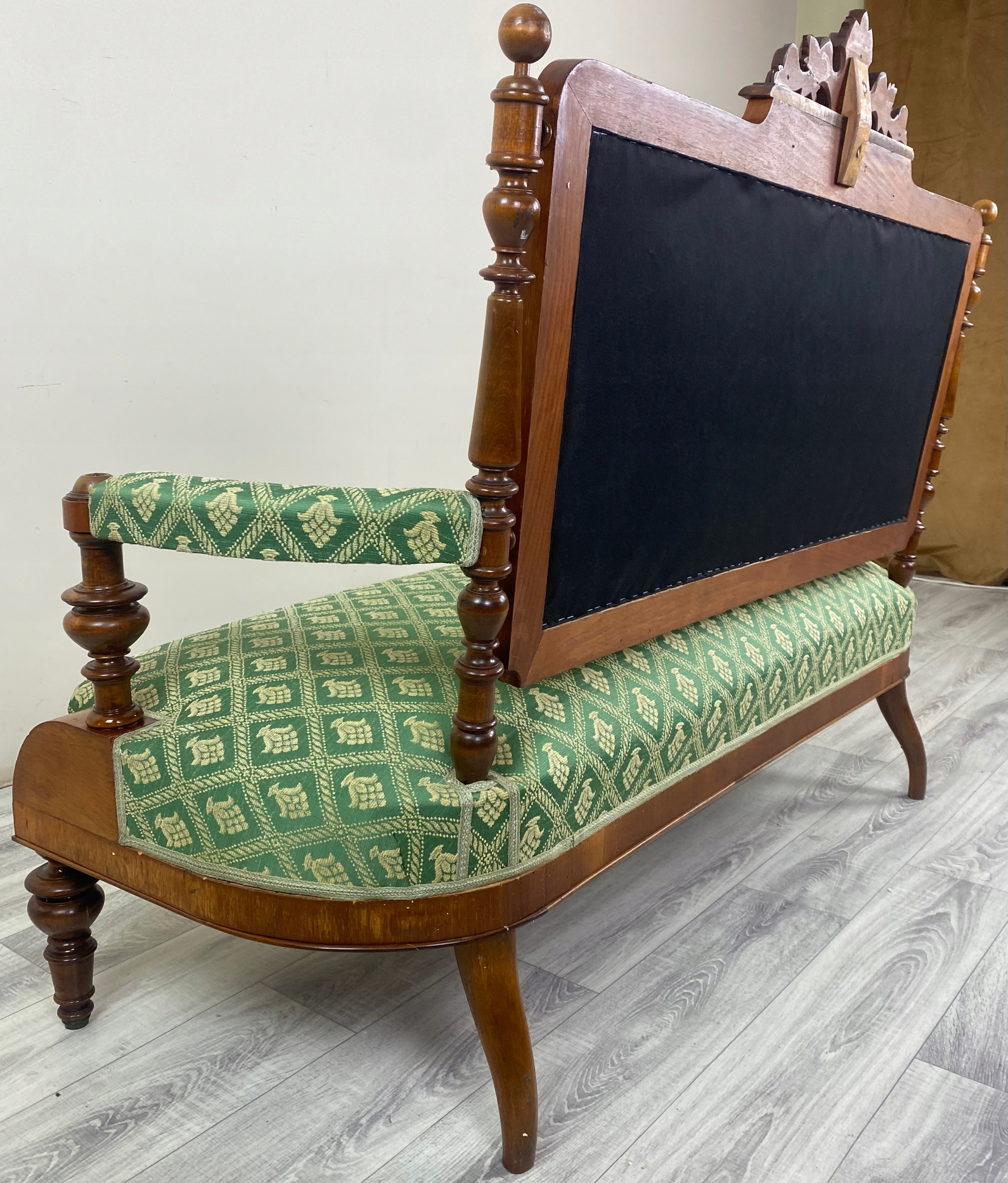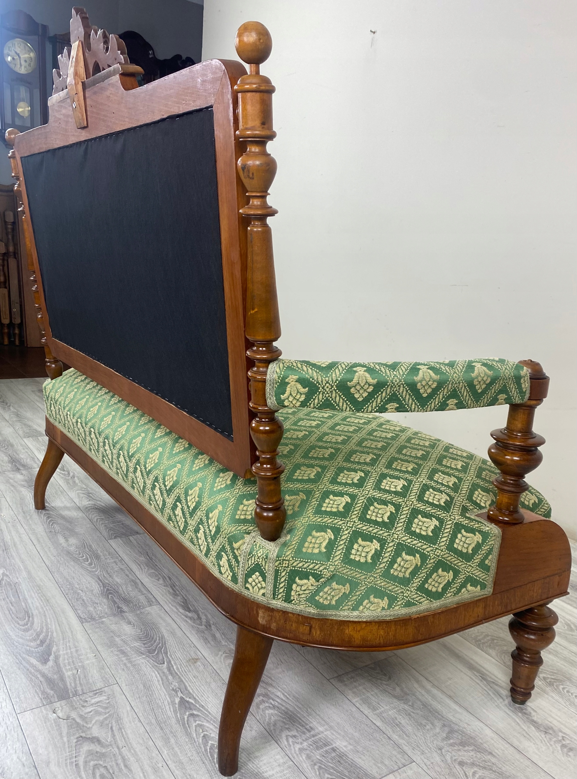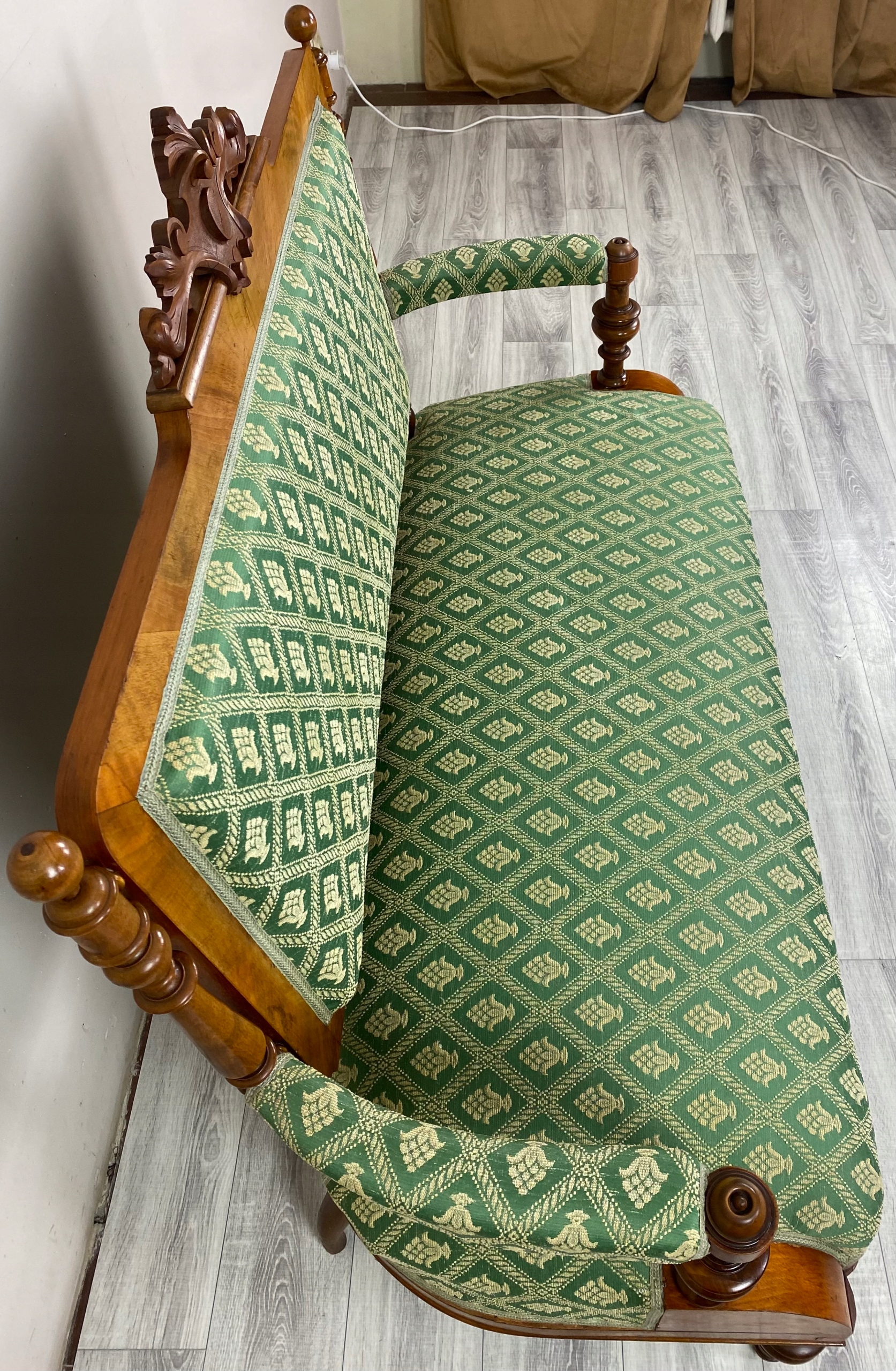 Обивка: зеленая ткань с регулярным классическим растительным орнаментом светлого цвета; одинаковое положение сиденья, спинки и подлокотников.