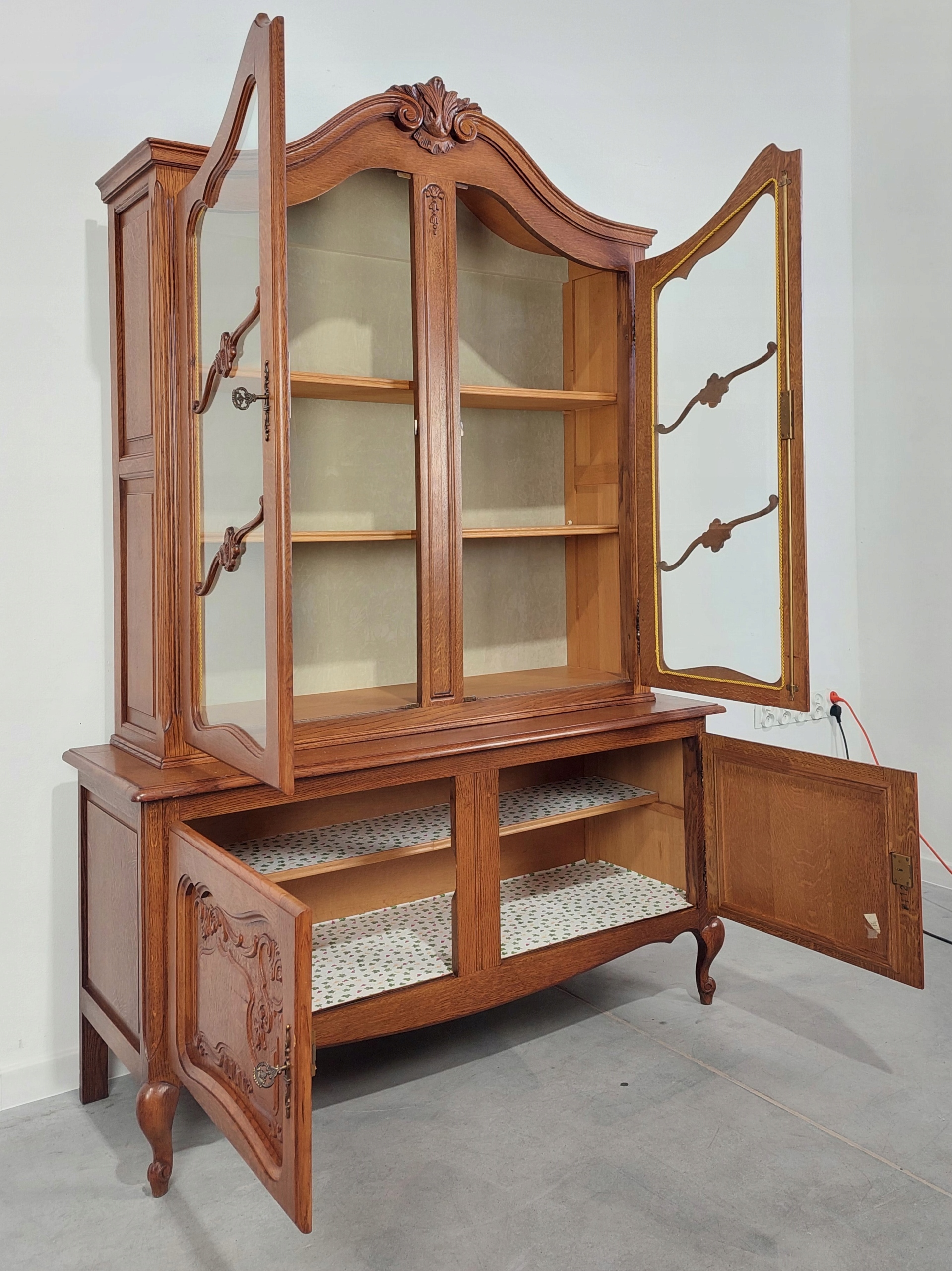 Стильная, красивая витрина из дуба Людвика классической формы, привезена из Франции, замки рабочие, два ключа. Предмет мебели с успехом может служить библиотекой, ведь все полки деревянные. На столешнице имеются небольшие следы использования, а также потертости в нескольких местах мебели. Внутренняя часть верхней части покрыта бархатным материалом, а нижняя часть полок закреплена шпоном. Мебель состоит из двух элементов, соединенных сзади гласными. Подробные фото ниже.