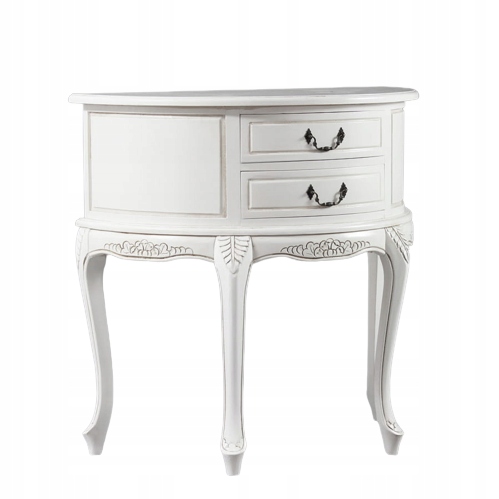 Красивая, полукругальная стена консоль в белом, древнем. Мебель из ручной вырезанной экзотической древесины. Два вместительных ящика под столешницы. Консоль была установлена на декоративных, согнутых ногах. Идеально подходит для стильно меблированного зала. Блэк -металлический ручки.