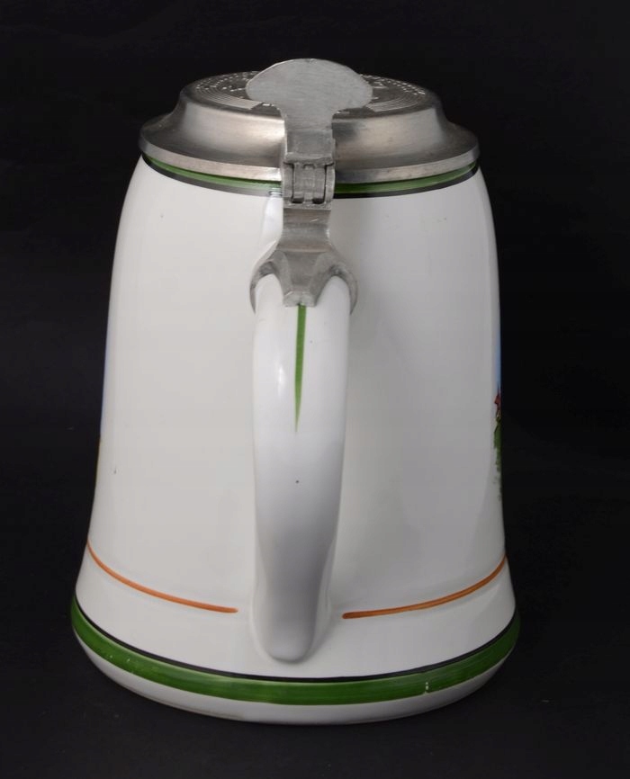 Предмет аукциона – замечательная старинная подписанная пивная кружка ручной работы из Германии. Он полностью изготовлен из белой керамики. Этот предмет чрезвычайно декоративен. Он украшен видимой росписью с изображением танцующей пары, нарисованной на поверхности, и чрезвычайно декоративной серебряной крышкой - крышкой из жести. Этот товар идеально подойдет любителям пива. Удобная ручка позволяет спокойно наслаждаться напитком. В такой оригинальной кружке алкоголь будет очень вкусным. Идеальное украшение для комода, винного шкафа и т. д. Идеально подходит для коллекционеров! Очень рекомендую к покупке!!!