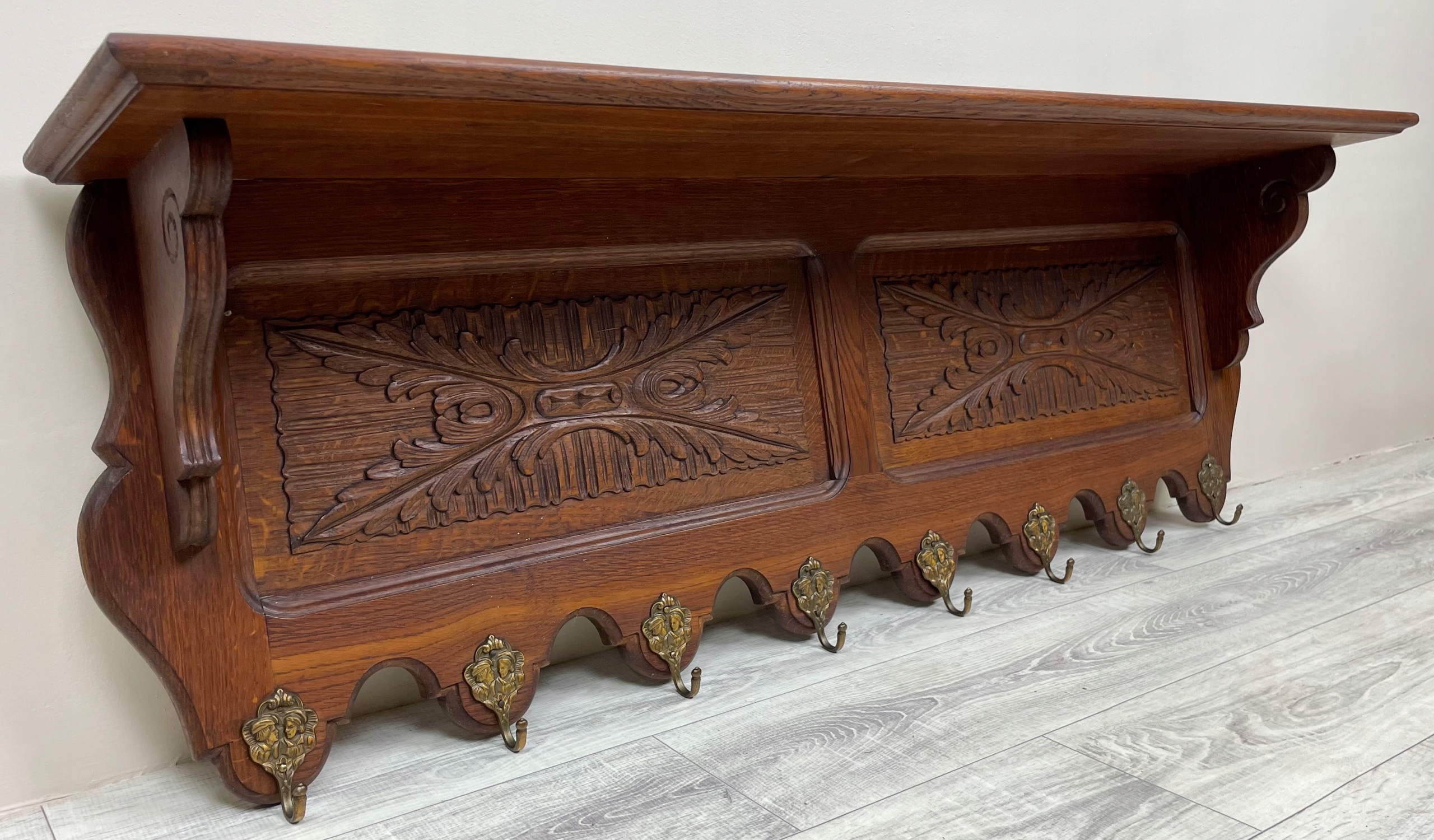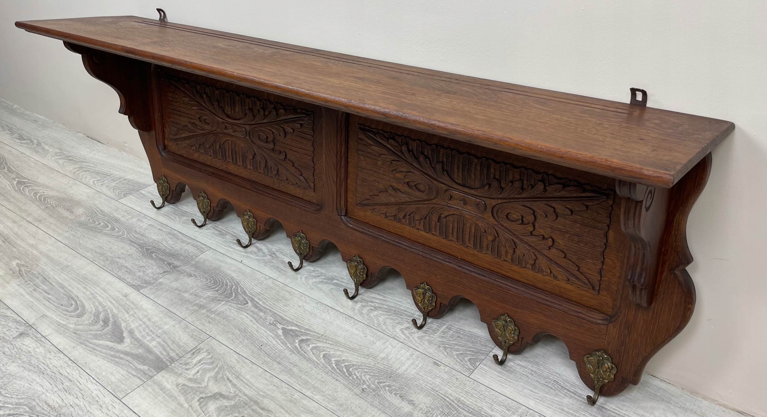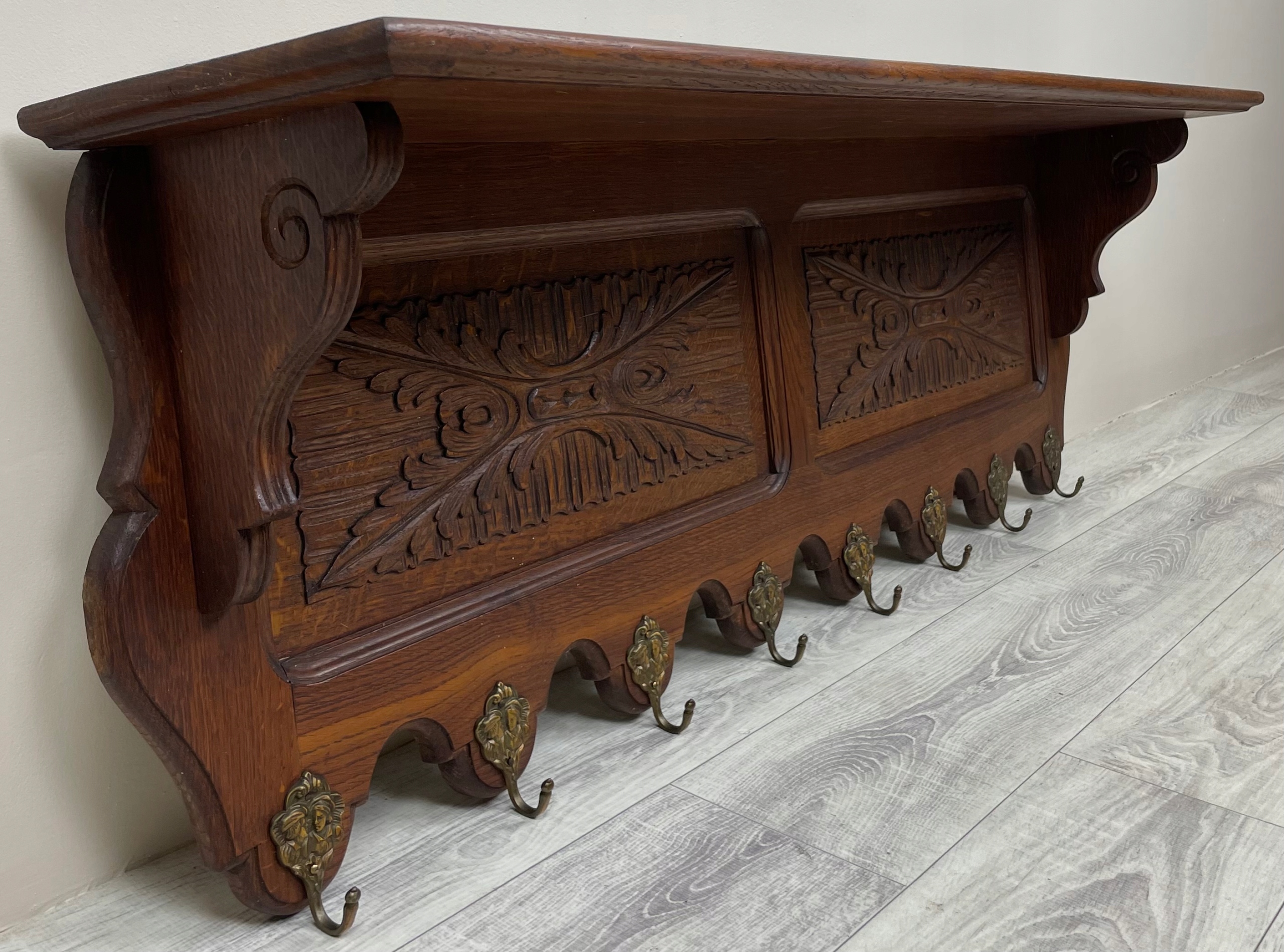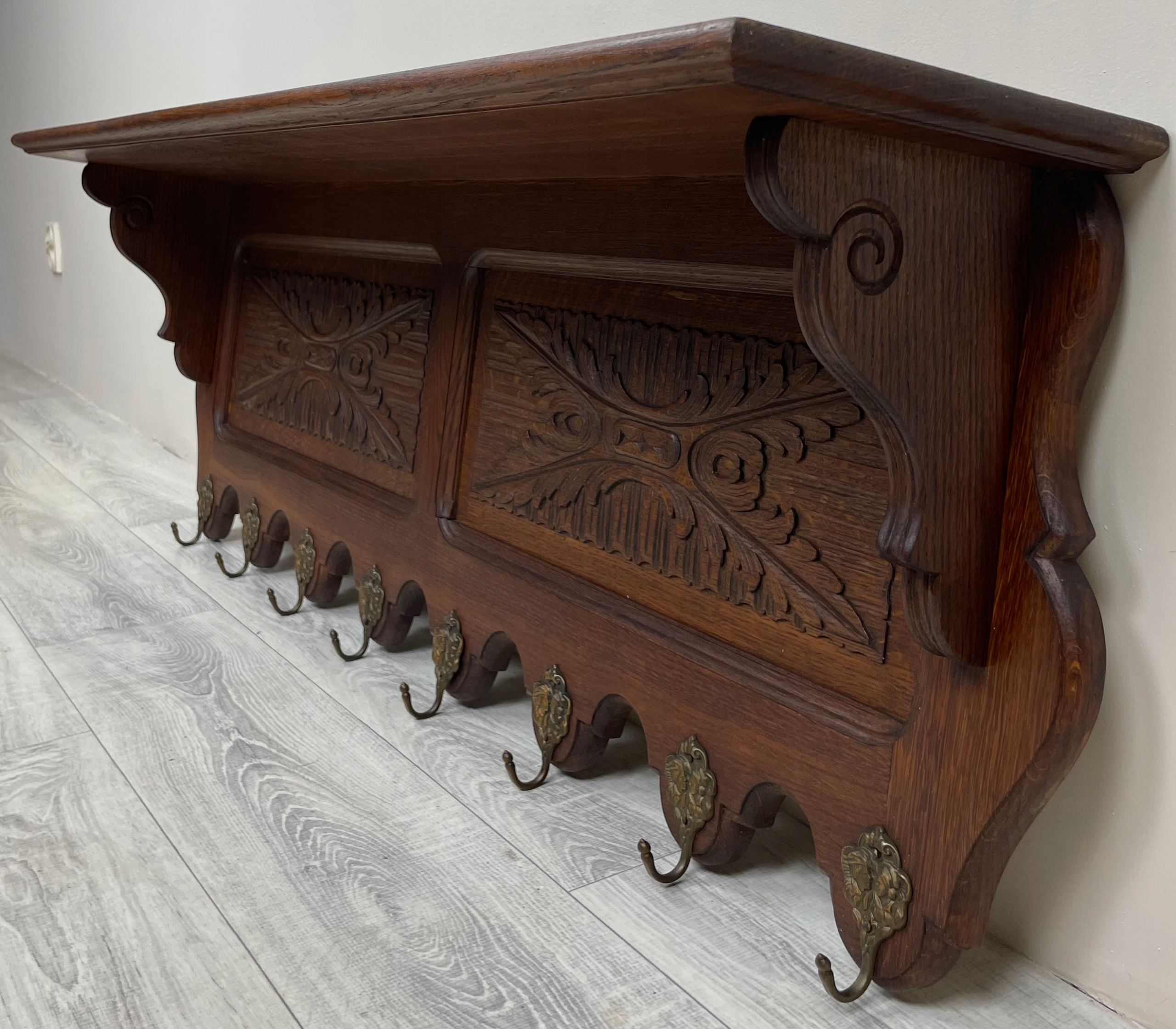 >Имеет 8 латунных крючков. Сверху имеется полка.