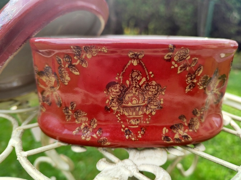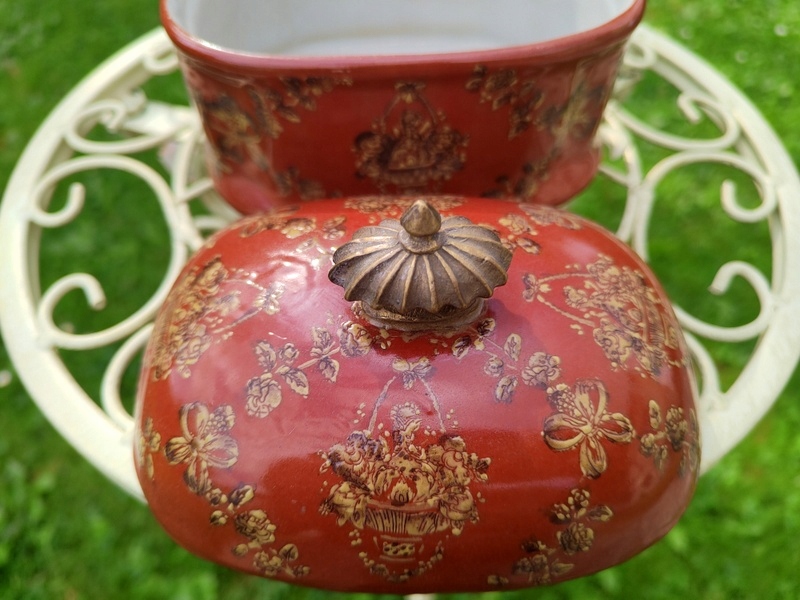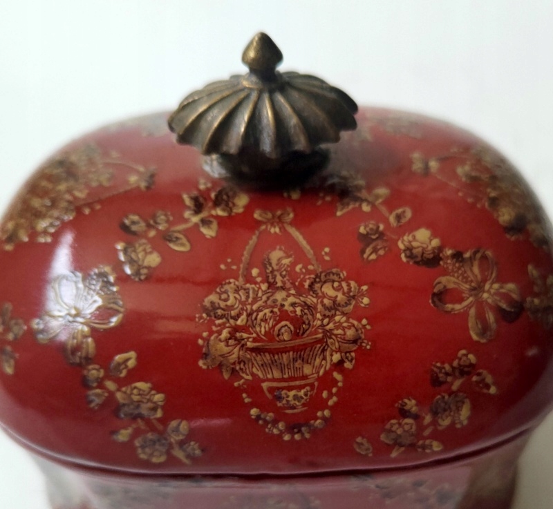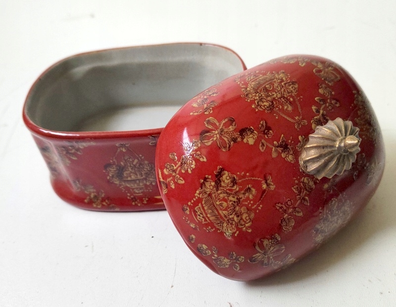 Красивая шкатулка. Фарфор со вкусом расписан в бордовых и золотых тонах. Дополнительный декоративный элемент – латунная ручка. Блюдо очаровательное и шикарное, обязательно станет украшением и полезной вещью дома - состояние очень хорошее.