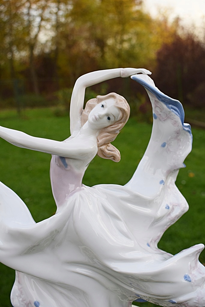 Фарфоровая фигурка танцовщицы, изготовленная в наши дни с сохранением старинных ремесленных приемов. На нем изображена танцовщица во всей ее красе во время танца. В неподвижной скульптуре художник запечатлел динамику движения, легкость струящегося платья и грацию танцовщицы. Кроме того, цвета и одежда создают атмосферу красоты, изящества и художественного чутья.