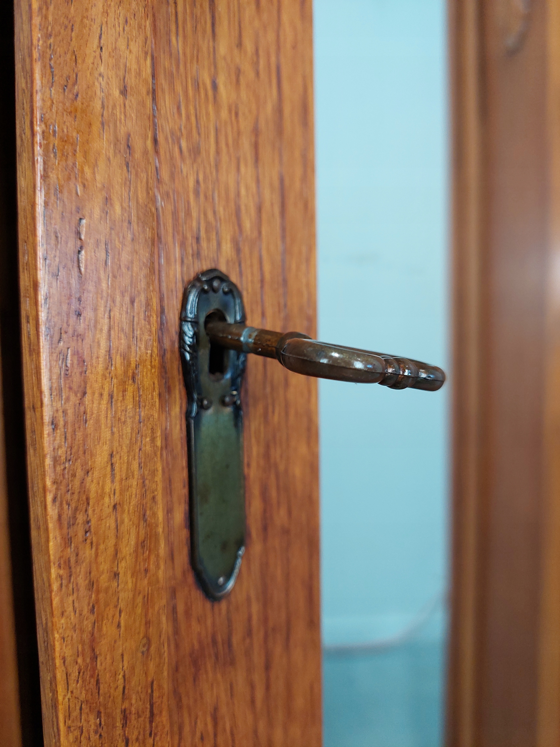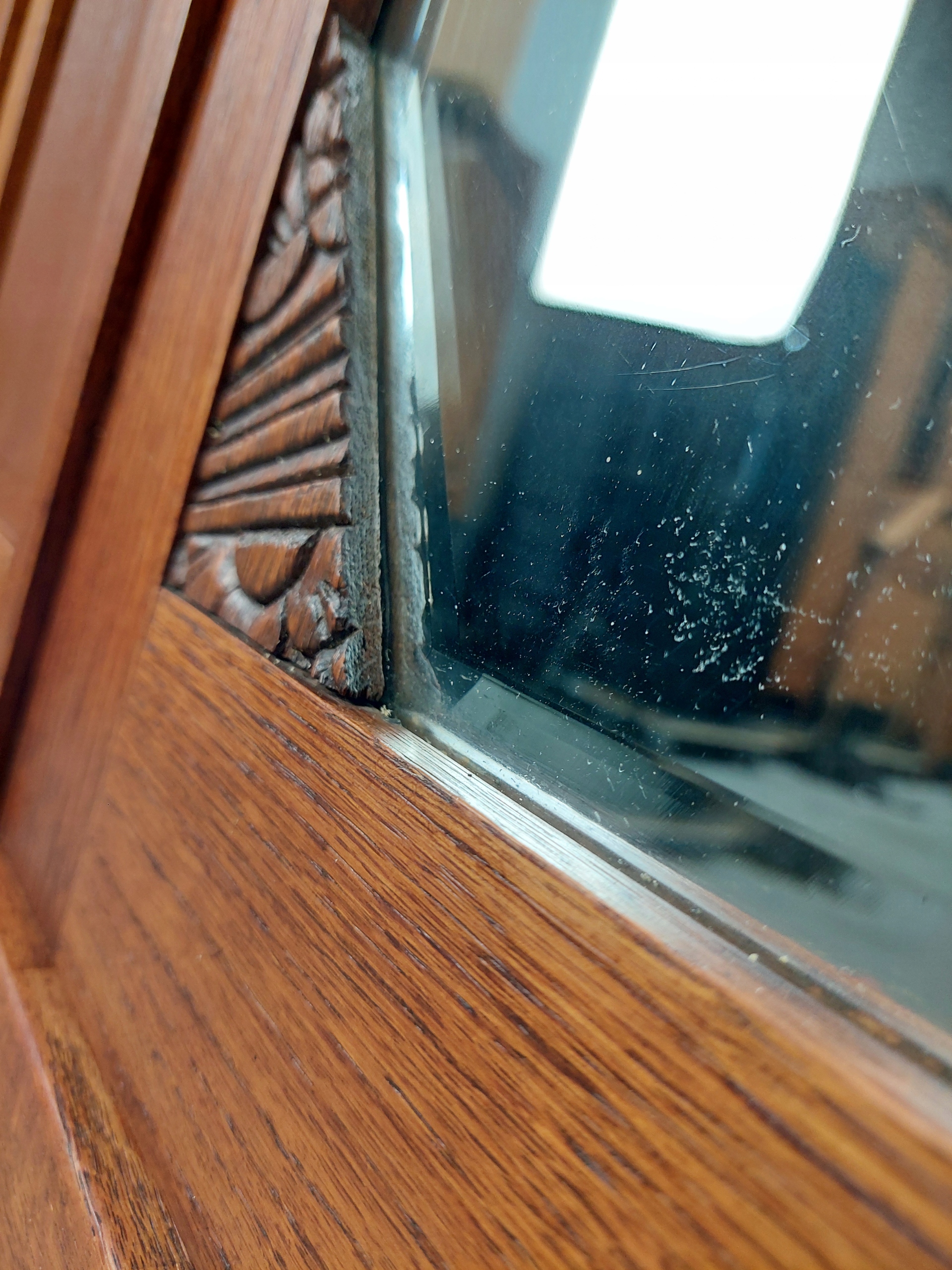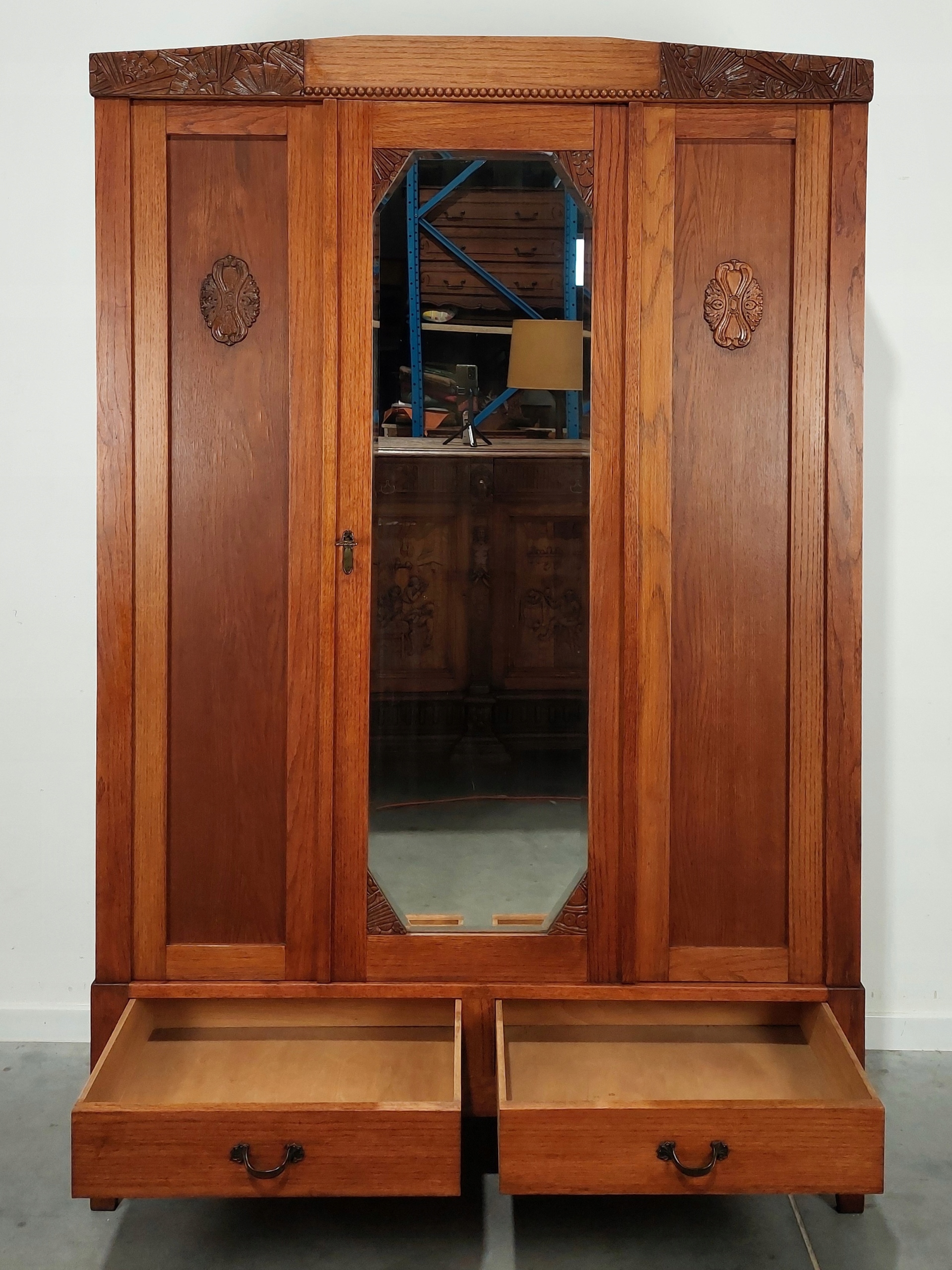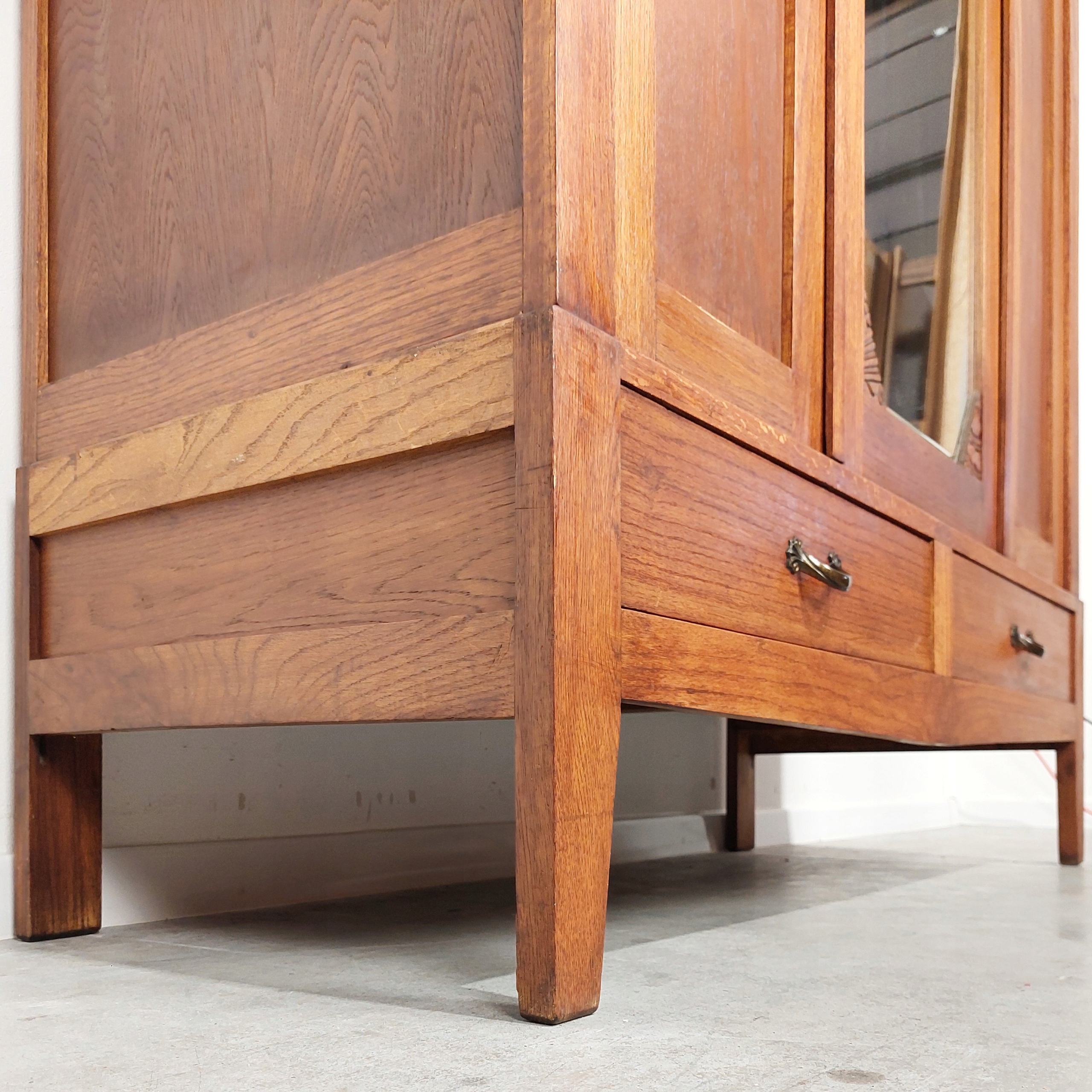 Стильный дубовый двухдверный шкаф, арт-деко. Шкаф привезен из Франции, 1933 года выпуска (подпись на фотографиях). Оригинальное зеркало со скошенной кромкой, в хорошем состоянии, учитывая возраст шкафа. Мебель имеет типичные следы использования, видимые на фотографиях (потертости, царапины). Внутри имеется ободок по всему предмету мебели. Замок в рабочем состоянии, ключ в комплекте. Правая дверная панель фиксированная, левая закрывается на защелку (сверху вниз от середины) и дверца с зеркалом, запираемым на замок. Добавлен Шкаф разбирается для транспортировки. Подробные фото ниже.