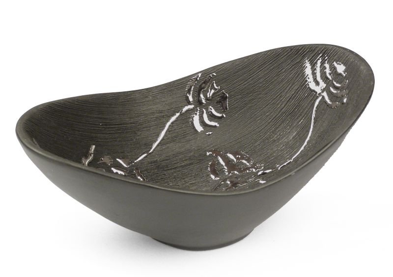 Из благородной керамики. Чеканка и отделка выполнены из гальванически-лакового серебра. Ручное тиснение, шероховатая структура, напоминающая древесную кору. Снизу имеются резиновые накладки, чтобы не царапать поверхность. Прекрасно впишется в любой интерьер.