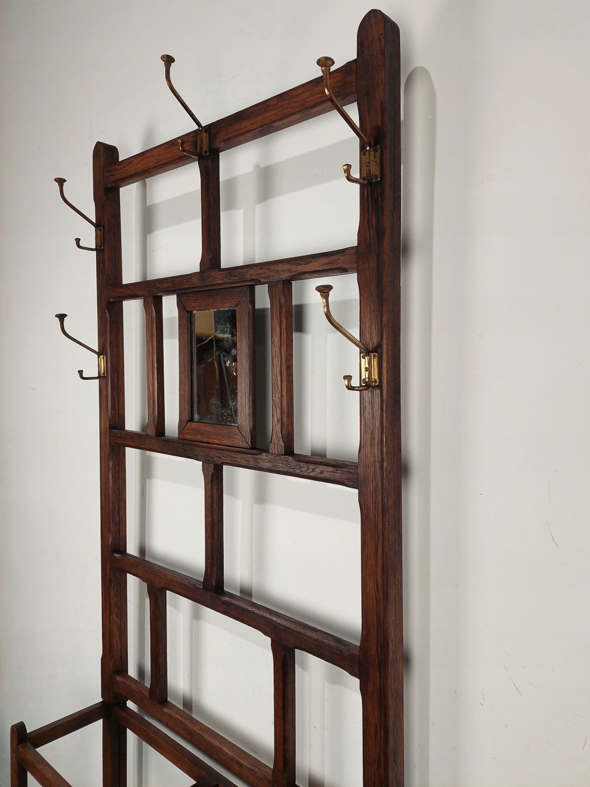 Стильная дубовая настенная вешалка в деревенском стиле. Пригнано из Нидерландов, пять двойных крючков. Хрустальное зеркало, локально оксидированное. Видны типичные следы использования и ремонта, царапины и т. д. Детали указаны на фотографиях.