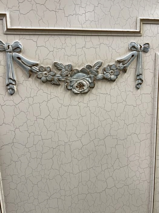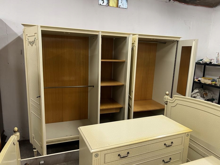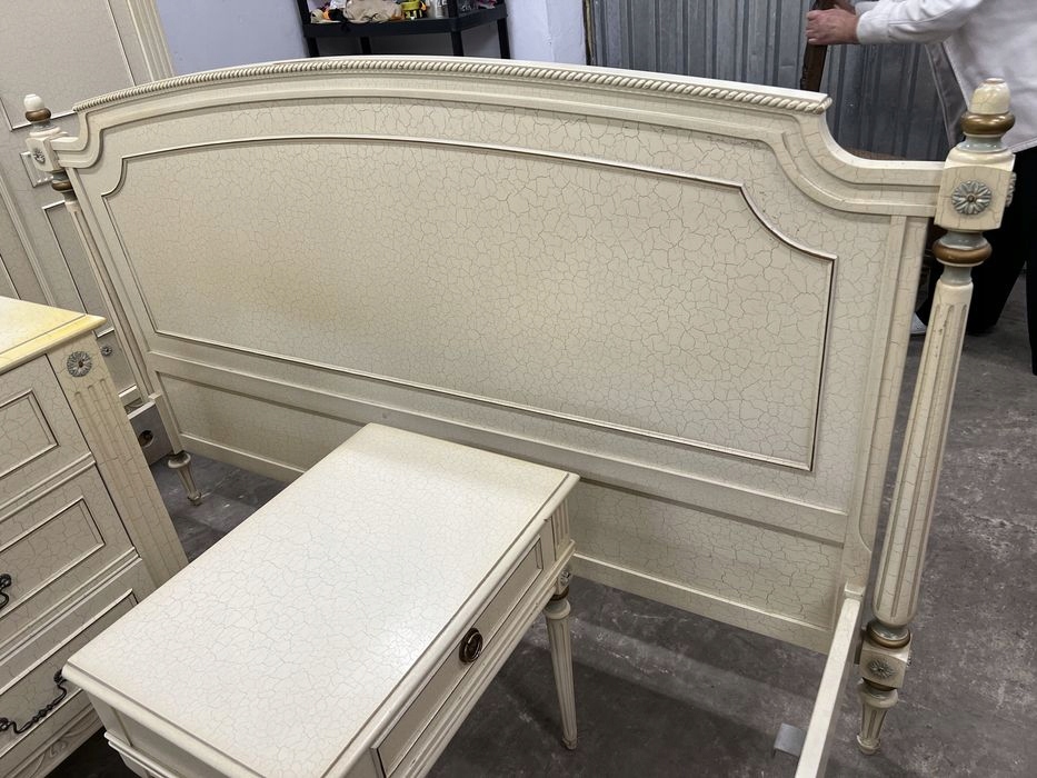 Стильный комплект мебели для спальни цвета экрю, состоящий из шкафа, комода, кровати с каркасом, зеркала и прикроватных тумбочек.