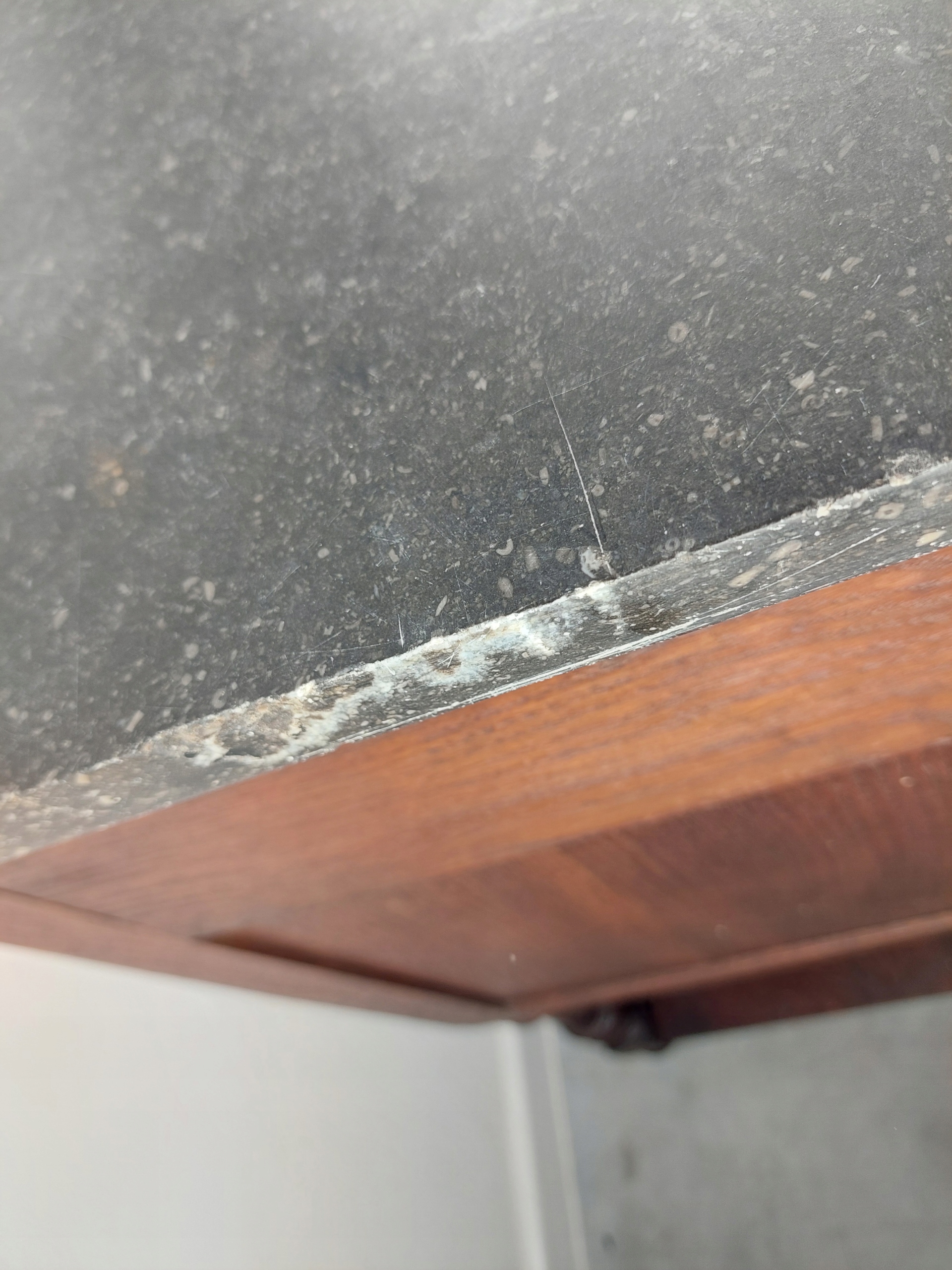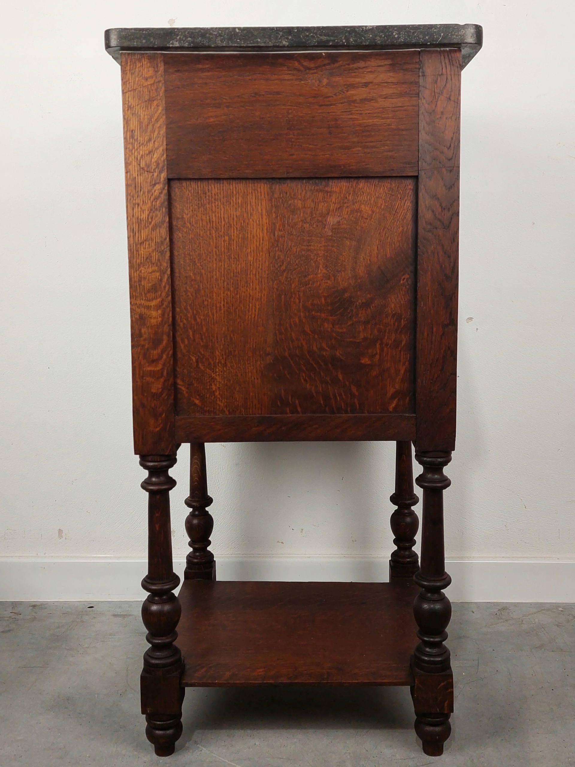 Стильная, эклектичная прикроватная тумбочка из дуба с мраморной столешницей. Из-за возраста мебель имеет следы ремонта и использования, такие как царапины на столешнице или небольшие потертости (ориентировочный возраст от 80 до 100 лет). Столешница из черного мрамора с серыми прожилками, прикреплена навсегда. Подробности показаны на фотографиях ниже.