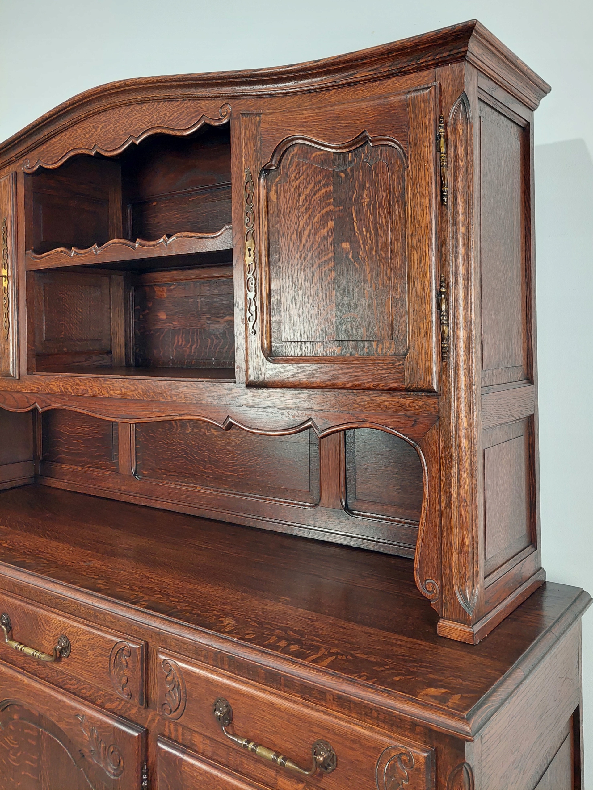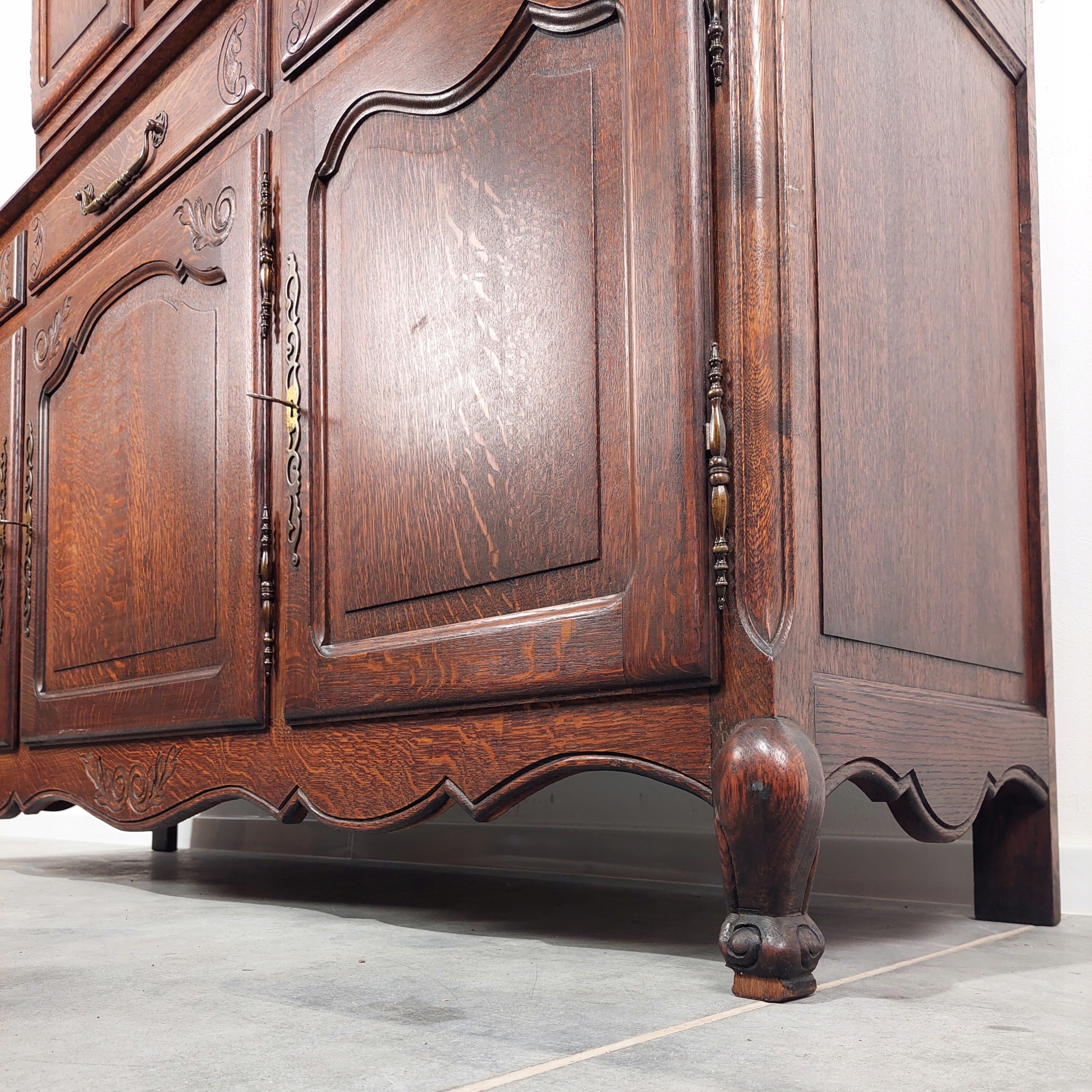 Стильный, красивый буфет из дуба, импортированный из Франции. Буфет в хорошем состоянии. Замки рабочие, в комплекте 4 ключа. На столешнице имеются следы использования, такие как царапины и изменения цвета. Нижняя левая дверь с легкой естественной сушкой. Мебель состоит из двух элементов, регулируемых. Подробные фото ниже.