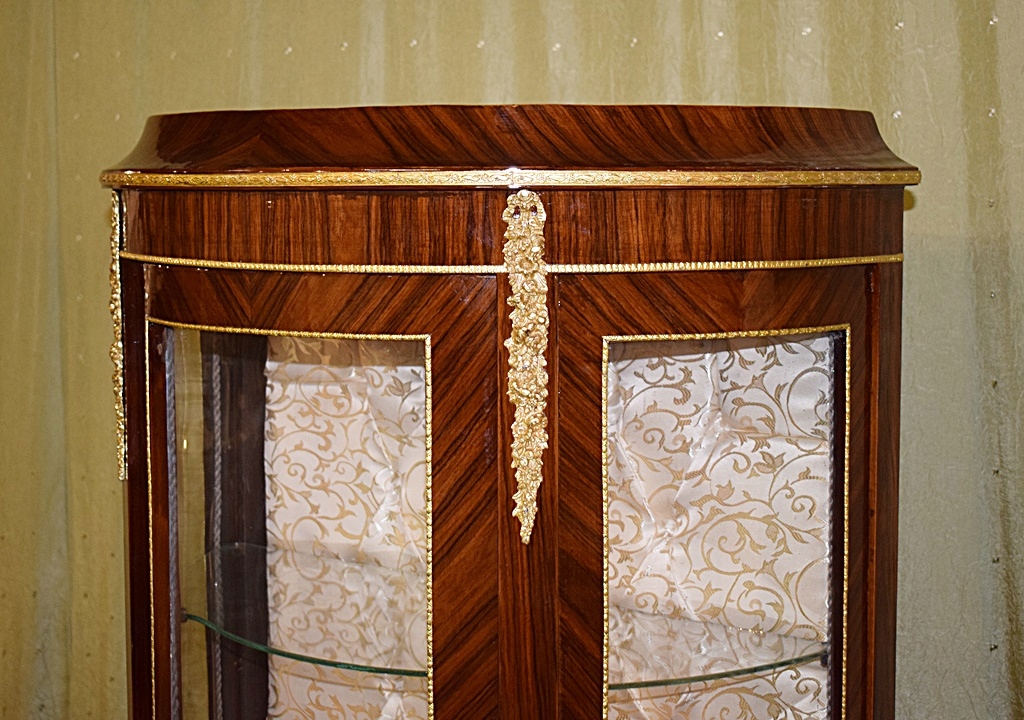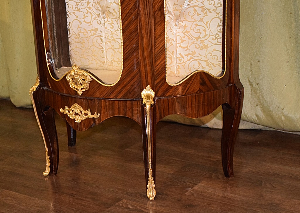 Современный предмет мебели, сохранивший старый дизайн и стиль. Он имеет три стеклянные полки, а задняя часть облицована материалом цвета экрю. Красивые цвета, многочисленные латунные украшения и стройные ножки делают этот предмет мебели чрезвычайно элегантным и изысканным. Шкаф-витрина непременно повысит эстетическую ценность любого помещения.