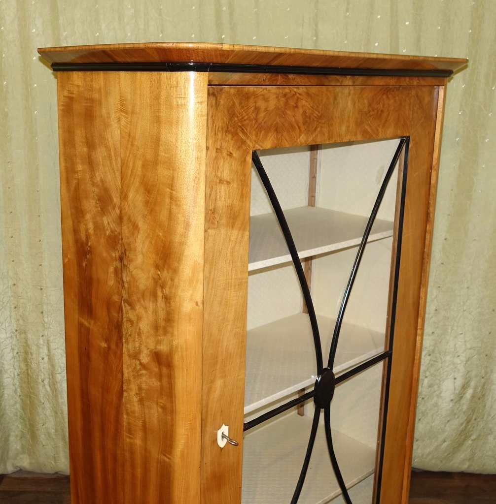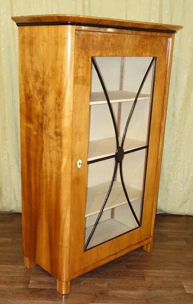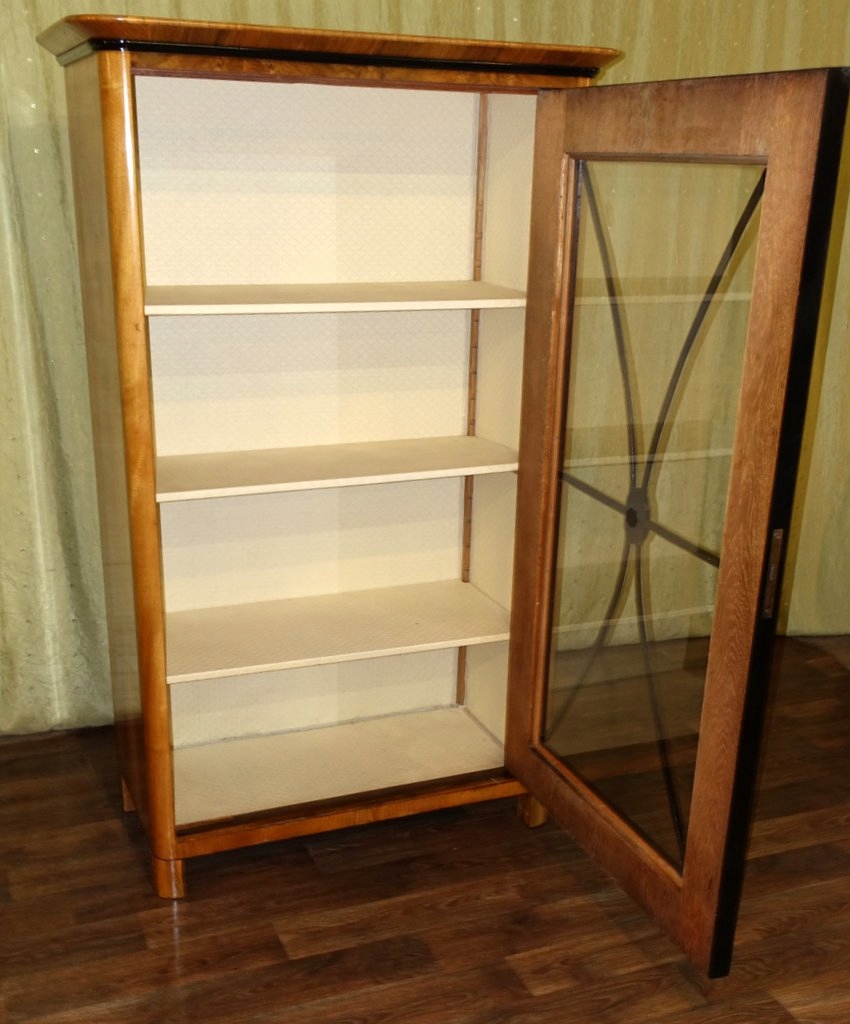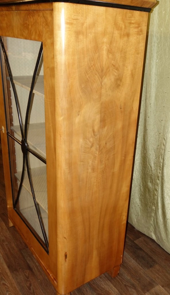 Прекрасная витрина в стиле бидермейер, полностью сделанная из дерева, с чудесным березовым капом, используемым в мебели этого стиля. Предмет мебели старый, около 100 лет, но при этом состояние хорошее. Никаких финансовых затрат он не требует, вы можете поставить его в своей квартире и наслаждаться впечатляющим предметом мебели. Цвет светлый орех с нежными контрастными черными вставками. Полочки, спинка и бока внутри обшиты легким материалом с нежным рисунком. Высота полок регулируется.