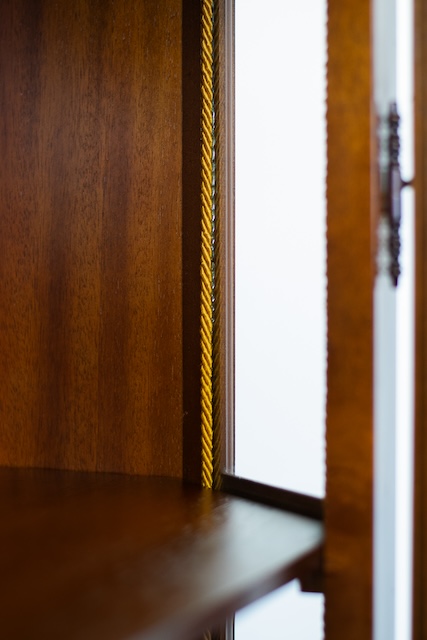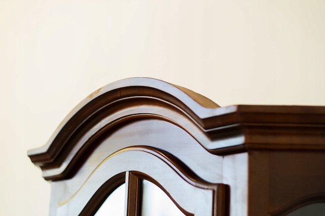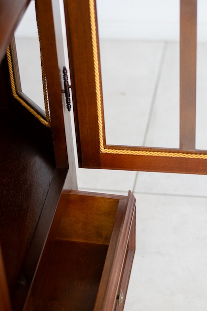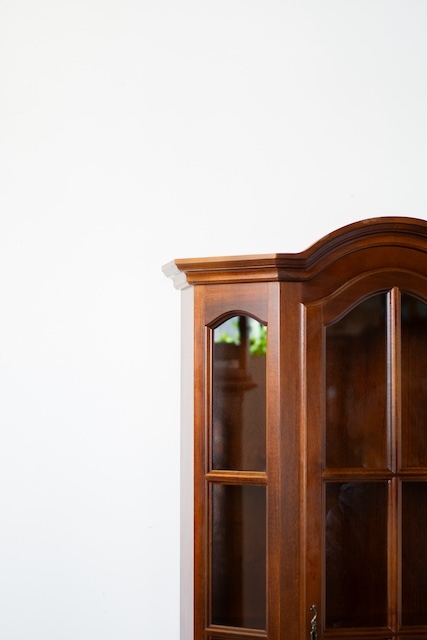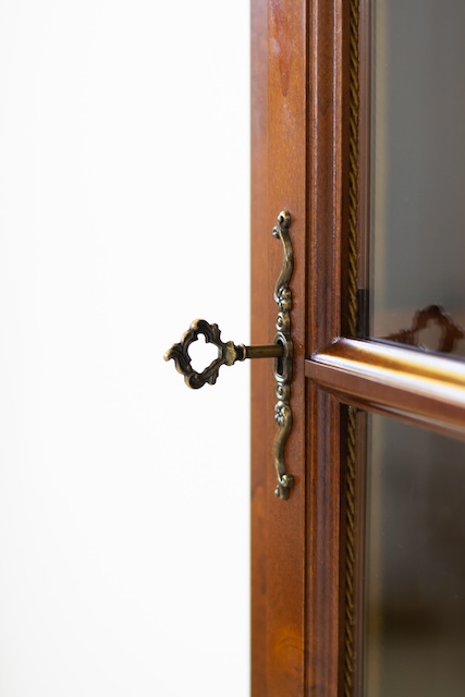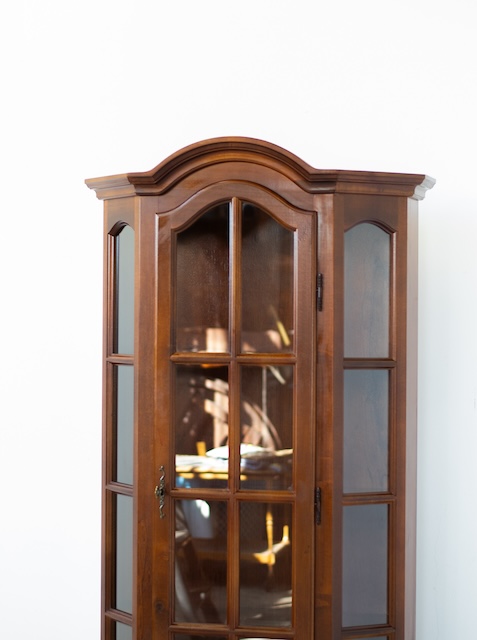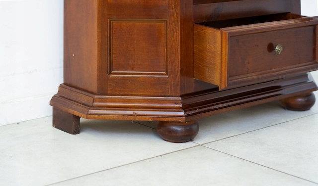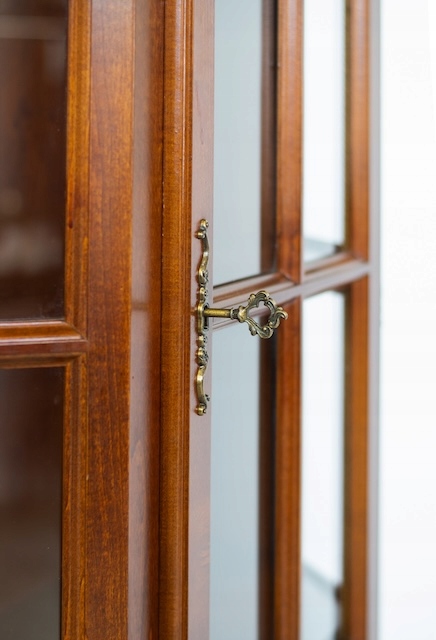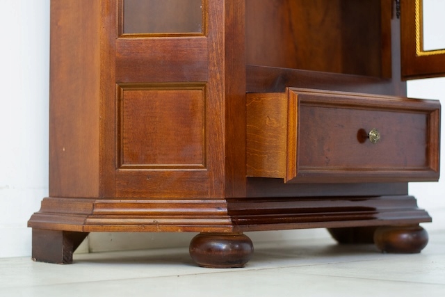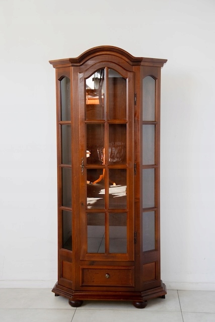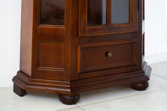 Стильная витрина из массива дерева. Он в хорошем состоянии. Внутри четыре деревянные полки. Внизу есть небольшой ящик. Повреждений и дефектов нет. Она хорошо сохранилась. Имеет характерные следы использования. Замок функциональный, в комплекте есть ключ. Он готов к вставке.