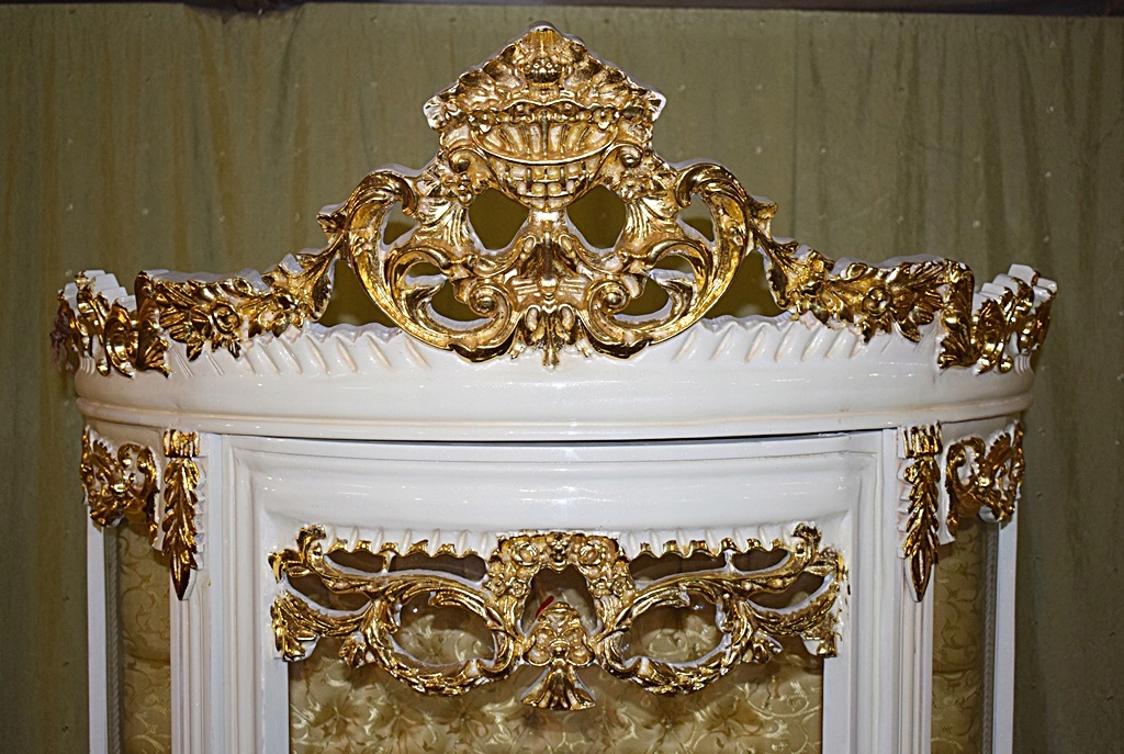 Предмет мебели выполнен в современном стиле, сохраняя при этом старый дизайн и стиль, поэтому он выглядит старинным и историческим. Имеет три стеклянные полки. Спинка отделана со вкусом стеганым золотистым материалом, а нижняя часть украшена зеркалом. Витрина застеклена с трех сторон и увенчана очень декоративной скульптурой. Цвет мебели экрю с золотым декором.
