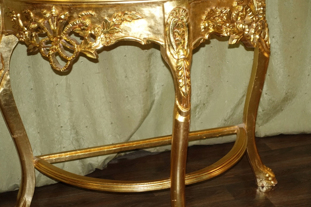 Предмет мебели восхищает своей уникальностью. Он новый и сделан из дерева, чтобы выглядеть как старый, исторический. Зеркало с изысканной резьбой. Стол из серого мрамора. Дерево цвета античного золота. Консоль стоит на стильно изогнутых ножках, отделанных так называемой львиная лапа. Все это создает неразрывную гармонию.
