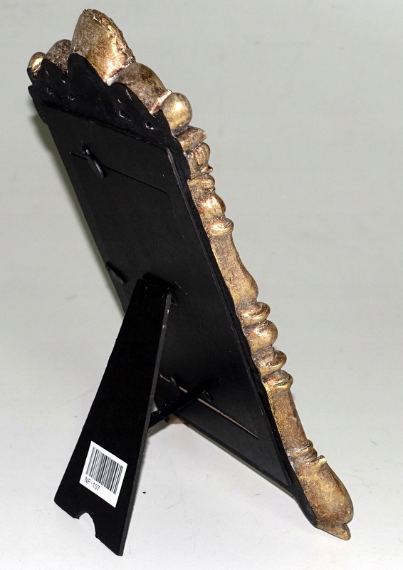 Привлекательная фоторамка. Современник из смолы золотистого цвета, украшенный чудесным декором. Благодаря чудесной форме размещенная в ней фотография выглядит элегантно, и вся эта вещь непременно станет украшением вашего дома или отличным подарком на случай. Рамка сзади оснащена опорой.