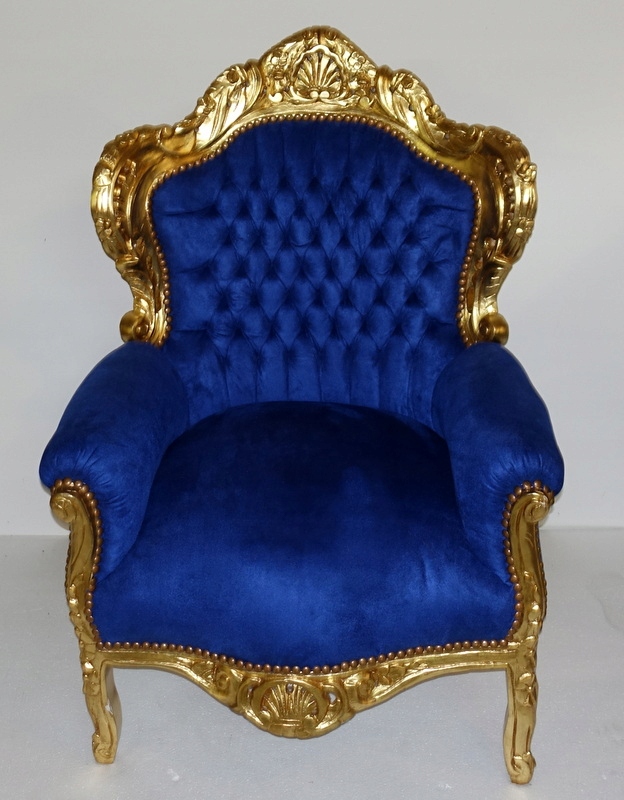 Кресло барокко, деревянная конструкция, как и подобает этому стилю, богато украшена резьбой по золоту. Обивка из синего плюша; спинка со вкусом простегана, и все это эстетично отделано булавкой.