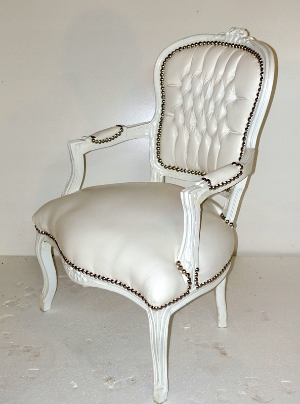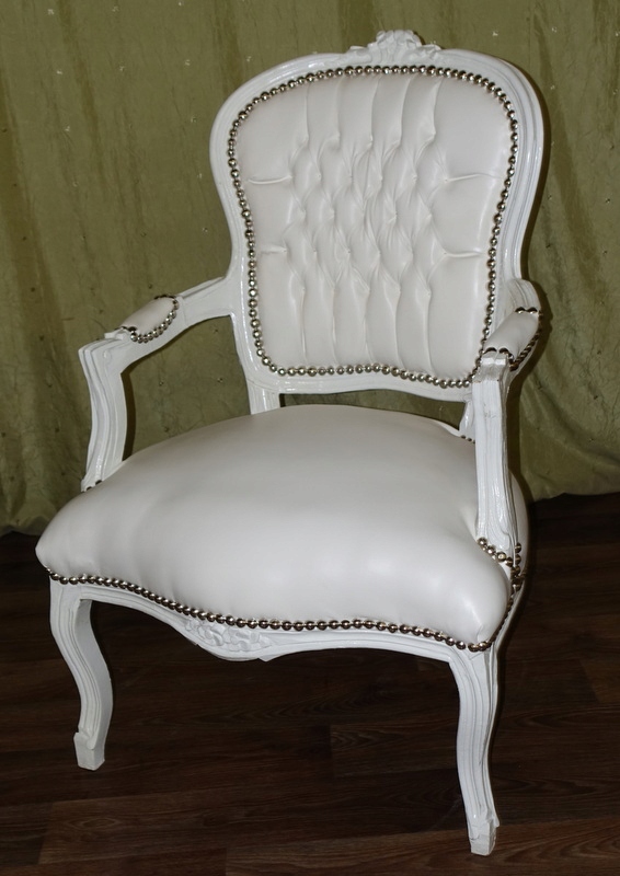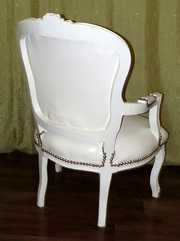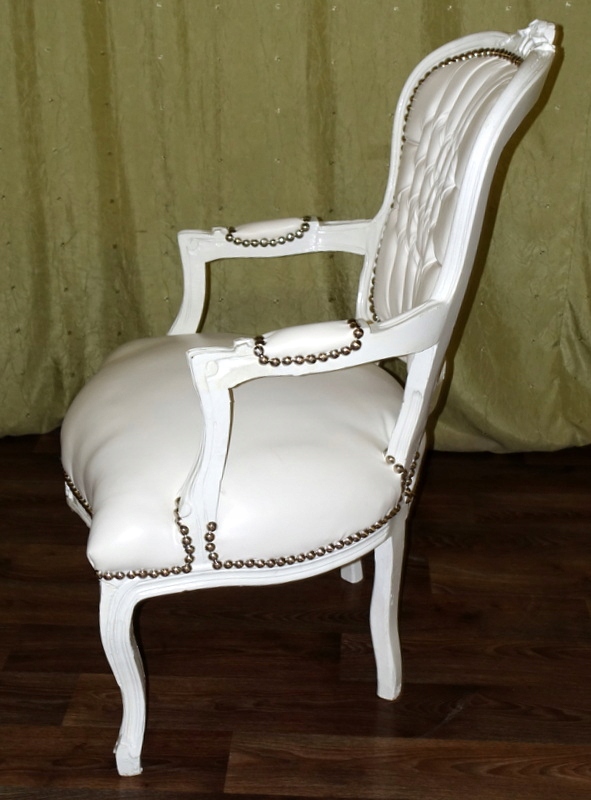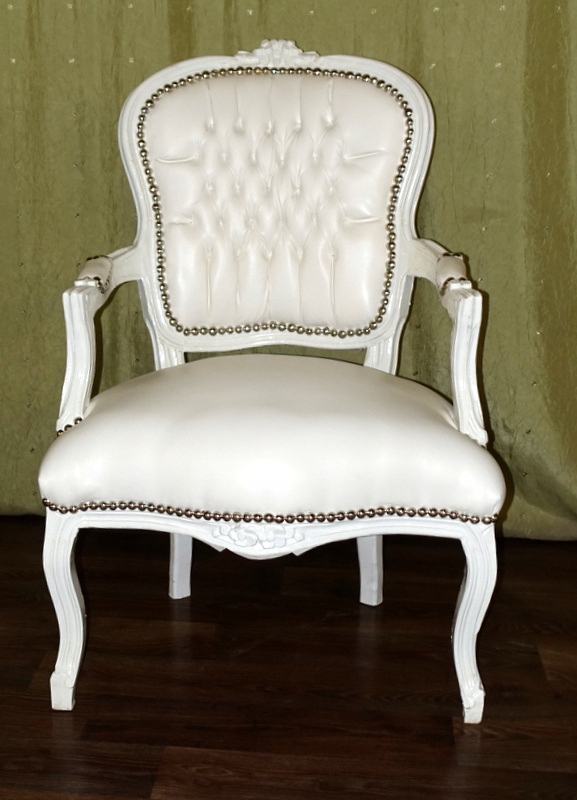 Деревянная конструкция с изящной резьбой белого цвета. Обивка выполнена из экологической кожи, также белого цвета, соединение структуры и материала завершается эстетичной декоративной никелированной булавкой. Предмет мебели, сделанный сегодня так, чтобы выглядеть как старинный антикварный предмет.