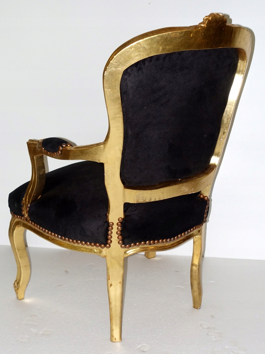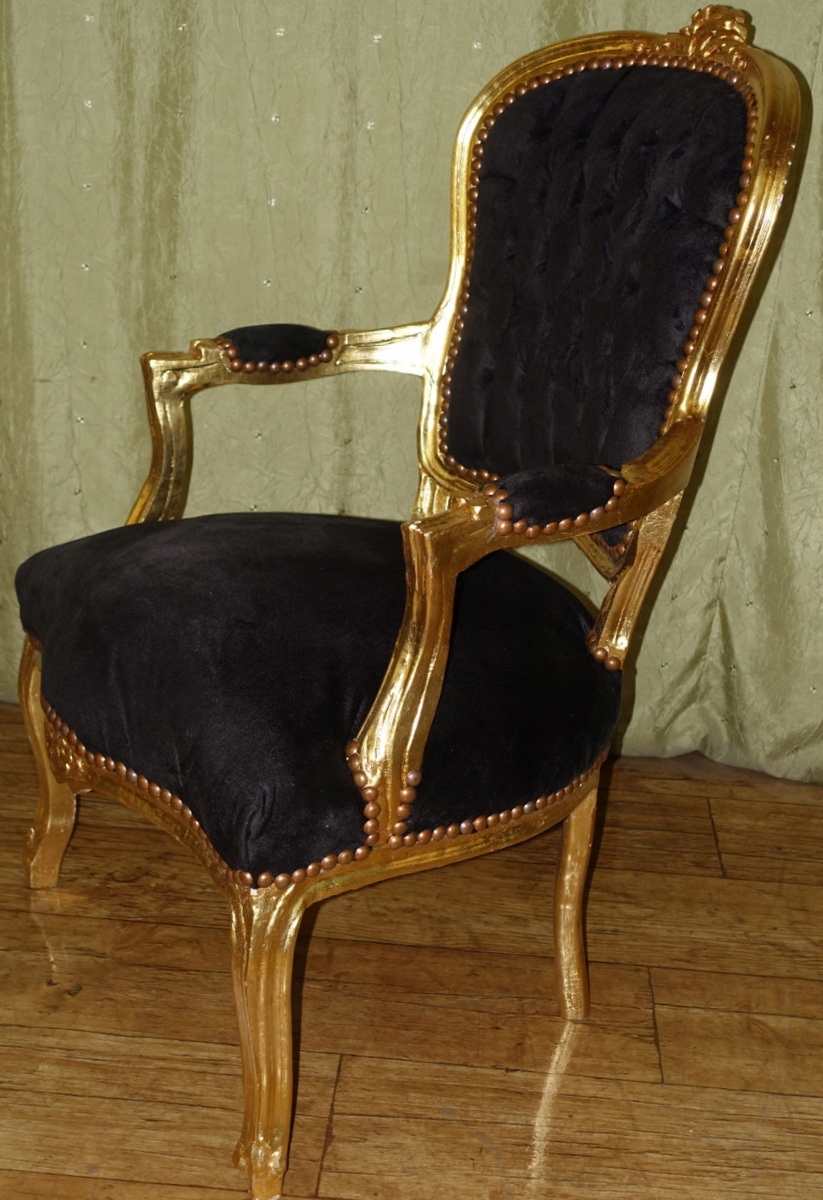 Деревянная конструкция с изящной резьбой цвета старого золота. Обивка выполнена из плюша черного цвета, спинка со вкусом простегана, а соединение между структурой и материалом завершается эстетичной декоративной латунной булавкой. Предмет мебели, сделанный сегодня так, чтобы выглядеть как старинный антикварный предмет.
