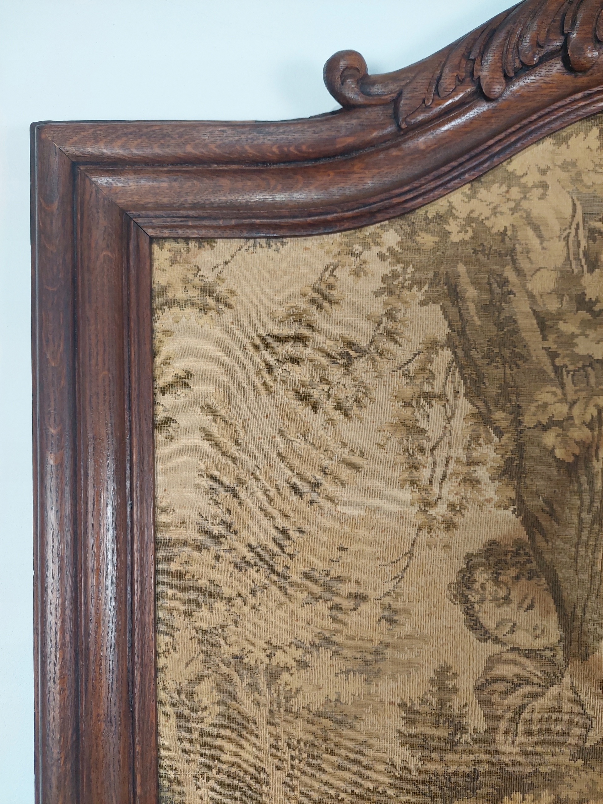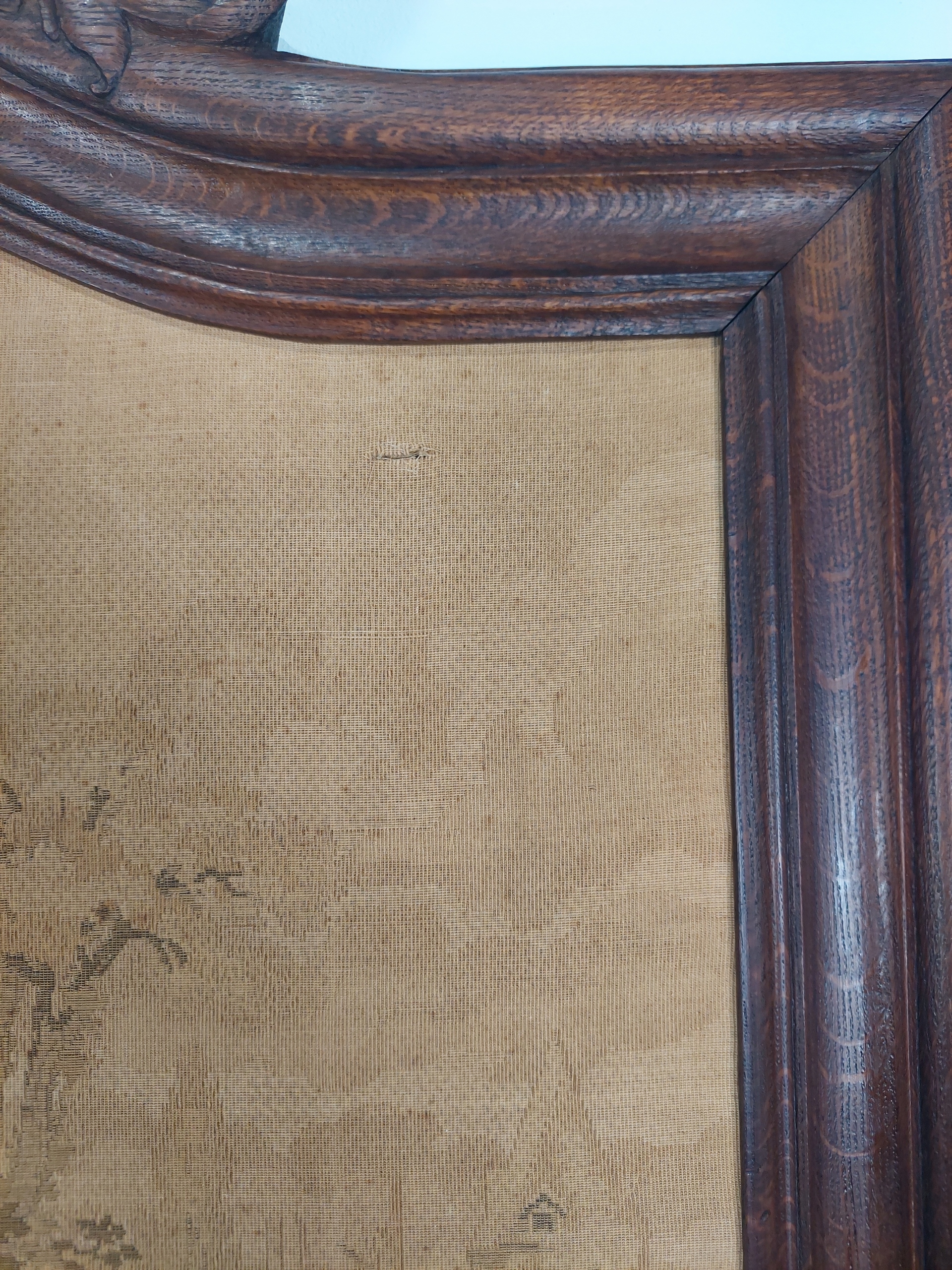Стильное, уникальное зеркало в стиле рококо с красивым гобеленом ручной работы и резным наконечником вверху. Датировка (подпись видна на фотографиях) 7.7 1914 г. Хрусталь скошенный, стекло в хорошем состоянии, есть дефекты, связанные с возрастом. Возможны следы ремонта/использования. Подробности показаны на фотографиях ниже.