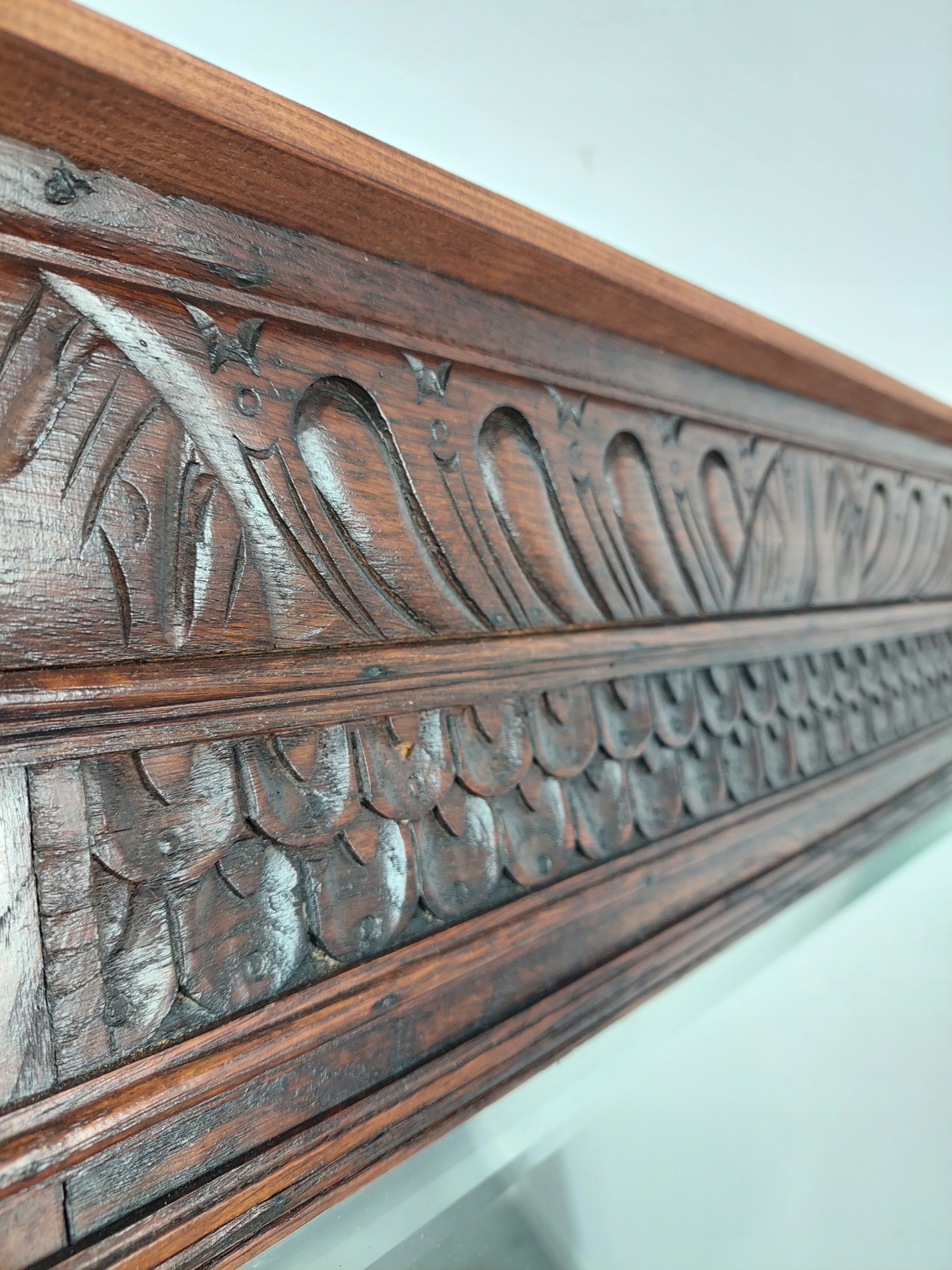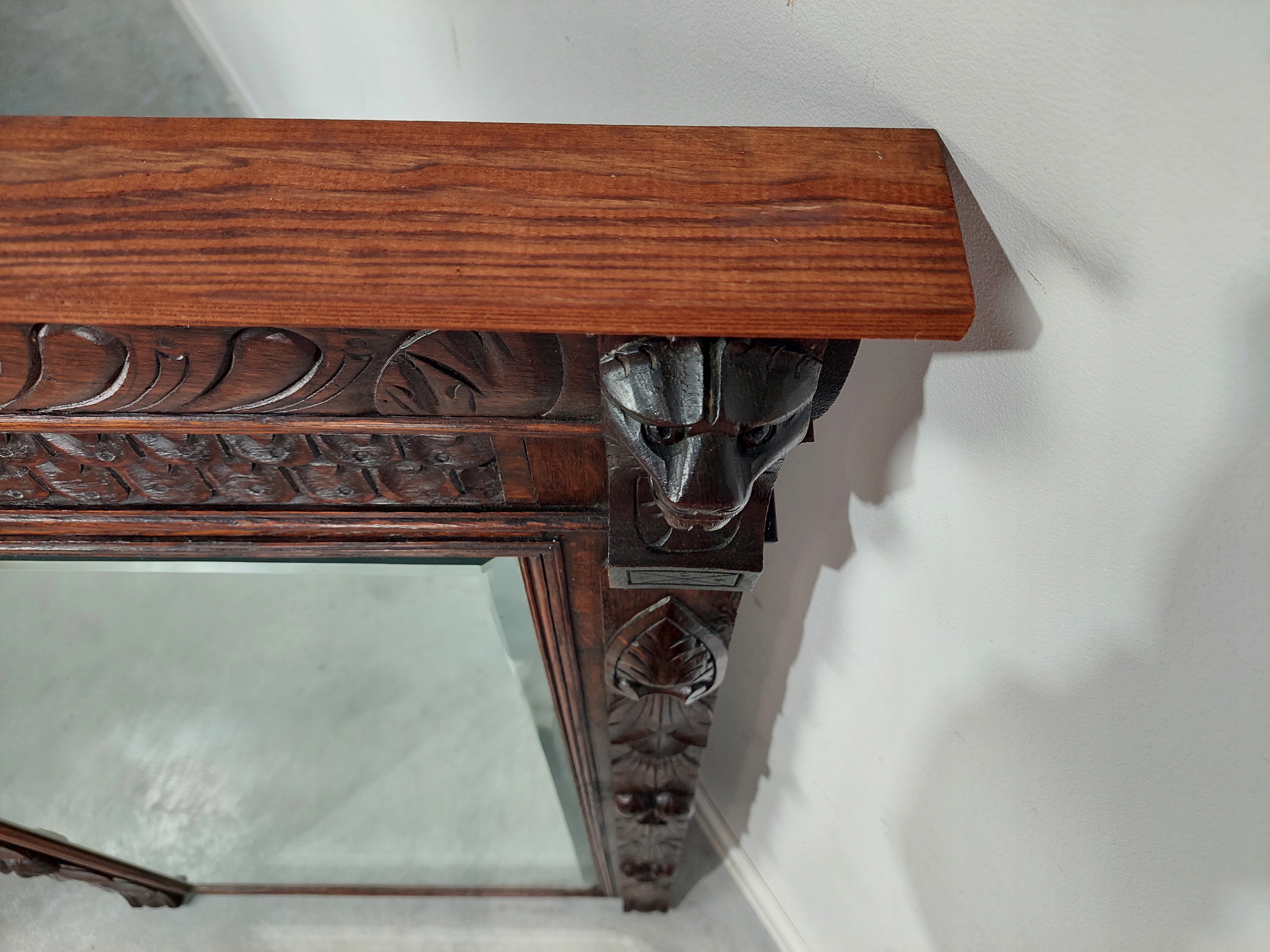 Стильное, большое, эклектичное зеркало в резной дубовой раме. Хрустальное зеркало со скошенной кромкой, поверхность в хорошем состоянии, незначительные царапины (возраст зеркала оценивается в 1920/1930 гг.). Из-за возраста на мебели имеются следы эксплуатации и ремонта. Подробности показаны на фотографиях ниже.